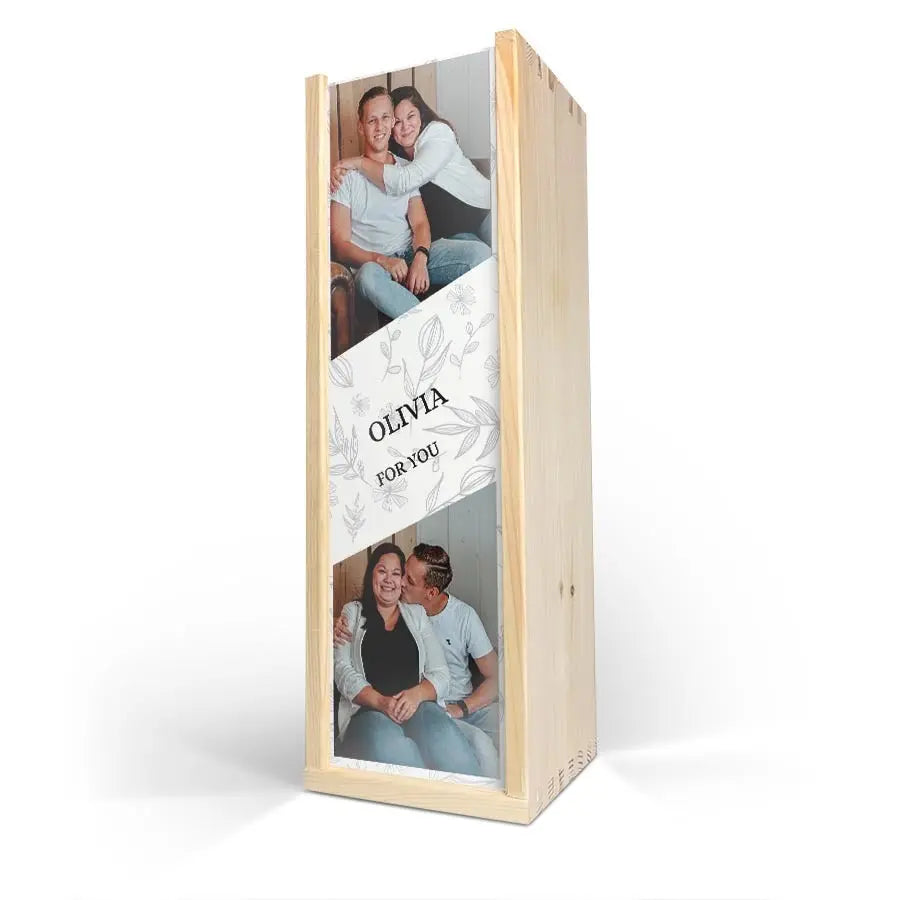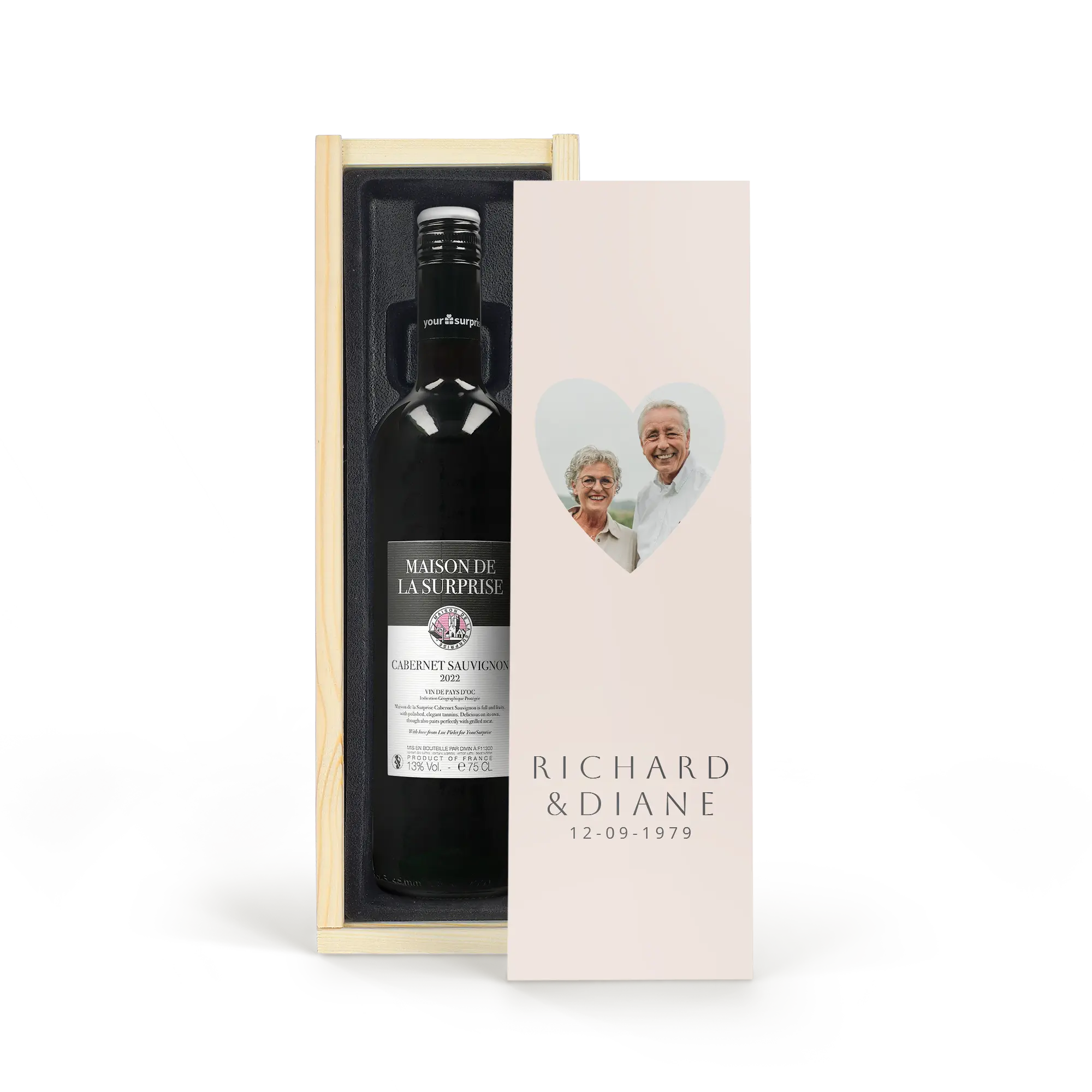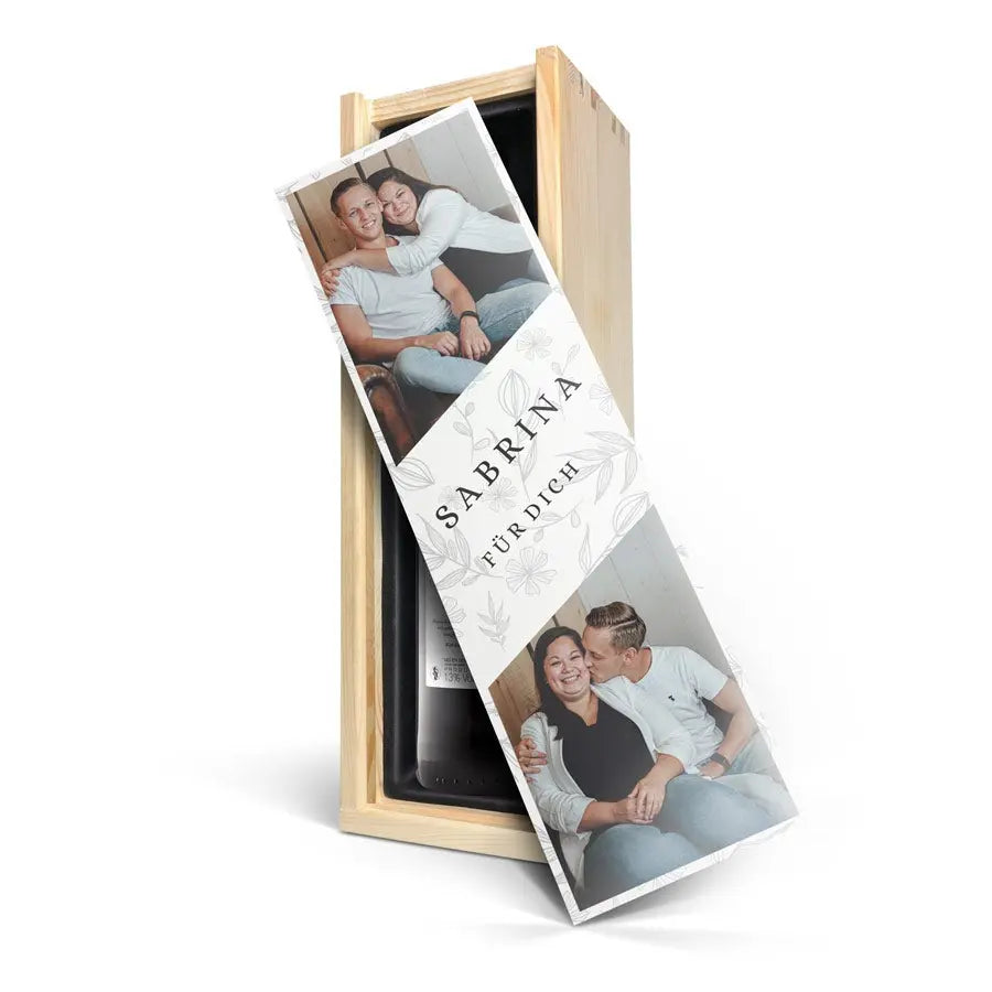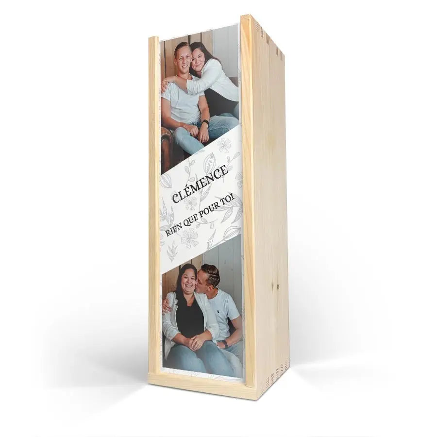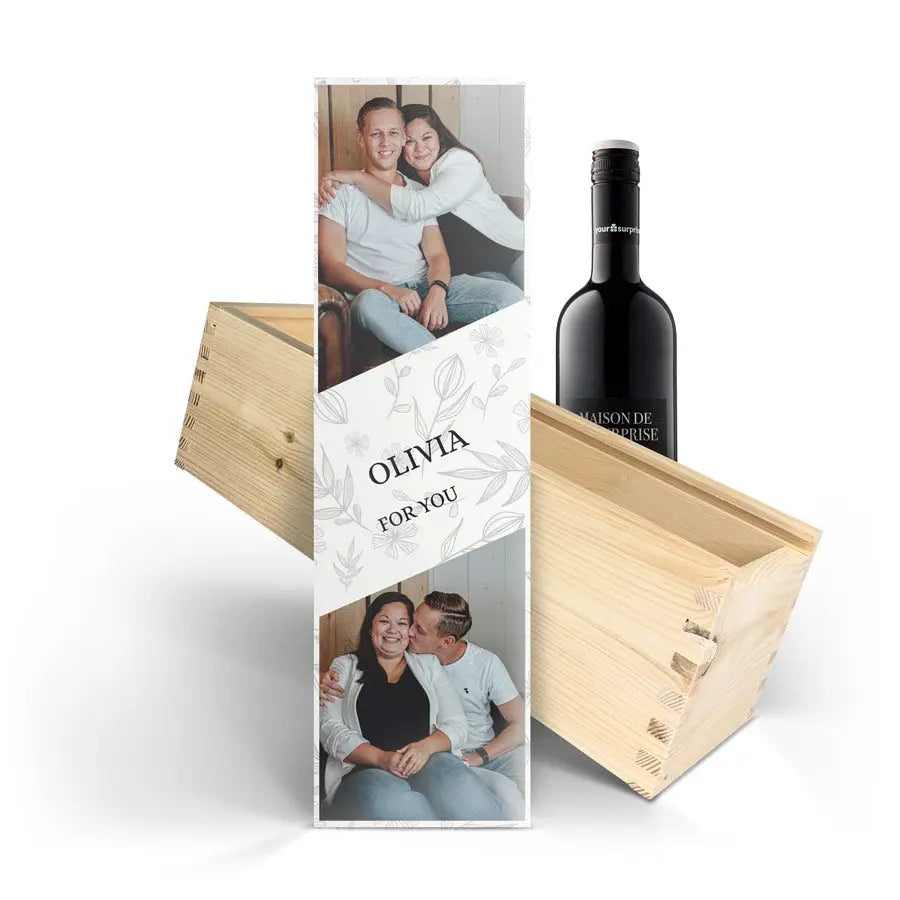 Délicieux vin Maison de la Surprise dans un coffret bois de luxe orné de la photo, du logo et/ou du texte de votre choix. Créez le vôtre dès maintenant !