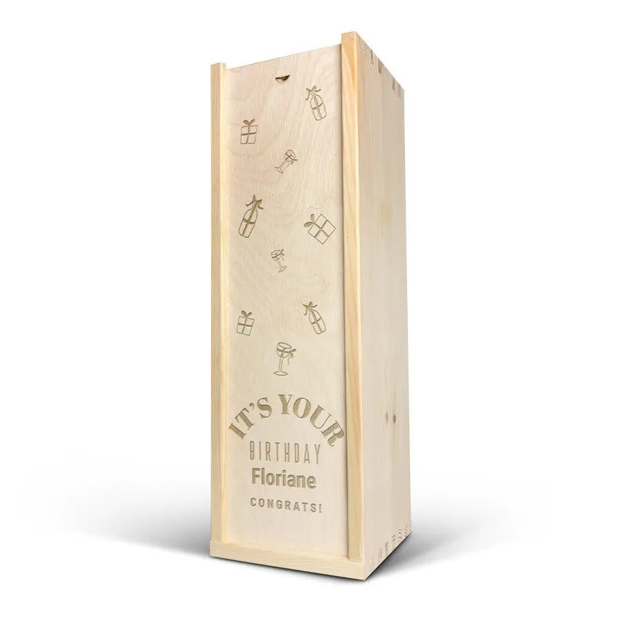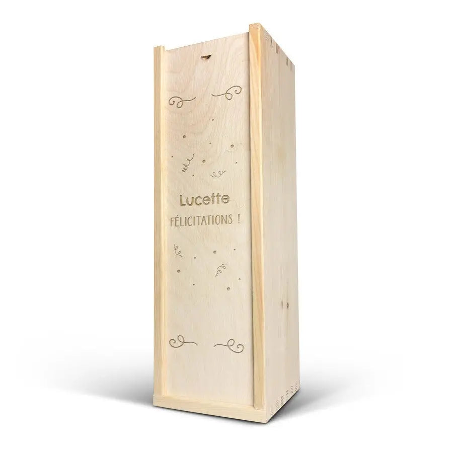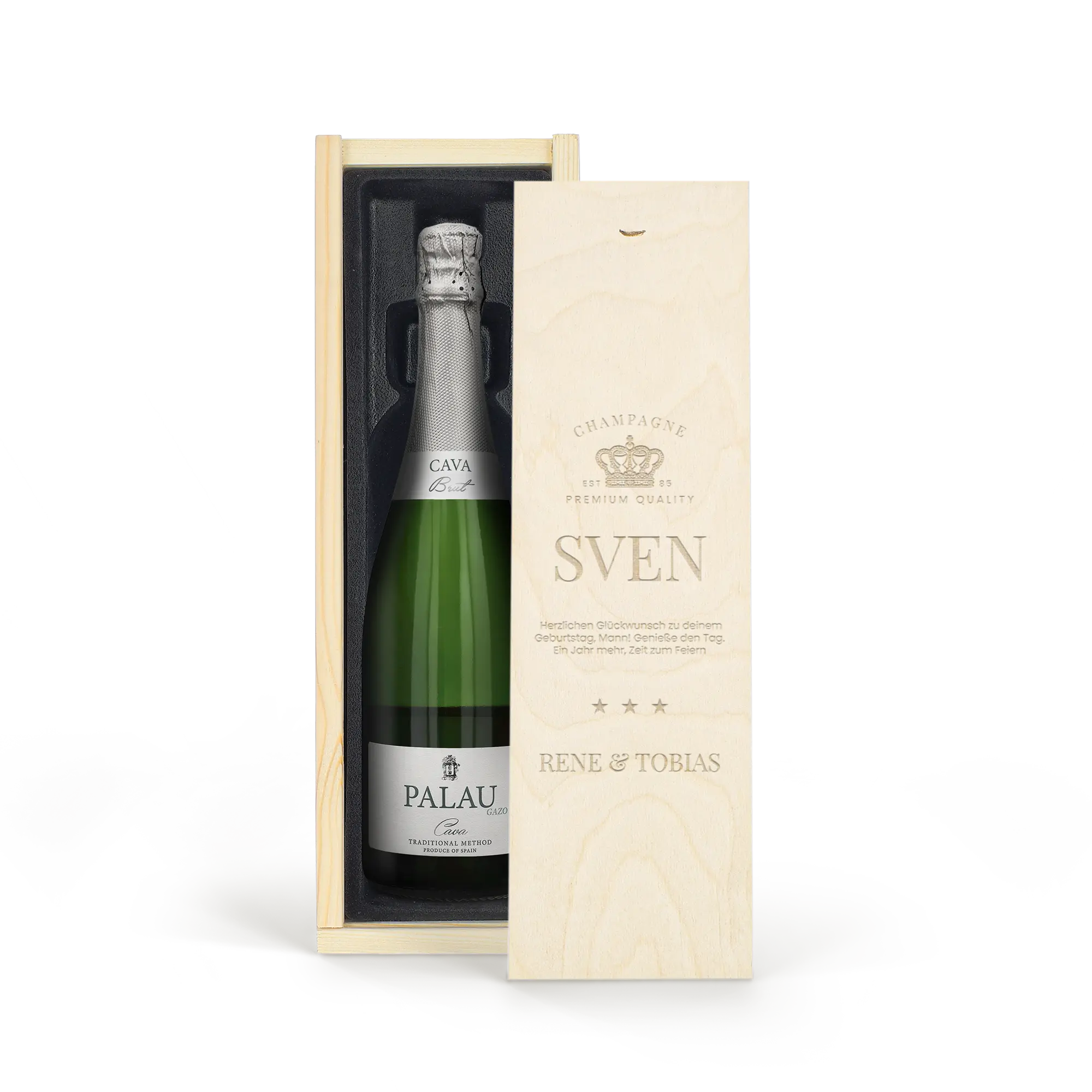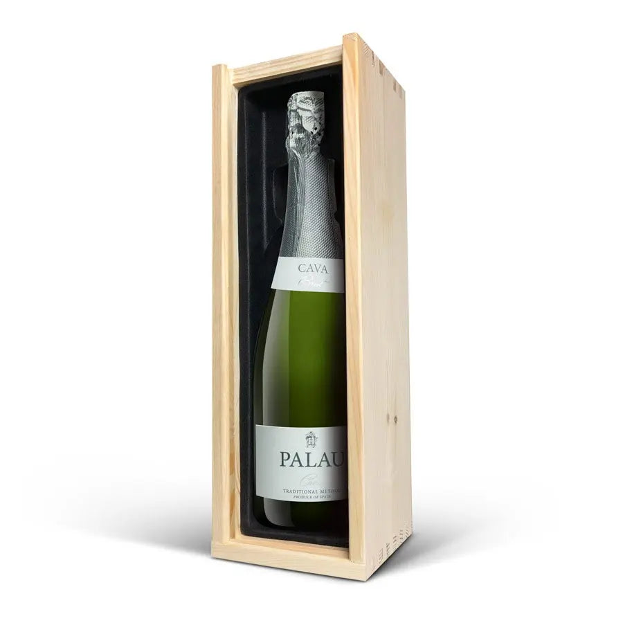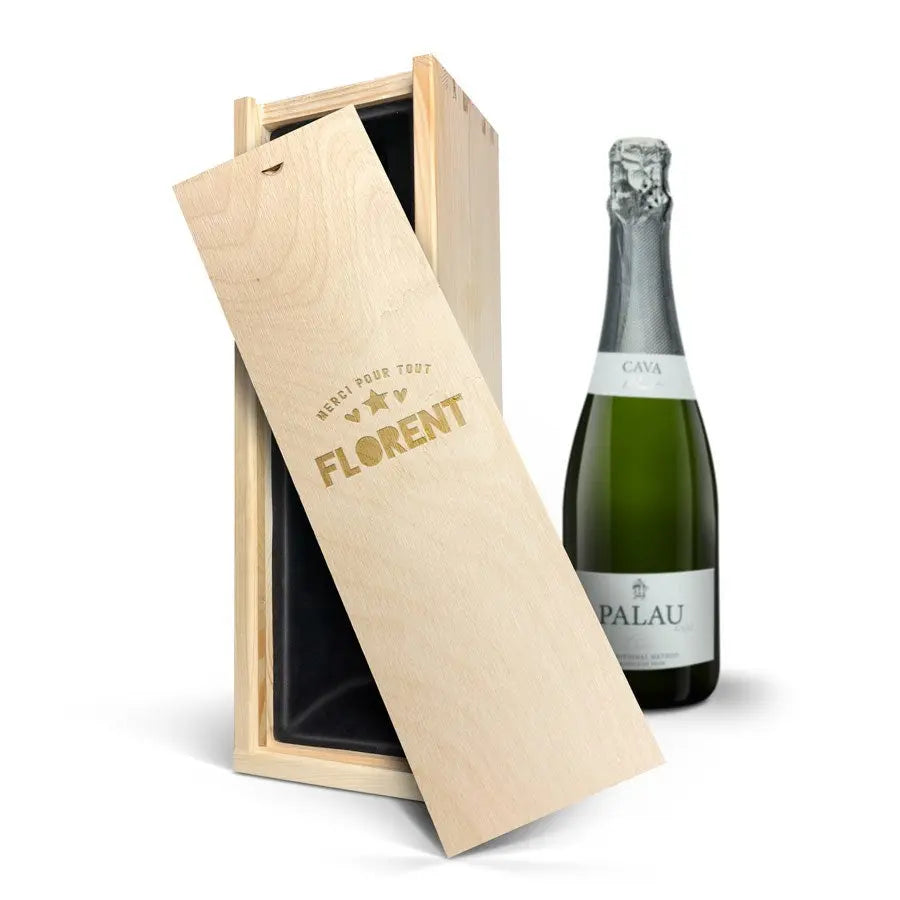 Une délicieuse bouteille de vin mousseux Cava Palau Gazo dans un coffret gravé. Personnalisez-la à votre guise avec votre texte et un design unique !