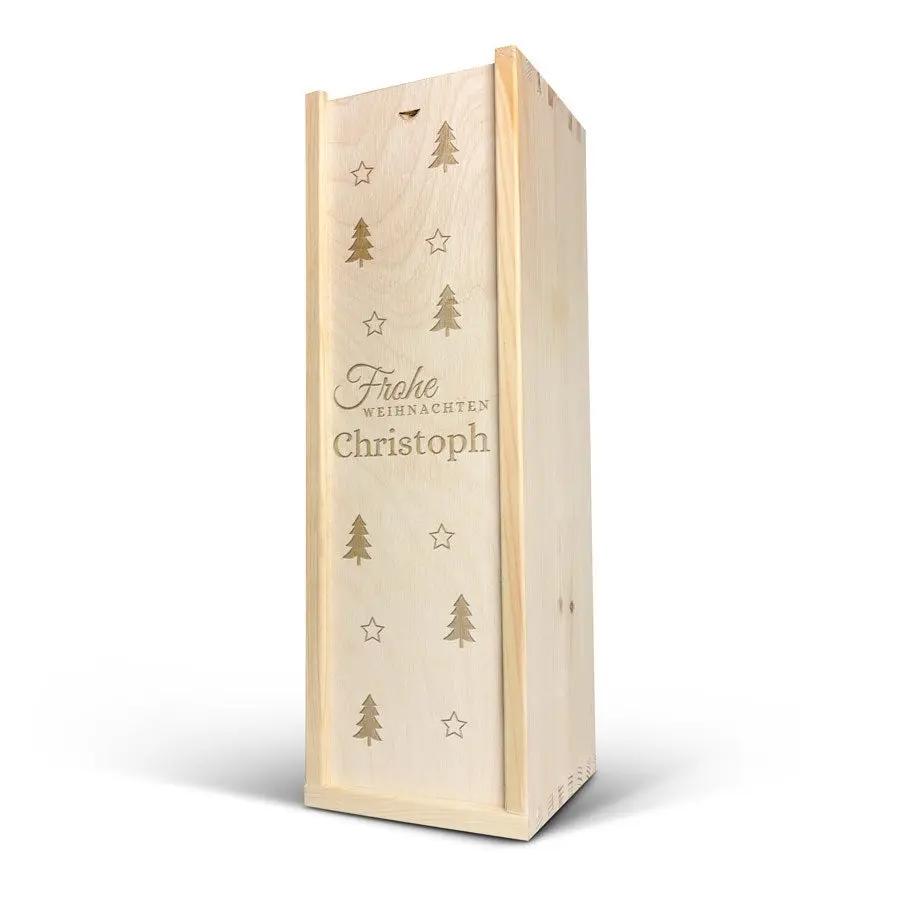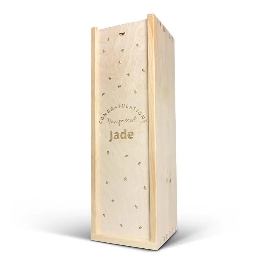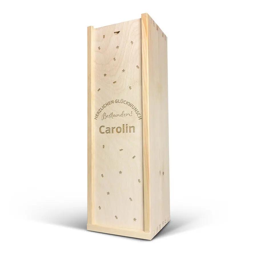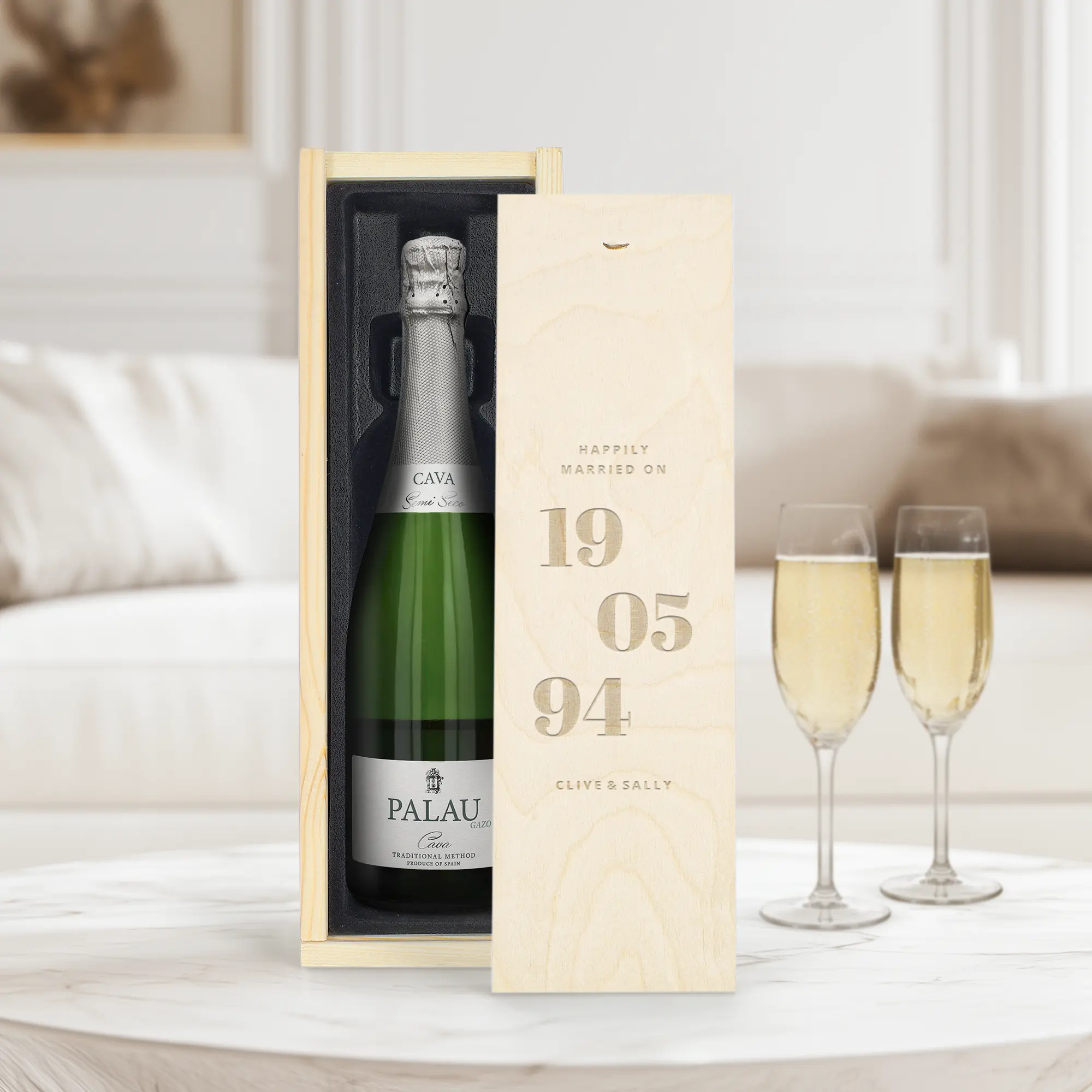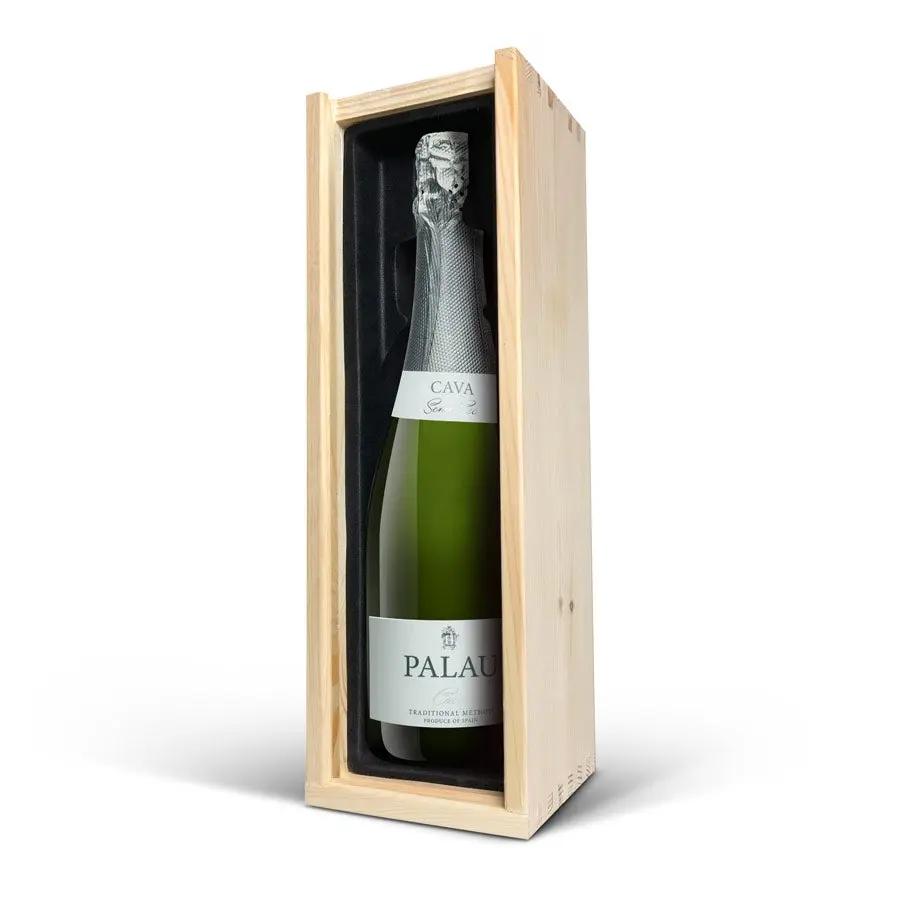 Une délicieuse bouteille de cava Palau Semi-Seco dans un luxueux coffret en bois gravé de votre nom et/ou texte. Cadeau original !