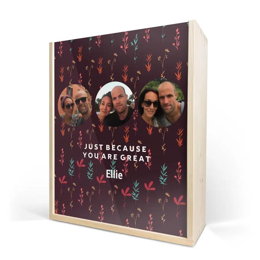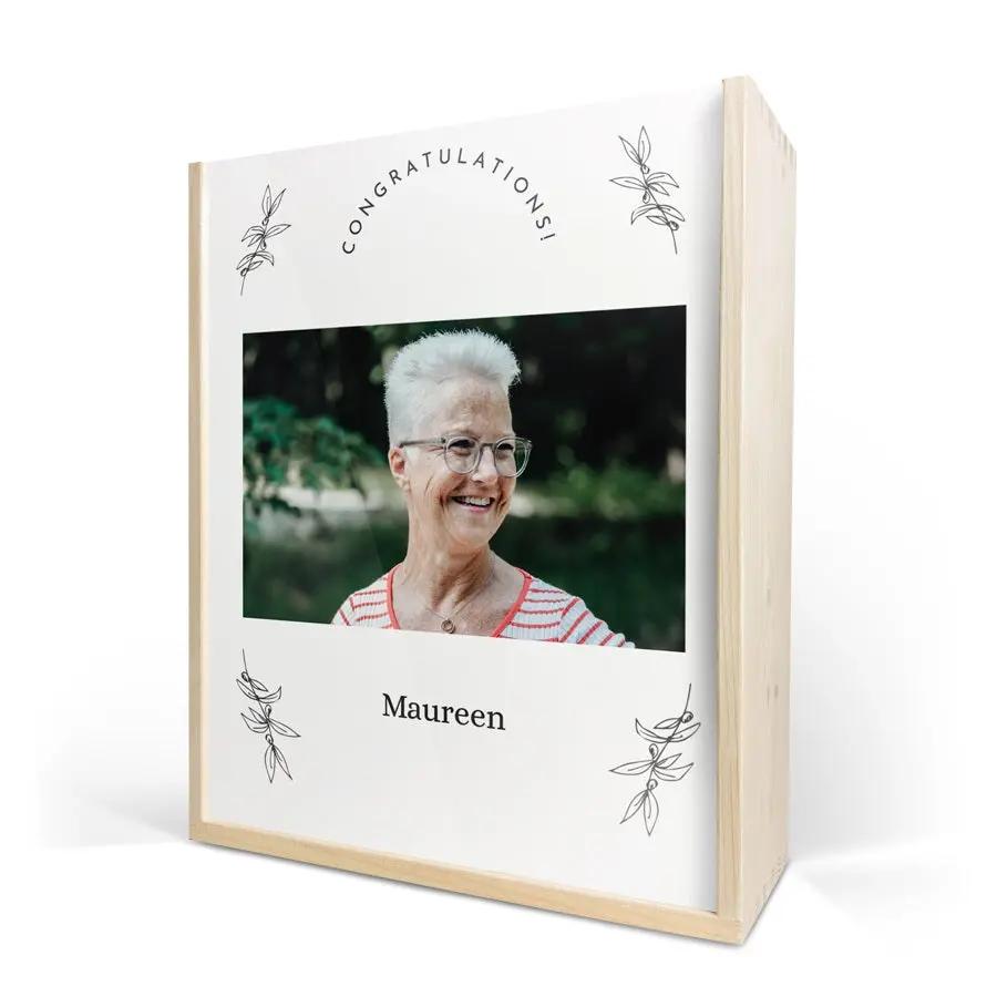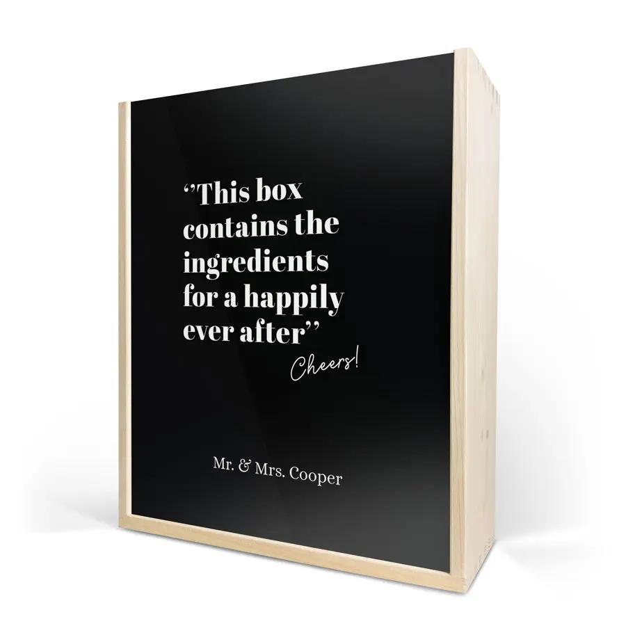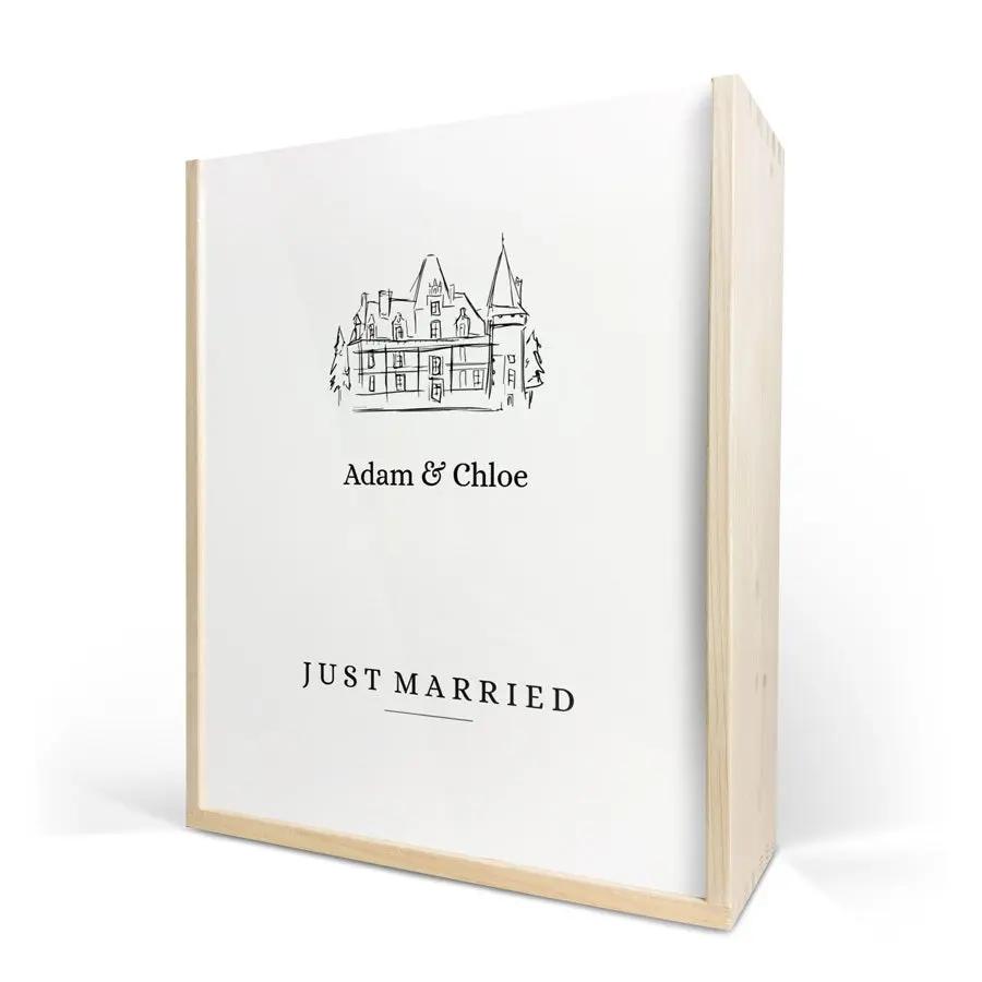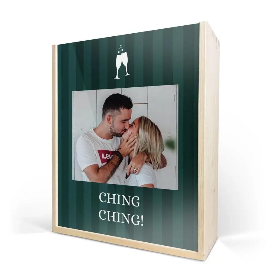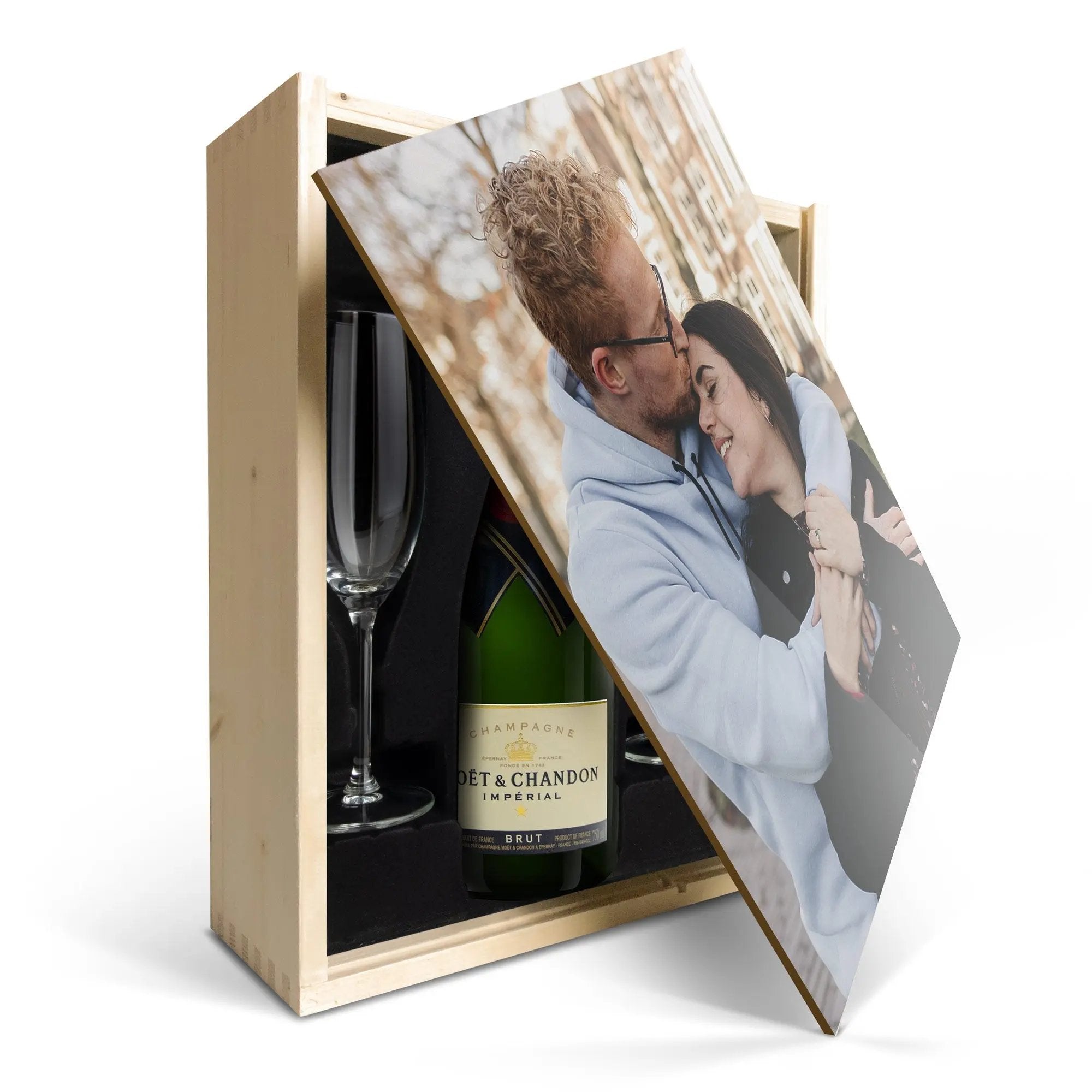 Une exquise bouteille de champagne Moët & Chandon avec deux coupes. Présentée dans un luxueux coffret en bois personnalisé, avec votre design. Santé !