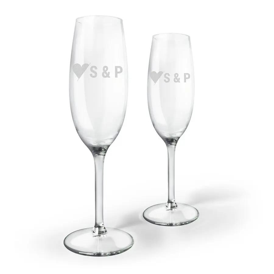 Plus d'informations sur les verres à champagne :Quantité : 2 verresMarque : Royal LeerdamType : L'EspritHauteur : 21,5 cmContenance : 21 clPersonnalisation : avec nom et/ou texte. Chaque verre peut être personnalisé individuellement.Emplacement de personnalisation : sur un côté de chaque verreMéthode de personnalisation : gravure laser de haute qualitéPlus d'informations sur le luxueux coffret en bois :Dimensions du coffret (extérieur) : 36,5 x 30 x 11 cmDimensions du coffret (intérieur) : 34 x 27,5 x 9 cmDimensions du couvercle : 35,6 x 28,4 x 0,3 cmLe coffret en bois est fabriqué avec du bois certifié FSC.Plus d'informations sur le vin :Marque : Riondo Prosecco SpumanteType : prosecco, extra dryContenu : 750 mlPays d'origine : ItalieCépage : chardonnay, gleraCaractère : Le Riondo Prosecco Spumante a des arômes de poire, de pomme, de bonbons et de fleurs blanches. Se marie bien avec les crevettes et les tapas salées.