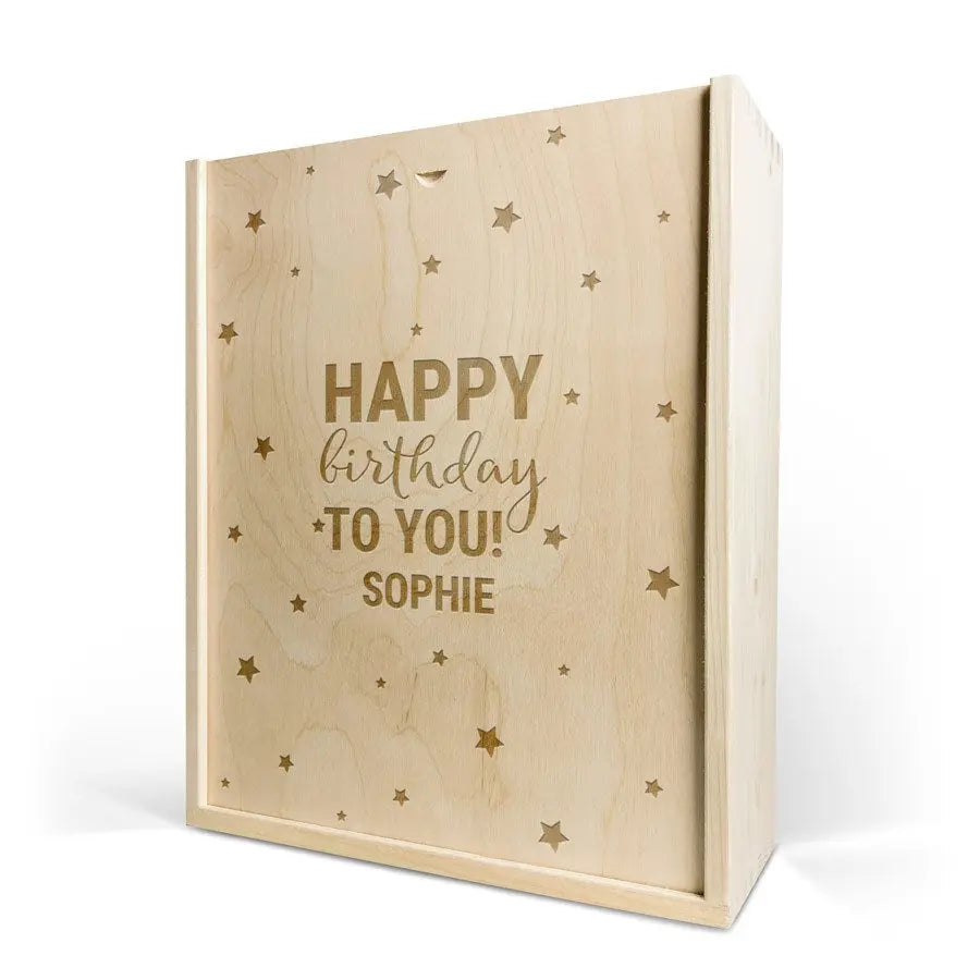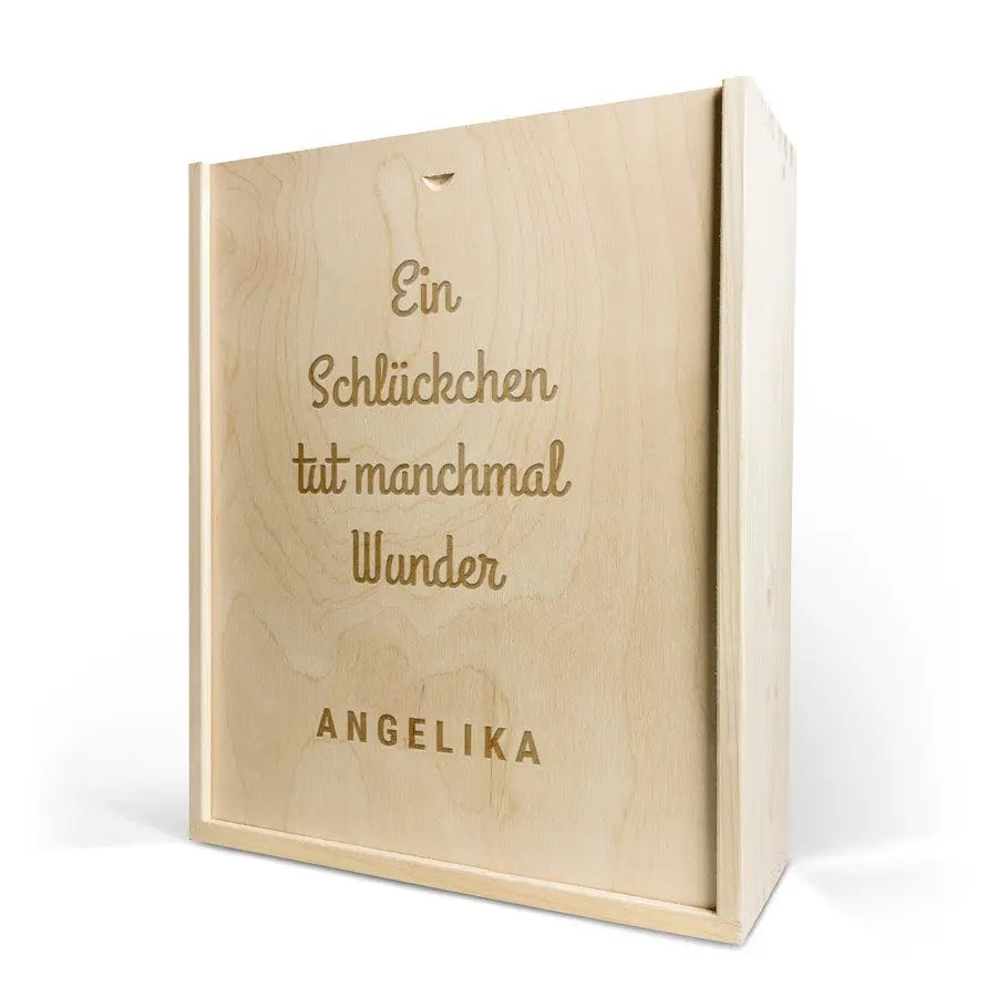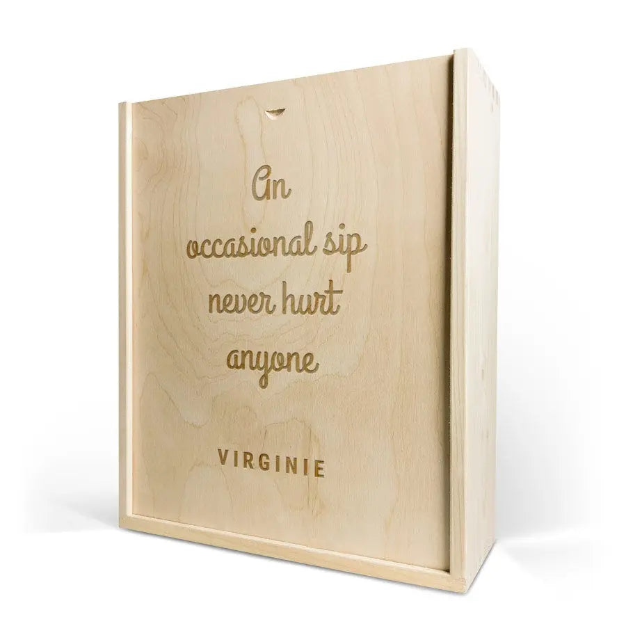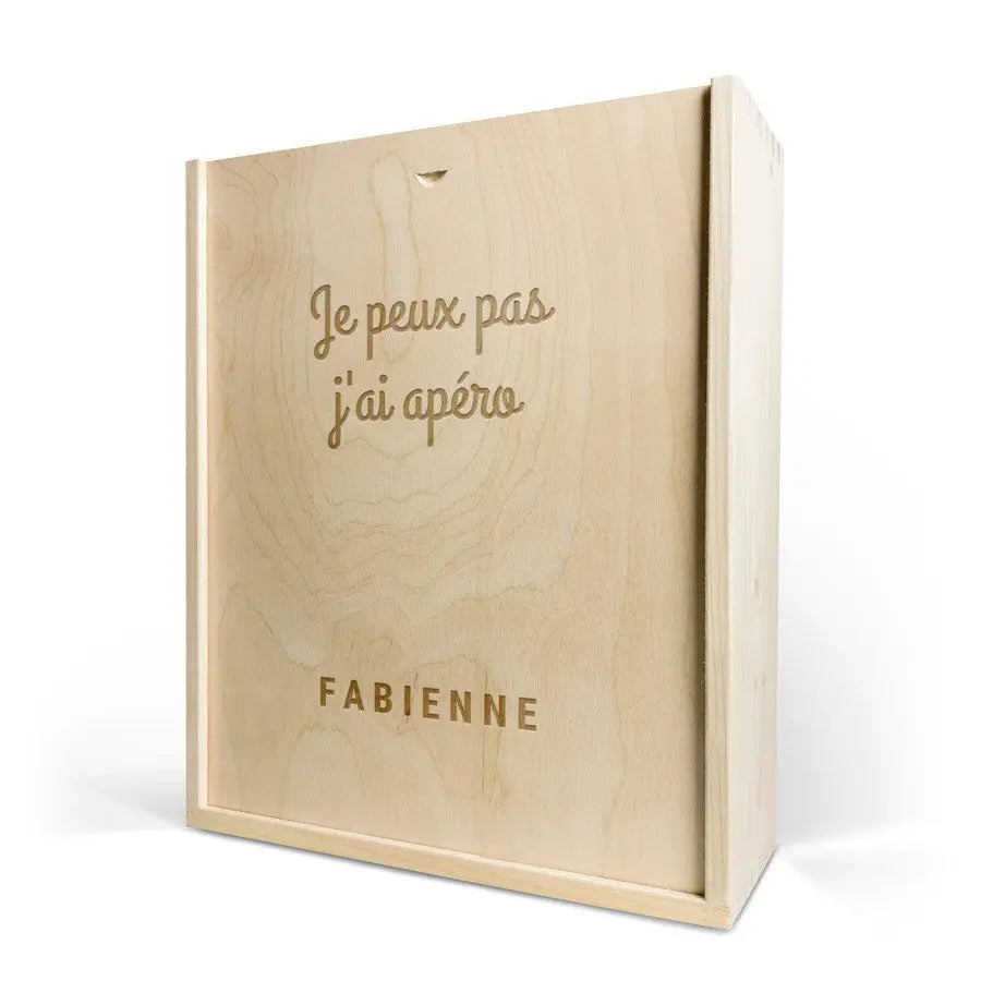 Une délicieuse bouteille de vin dans un luxueux coffret gravé. Avec le nom et/ou le texte de votre choix !