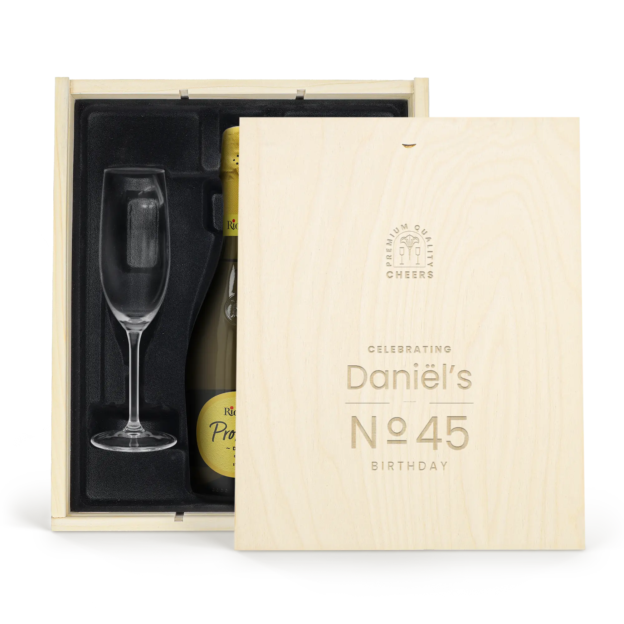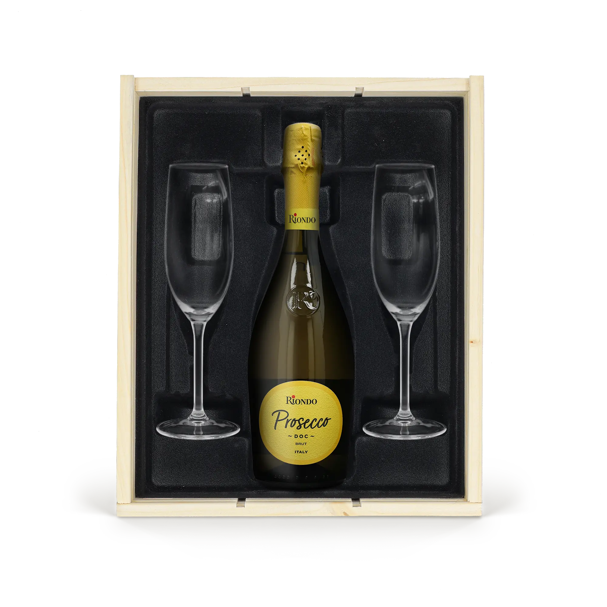 Coffret cadeau Champagne avec verres - Riondo Prosecco Spumante - Couvercle gravé