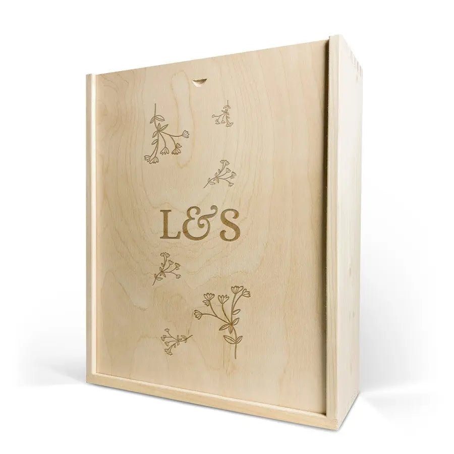[fort]Compléments :[/fort] Prosecco Riondo (DOC, Extra Dry), deux verres élégants, boîte de présentation en bois gravée personnalisée, doublure en velours noir luxueux.