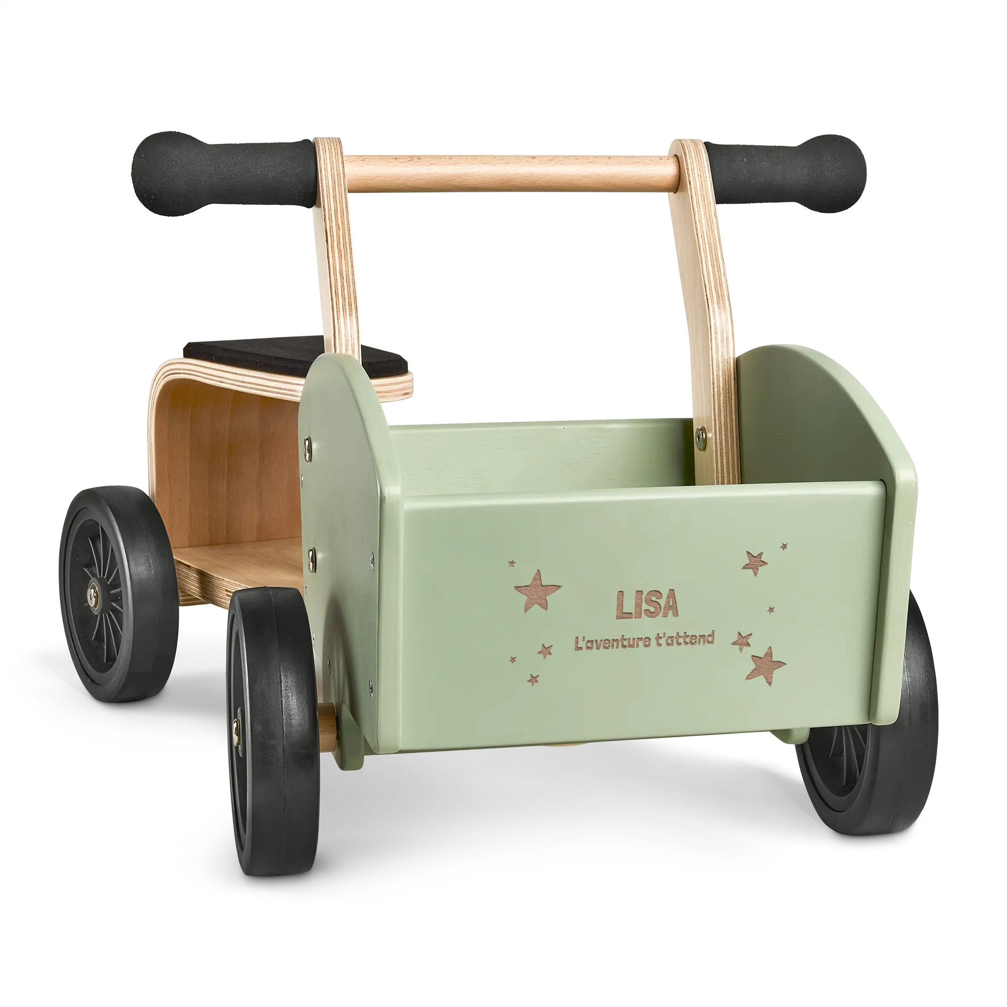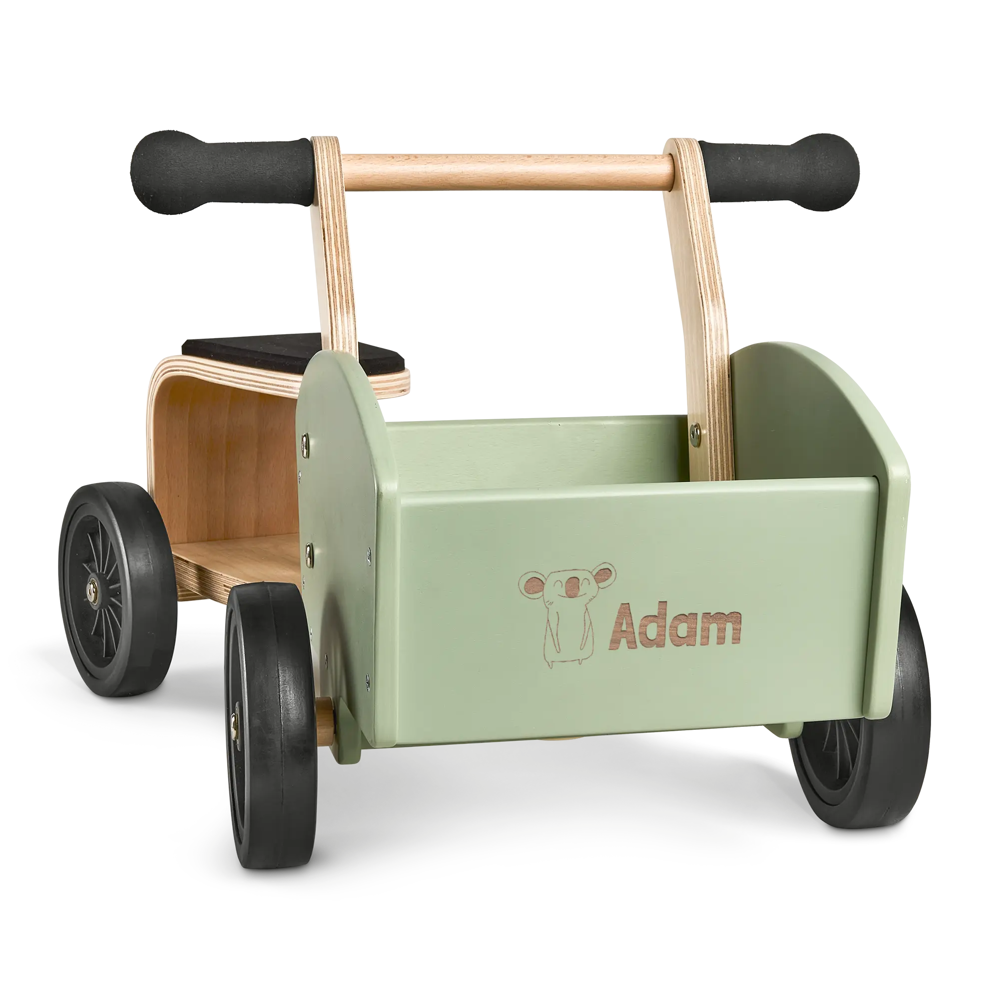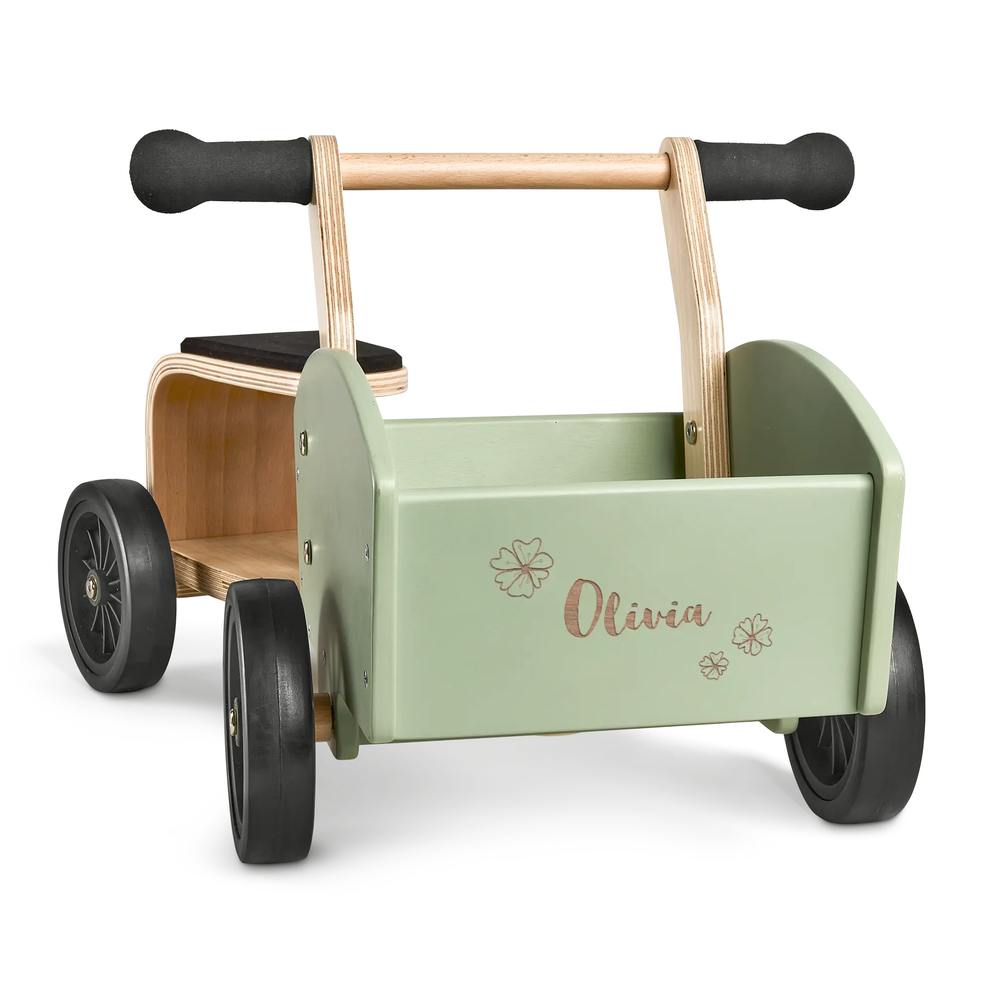 Vélo cargo en bois unique avec nom. Bois de bouleau de grande qualité, personnalisé avec gravure. Pour garçons et filles !
