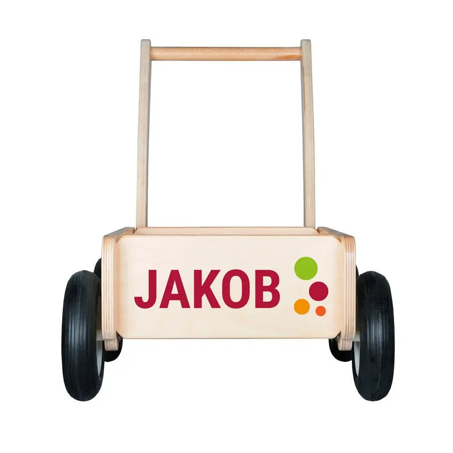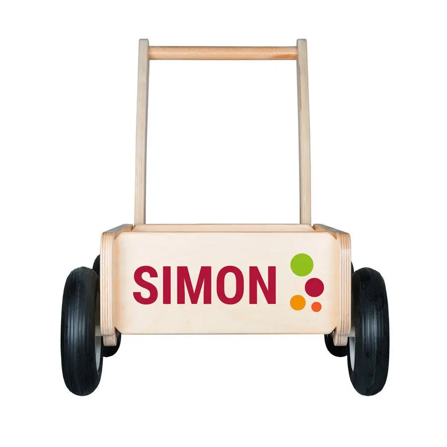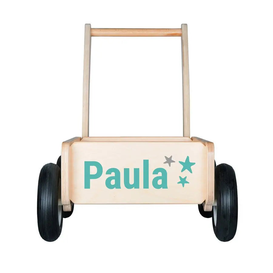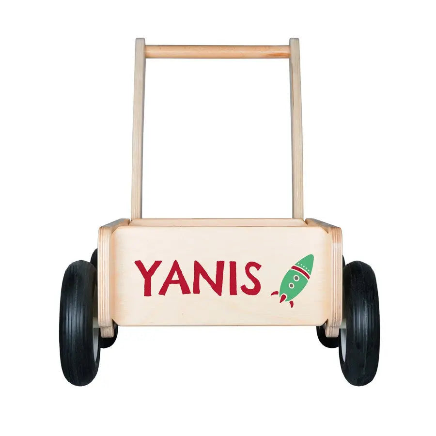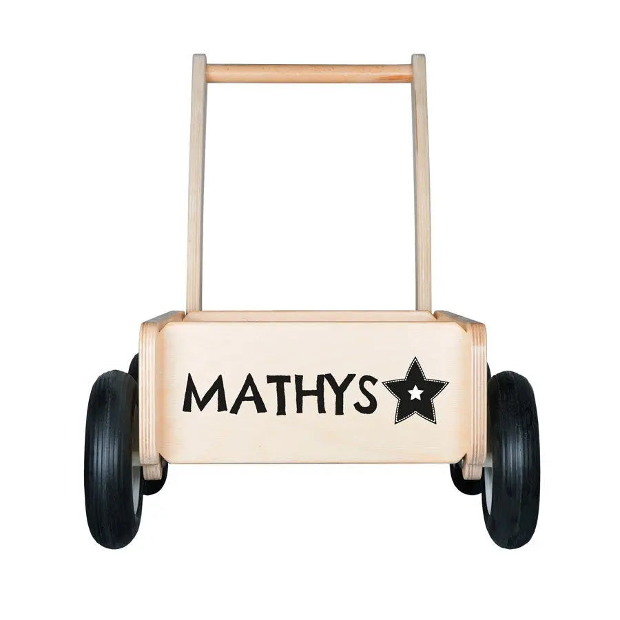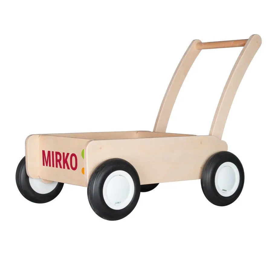 Créez un chariot à pousser en bois unique avec votre nom. Bois de bouleau très résistant et de qualité avec des autocollants brillants. De nombreuses heures de jeu joyeux !