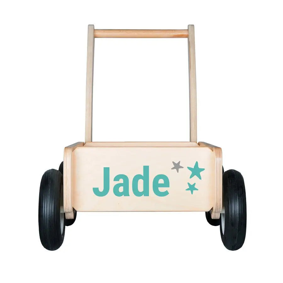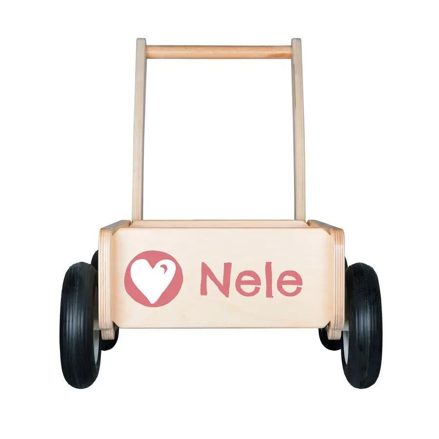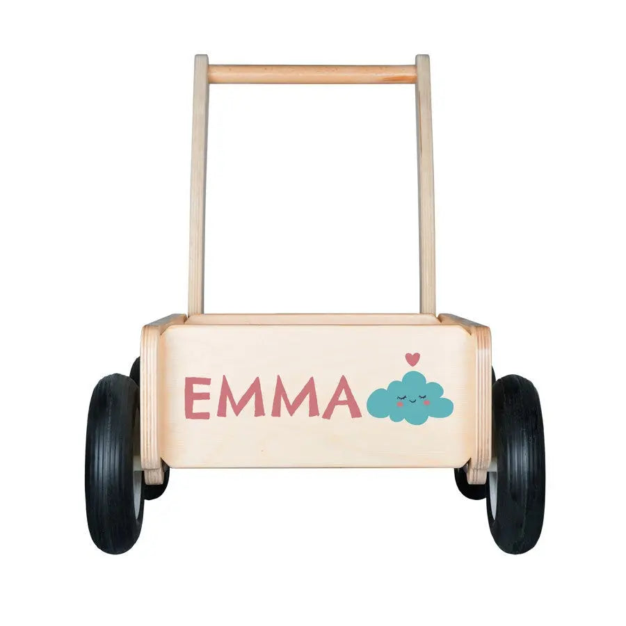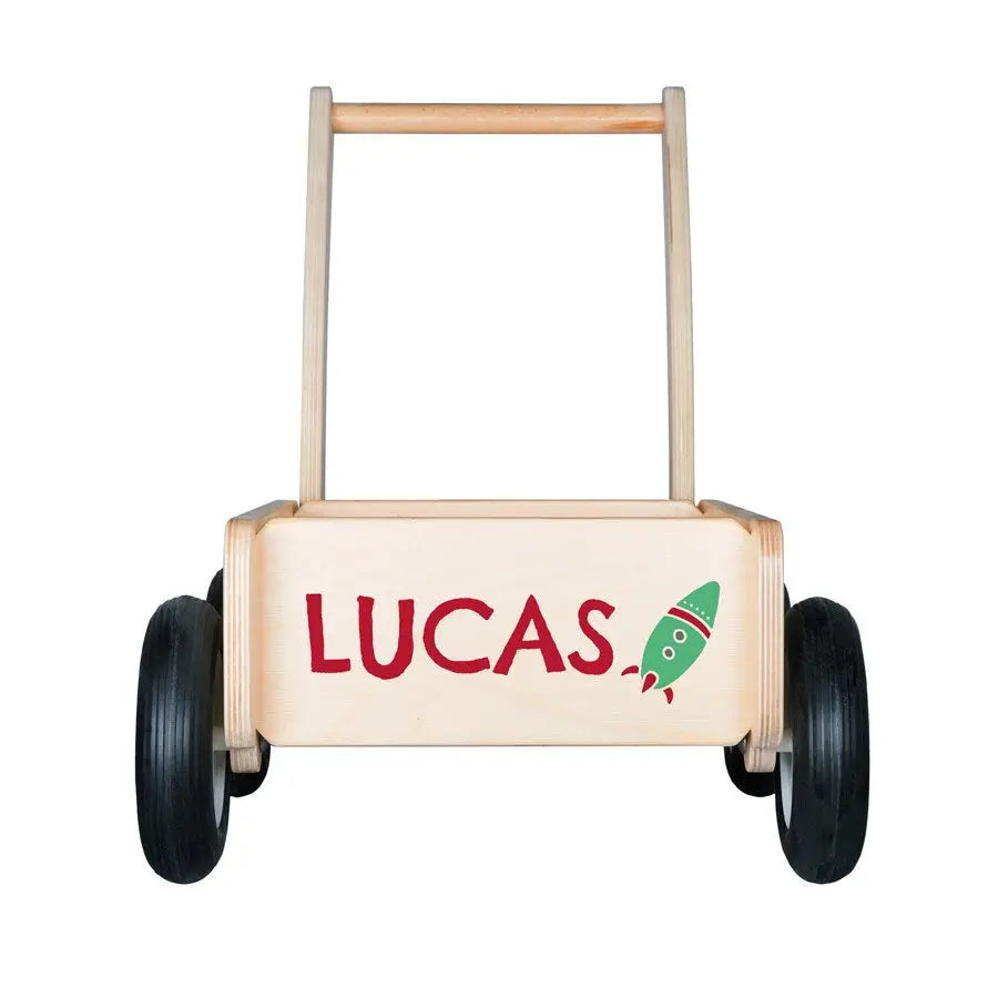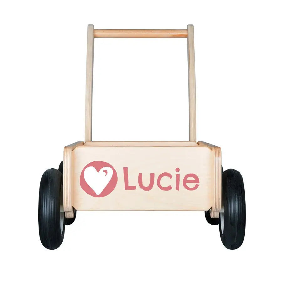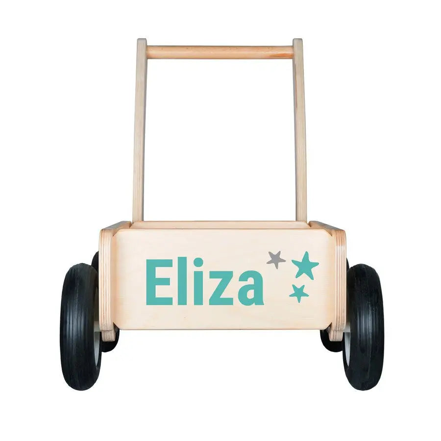 Créez un chariot à pousser en bois unique avec votre nom. Bois de bouleau très résistant et de qualité avec des autocollants brillants. De nombreuses heures de jeu joyeux !