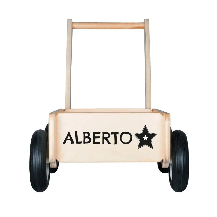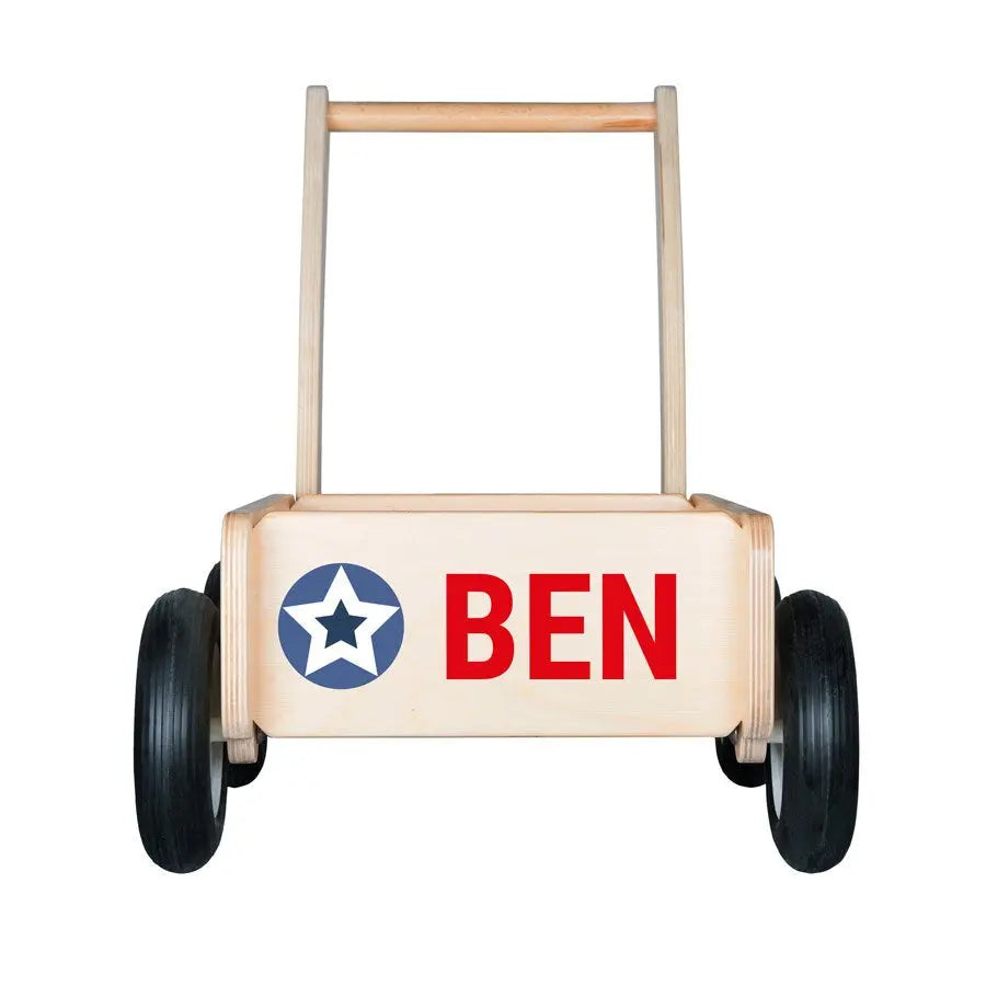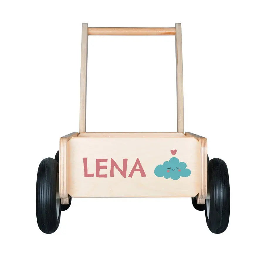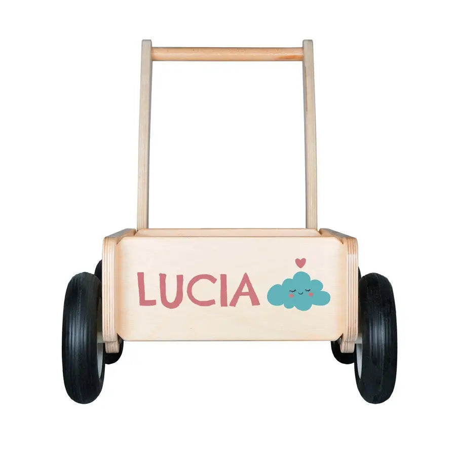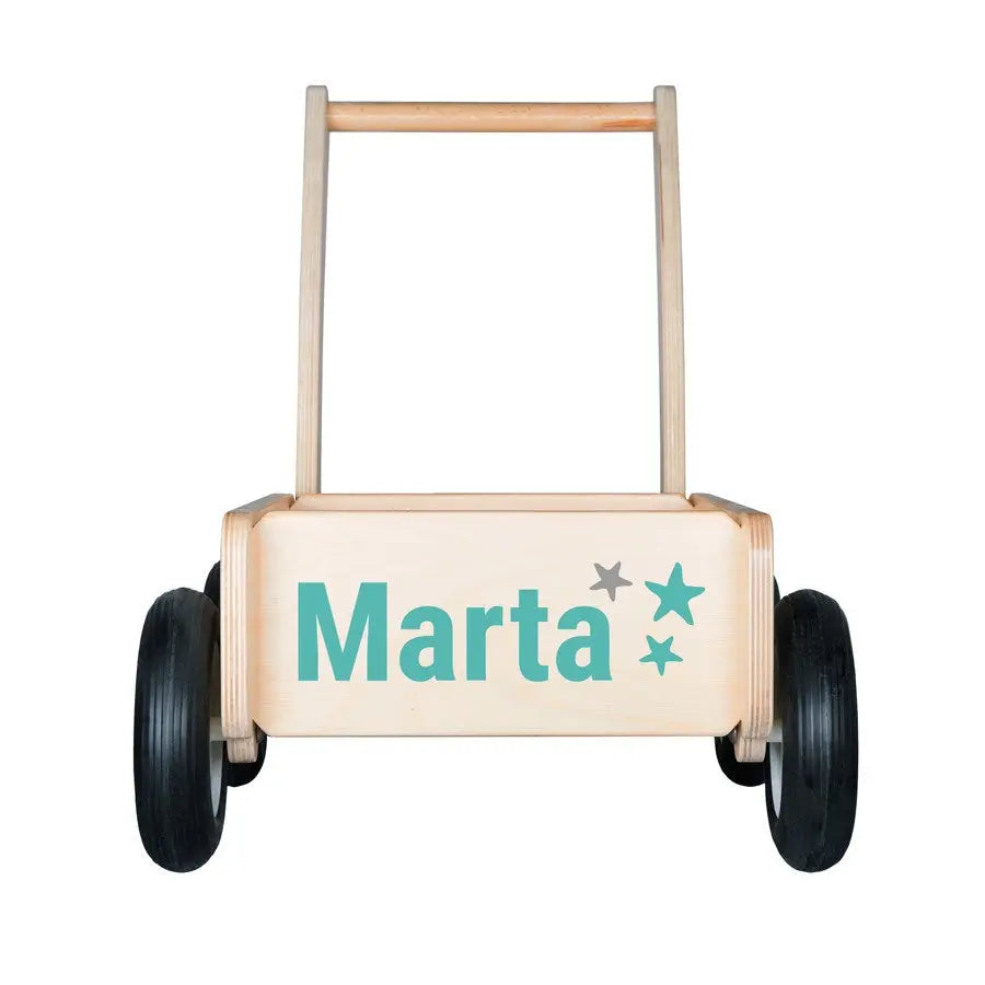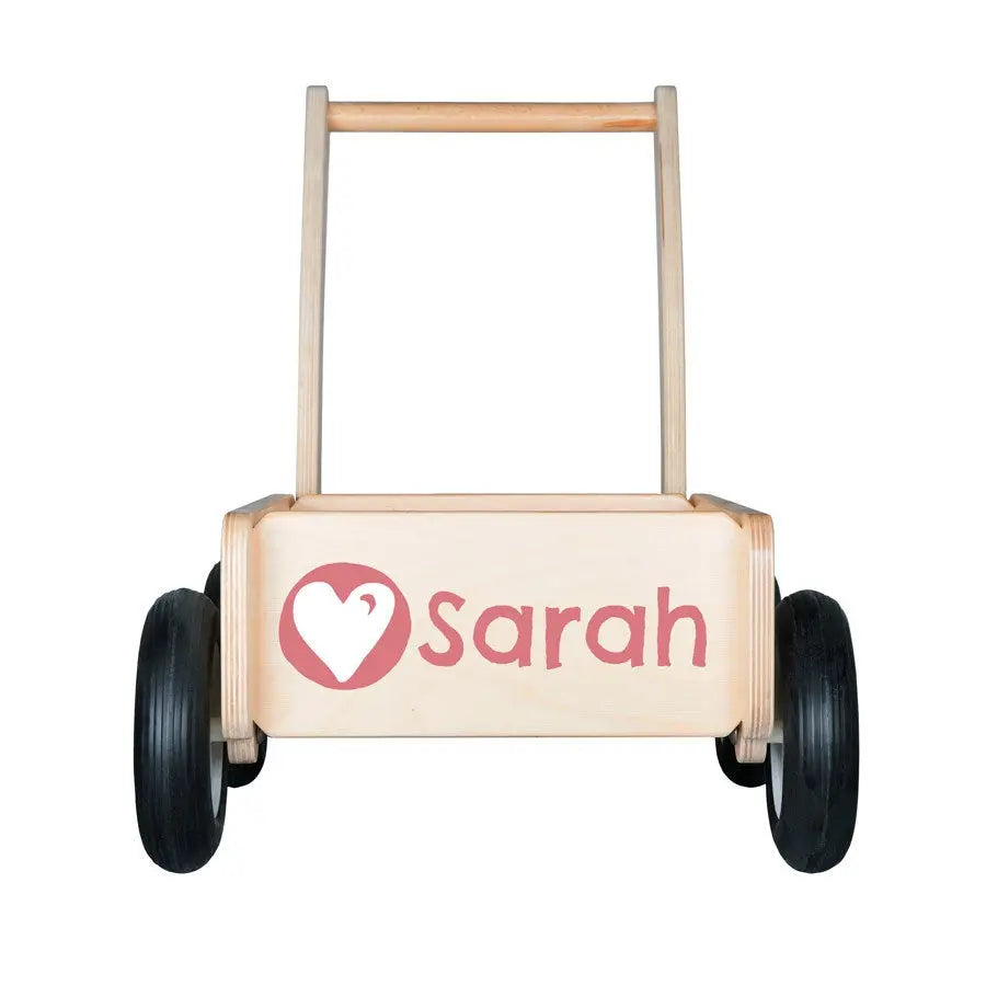 Créez un chariot à pousser en bois unique avec votre nom. Bois de bouleau très résistant et de qualité avec des autocollants brillants. De nombreuses heures de jeu joyeux !