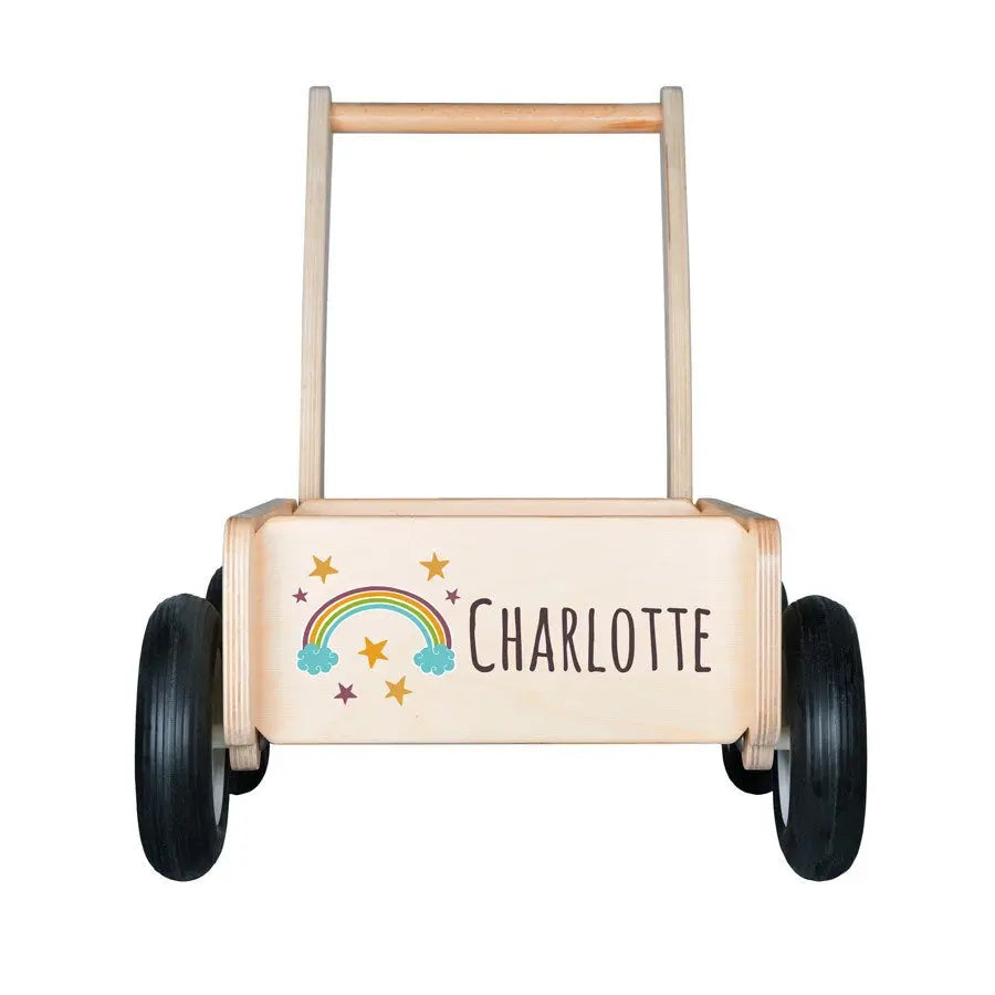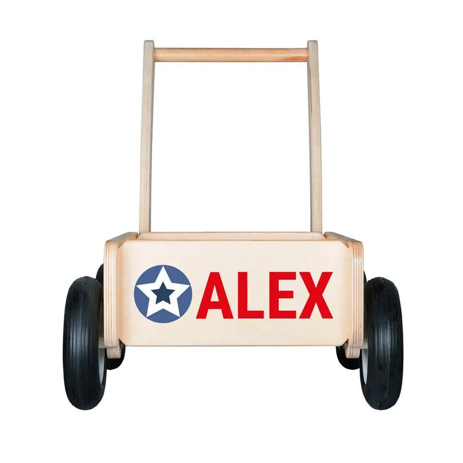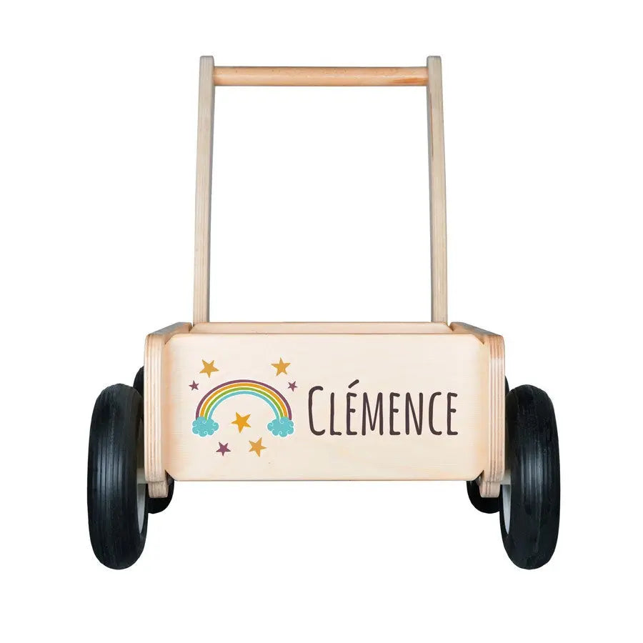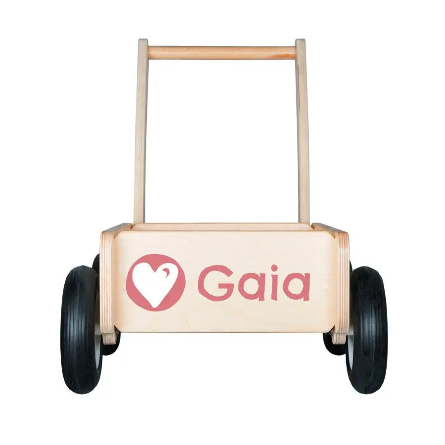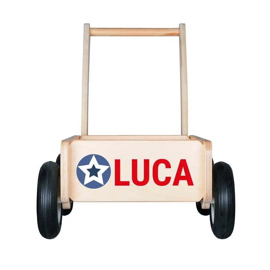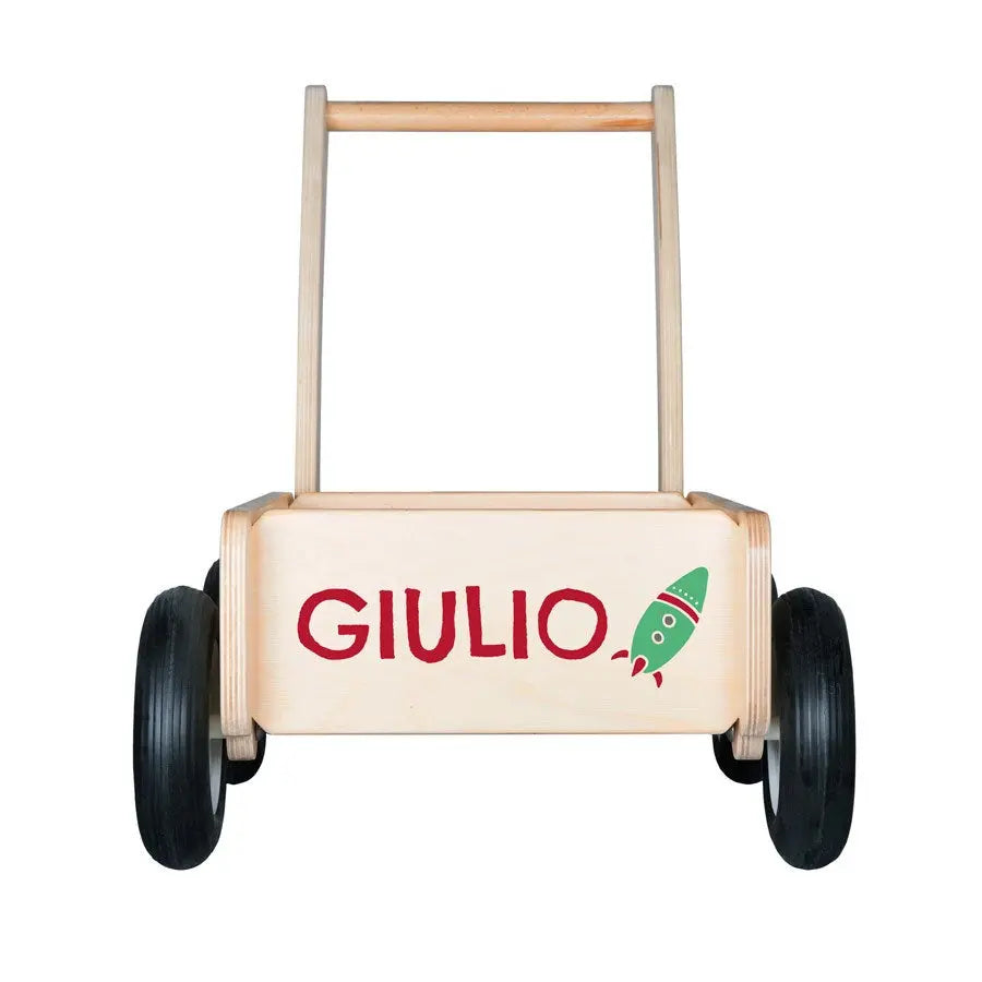 Créez un chariot à pousser en bois unique avec votre nom. Bois de bouleau très résistant et de qualité avec des autocollants brillants. De nombreuses heures de jeu joyeux !