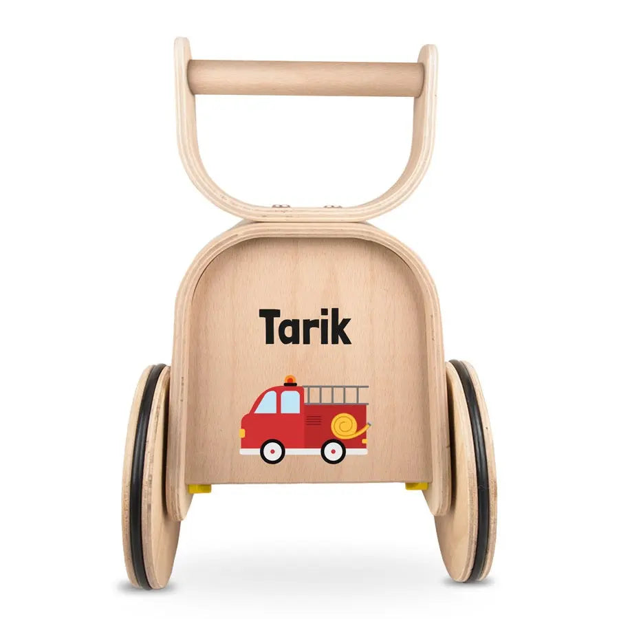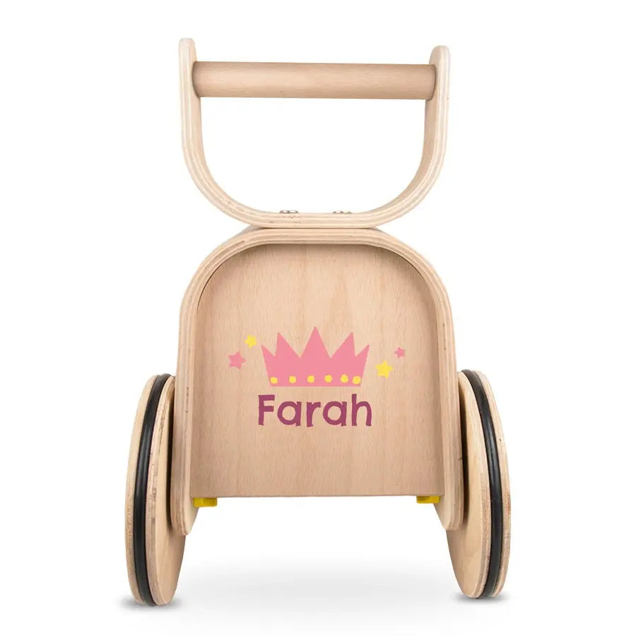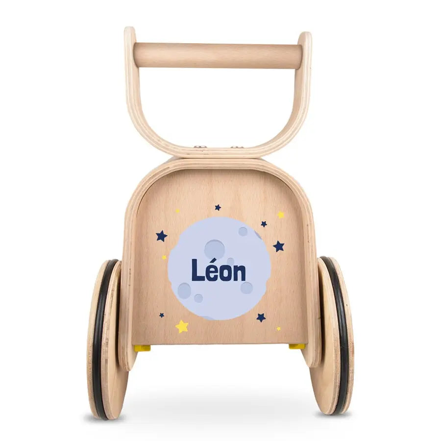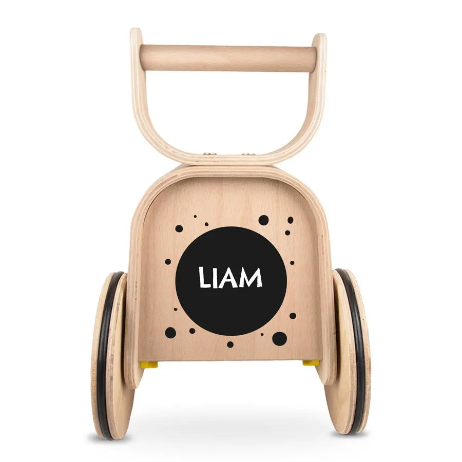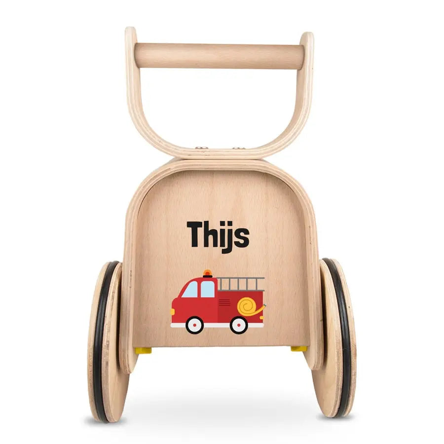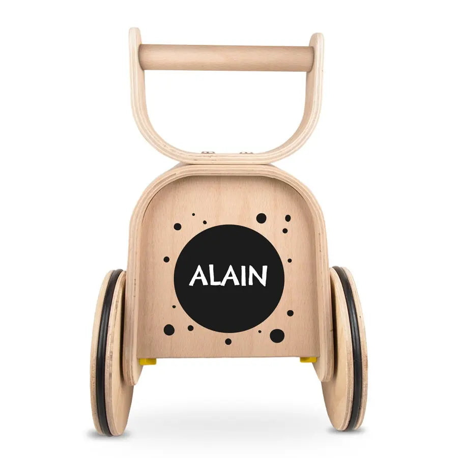 Plus d'informations sur le jouet à pousser en bois imprimé : Dimensions : 49 x 21 cm Hauteur d'assise : 21 cm Poids : ± 4 kg Type de bois : multiplex de bouleau ultra résistant et sans échardes Détails : bois de bouleau de haute qualité Âge : 10 mois et plus Type de personnalisation : avec le nom Emplacement de la personnalisation : sur le devant Méthode de personnalisation : film vinyle laminé de haute qualité Bonus : 3 jouets en 1 : rouler, pousser et ranger ! Bon à savoir : Les roues sont dotées d'un insert en caoutchouc, ce qui signifie que votre petit peut courir à l'intérieur sans trop de bruit. Vous pouvez également régler la vitesse maximale grâce aux clips pratiques fournis à cet effet.