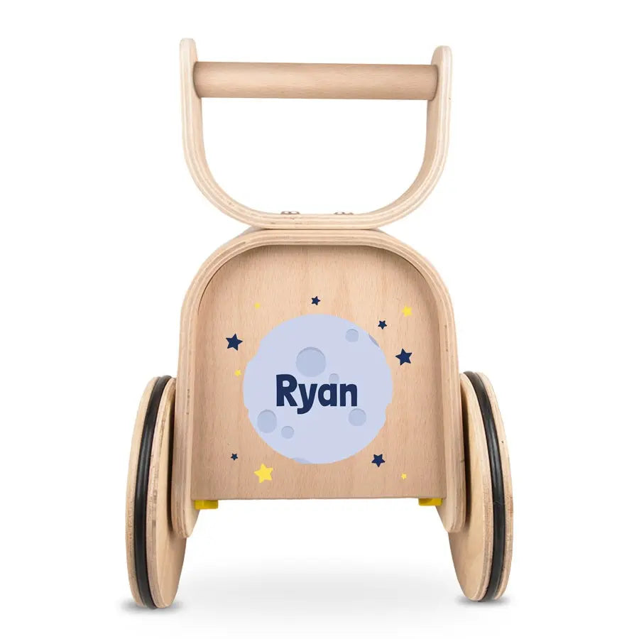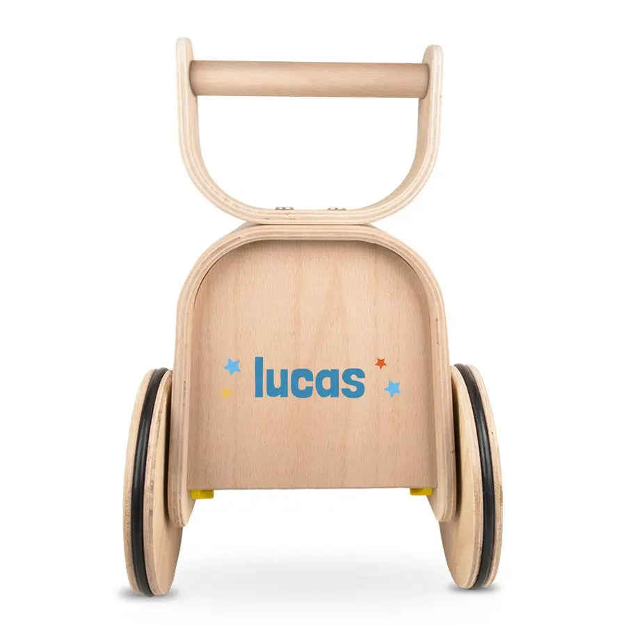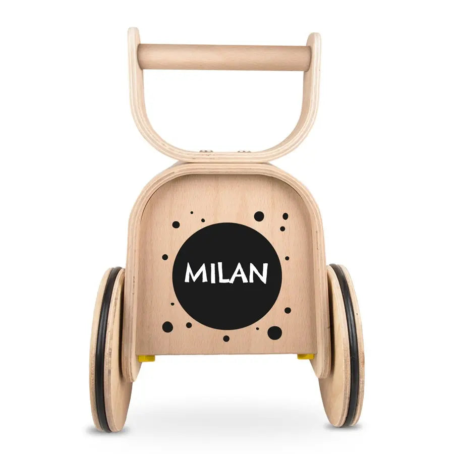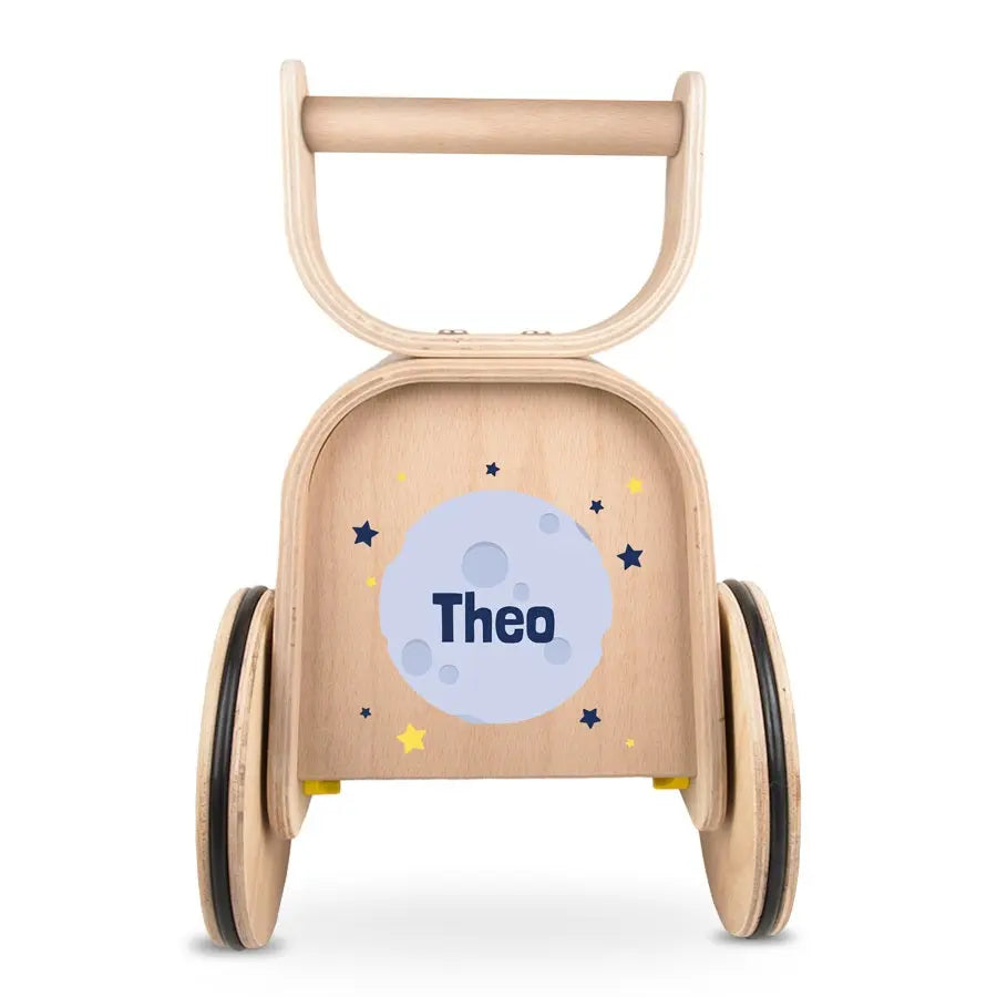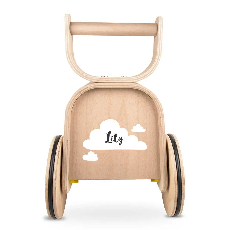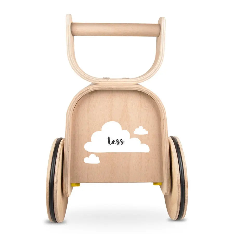 Plus d'informations sur le jouet à pousser en bois imprimé : Dimensions : 49 x 21 cm Hauteur d'assise : 21 cm Poids : ± 4 kg Type de bois : multiplex de bouleau ultra résistant et sans échardes Détails : bois de bouleau de haute qualité Âge : 10 mois et plus Type de personnalisation : avec le nom Emplacement de la personnalisation : sur le devant Méthode de personnalisation : film vinyle laminé de haute qualité Bonus : 3 jouets en 1 : rouler, pousser et ranger ! Bon à savoir : Les roues sont dotées d'un insert en caoutchouc, ce qui signifie que votre petit peut courir à l'intérieur sans trop de bruit. Vous pouvez également régler la vitesse maximale grâce aux clips pratiques fournis à cet effet.