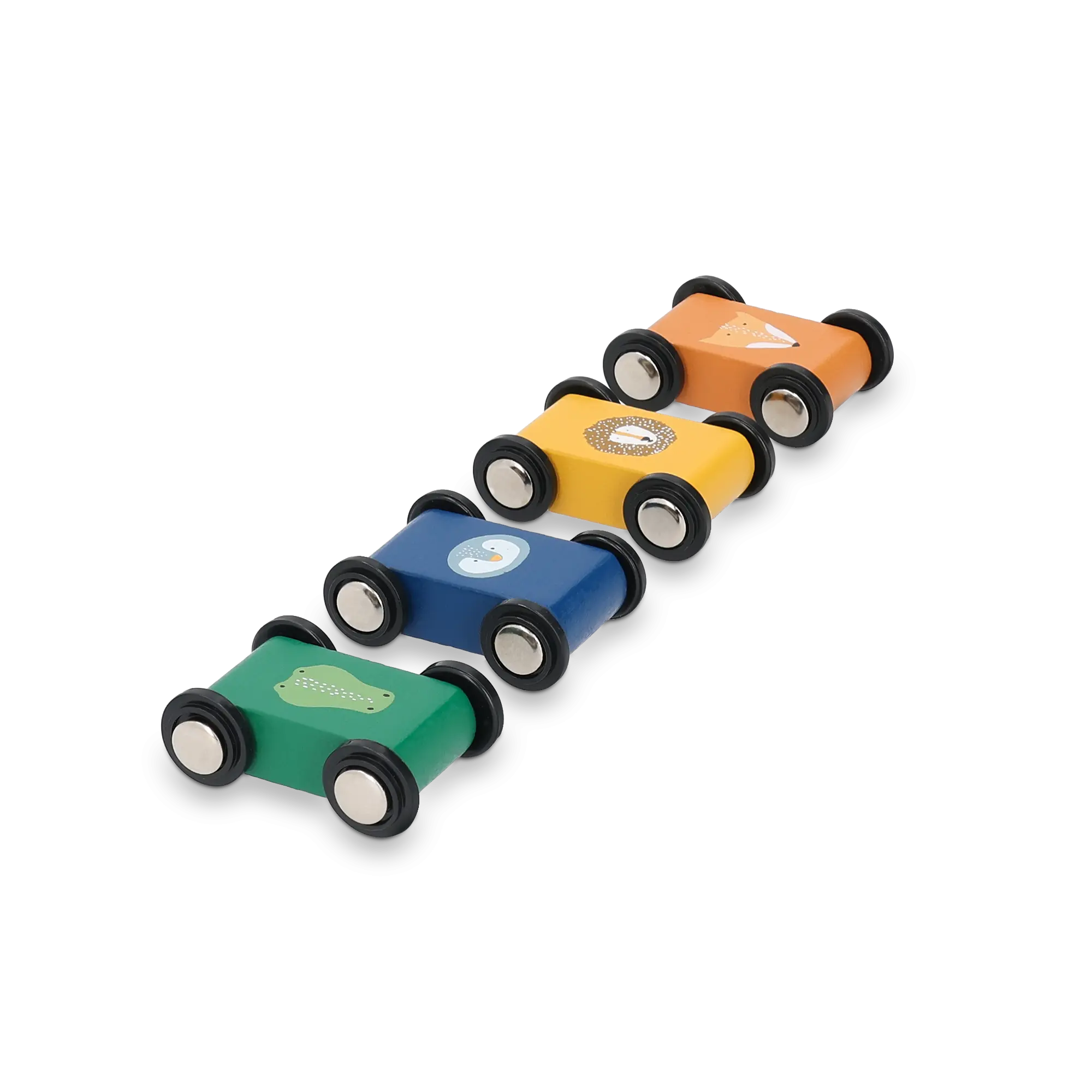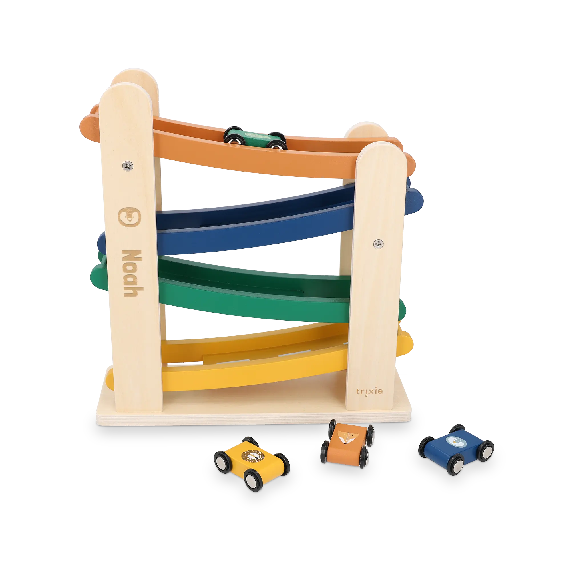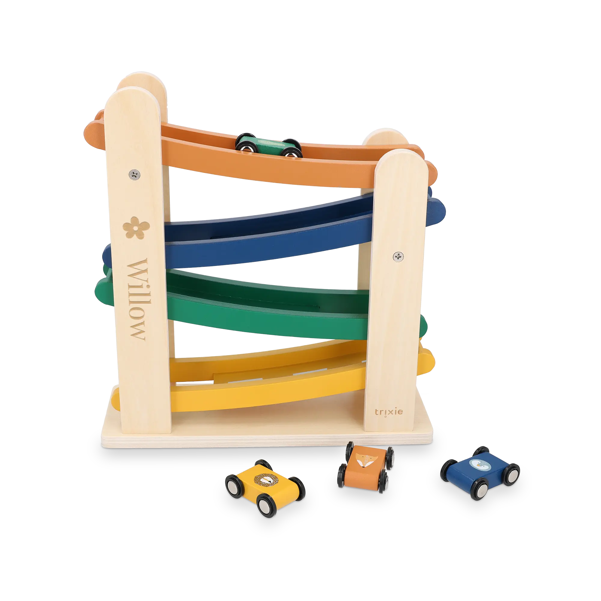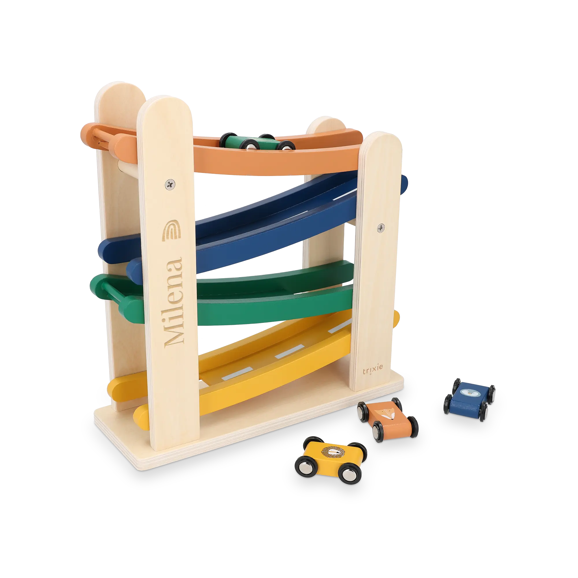 Un adorable jouet de course de rampe en bois Trixie gravé au nom du destinataire. Comprend quatre voitures de course.