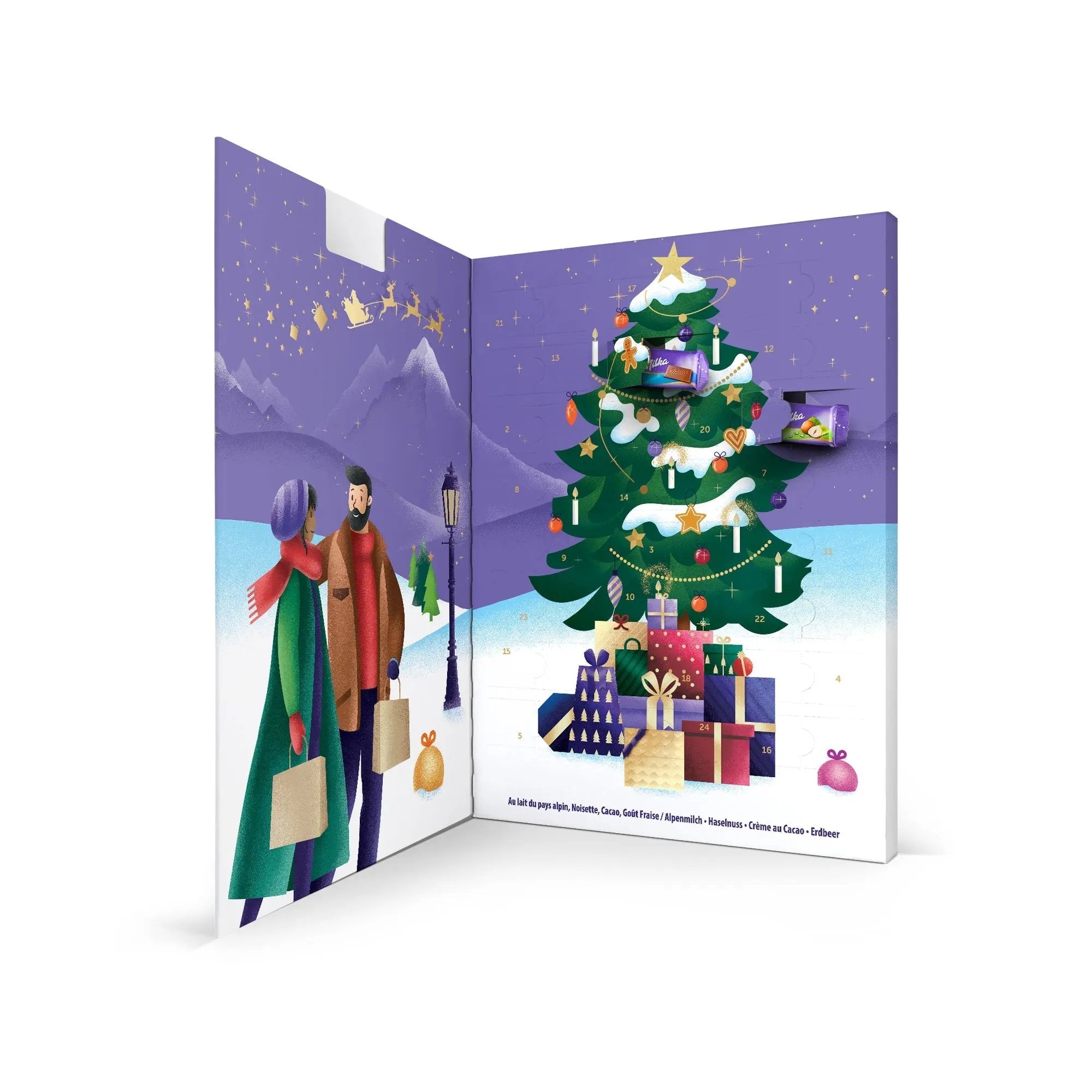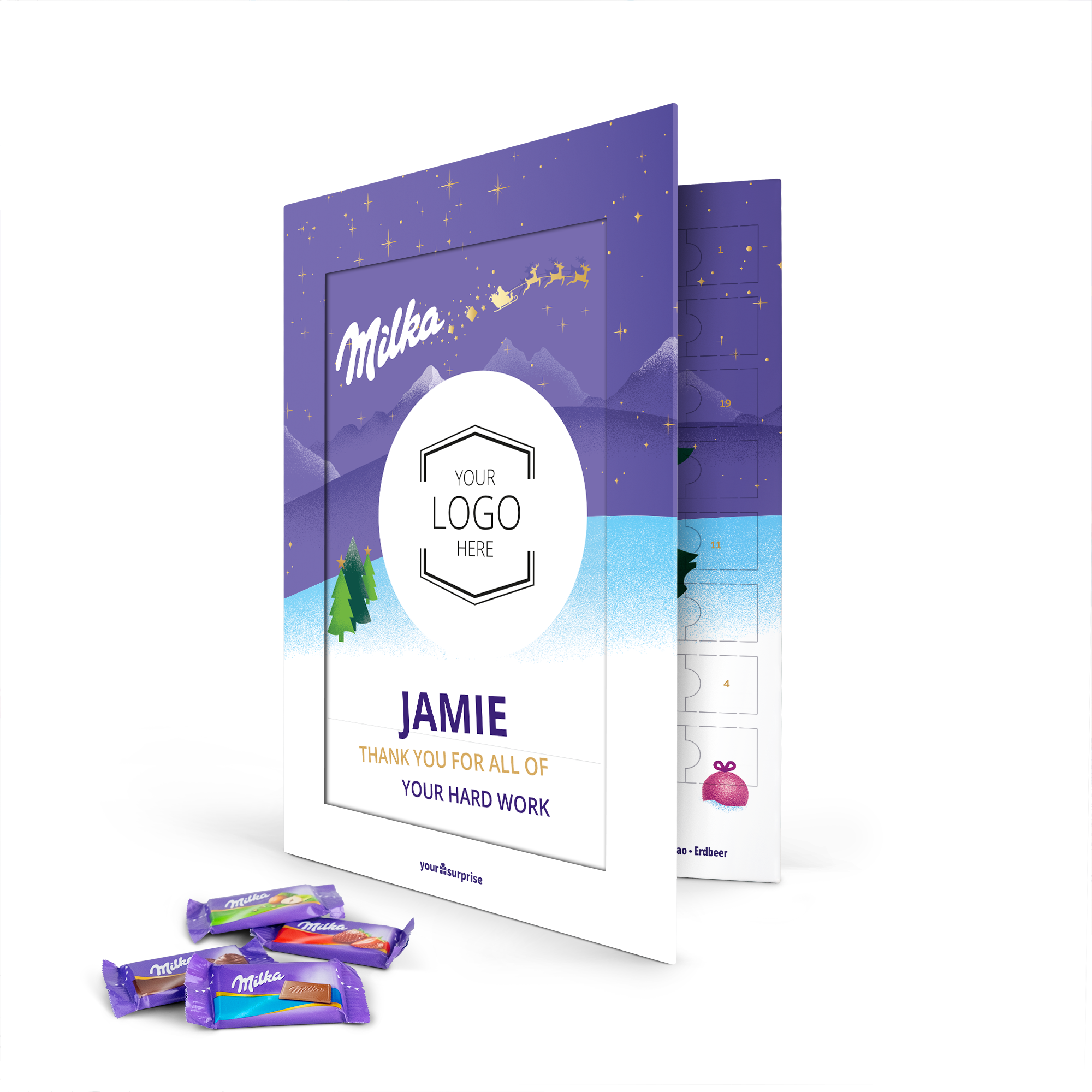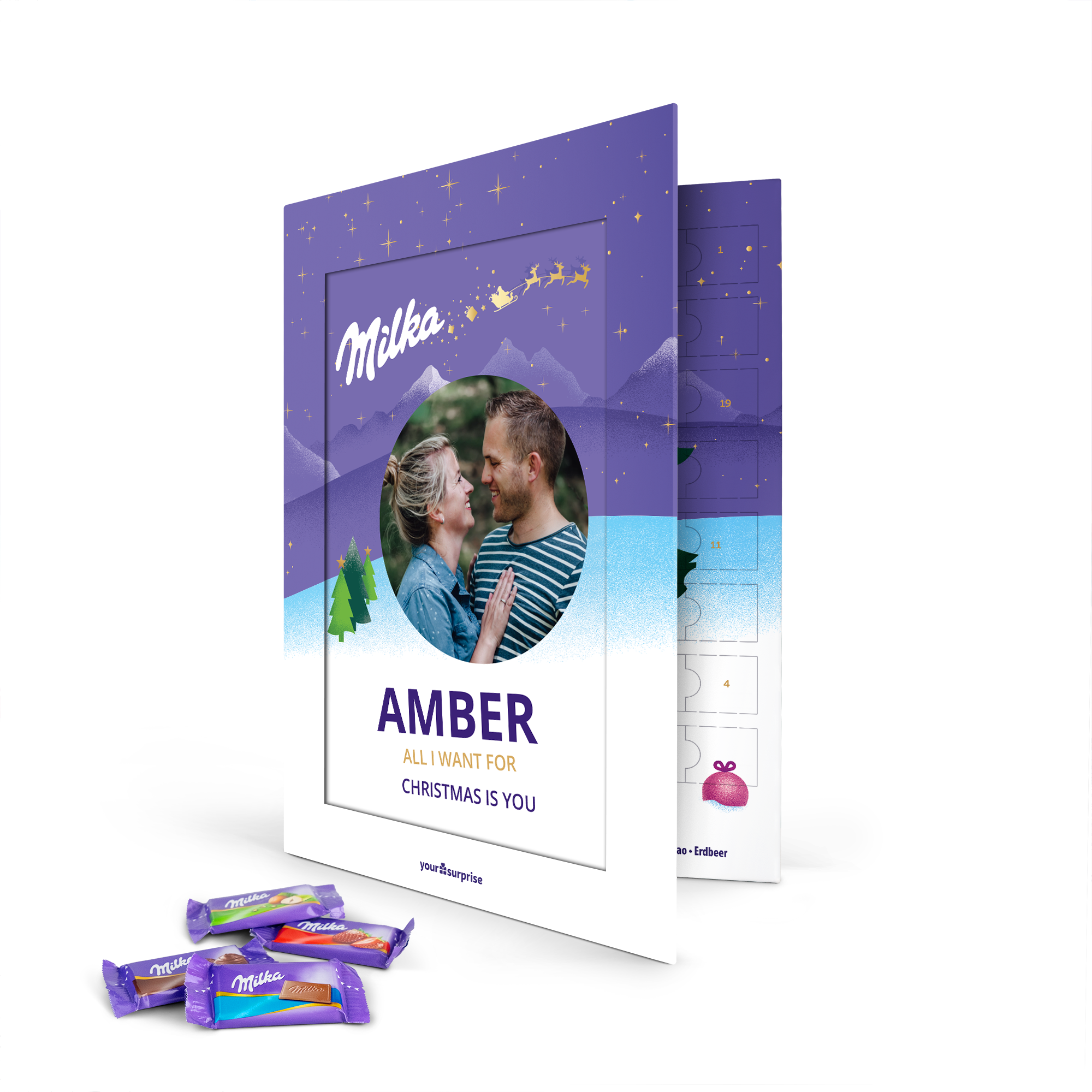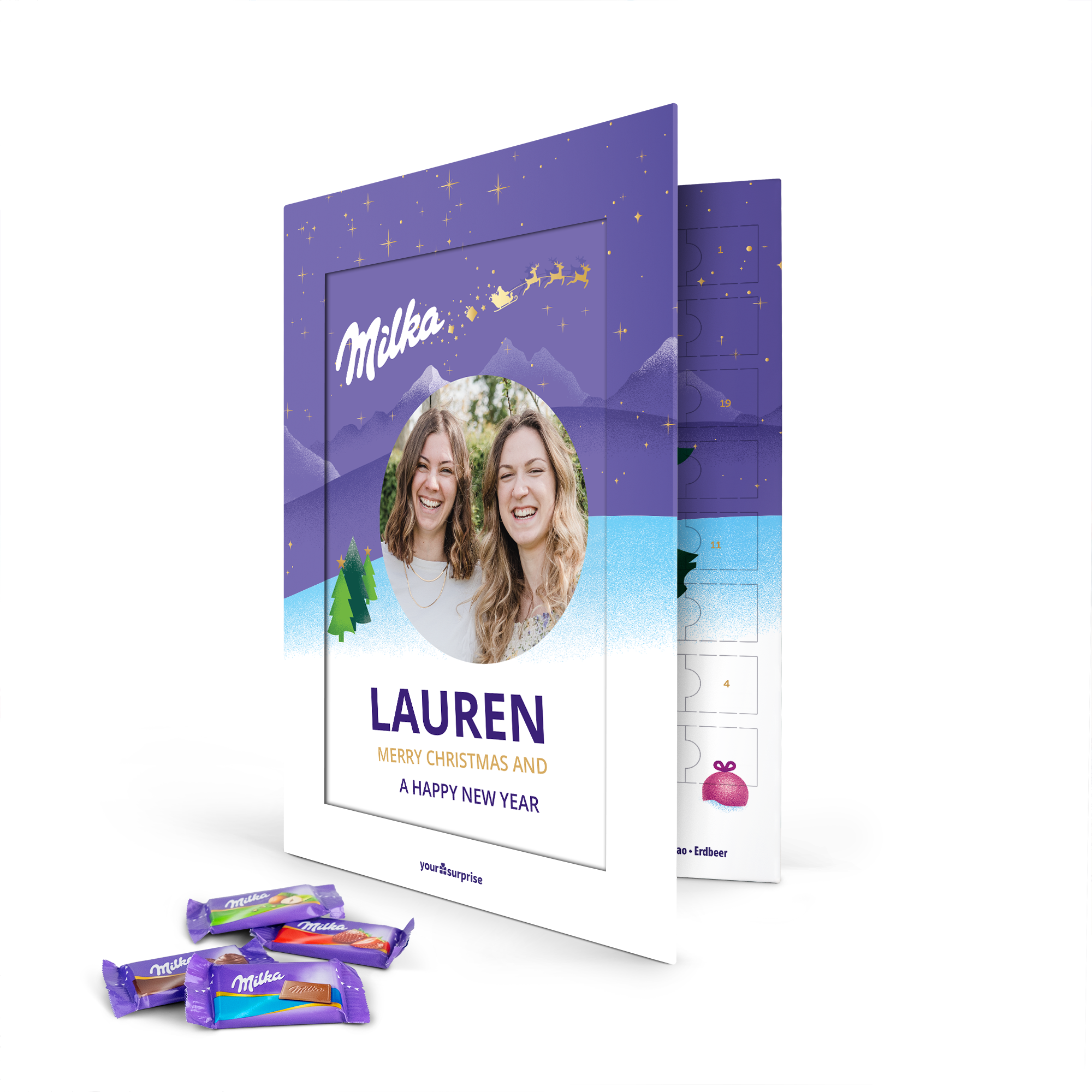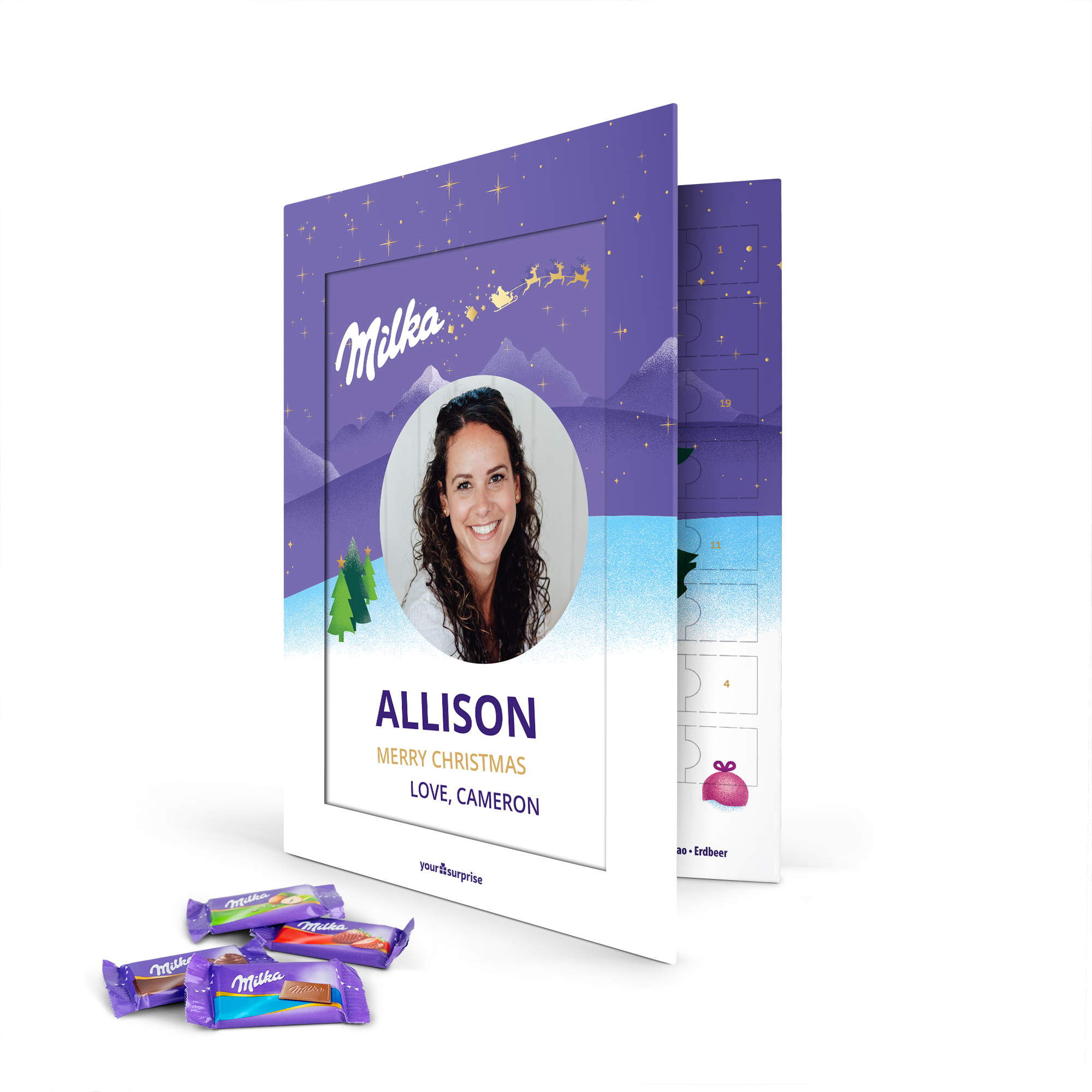 Calendrier de l'Avent Milka avec photo, nom et/ou texte. Rempli de 24 délicieux chocolats Milka. Un délicieux compte à rebours avant Noël !
