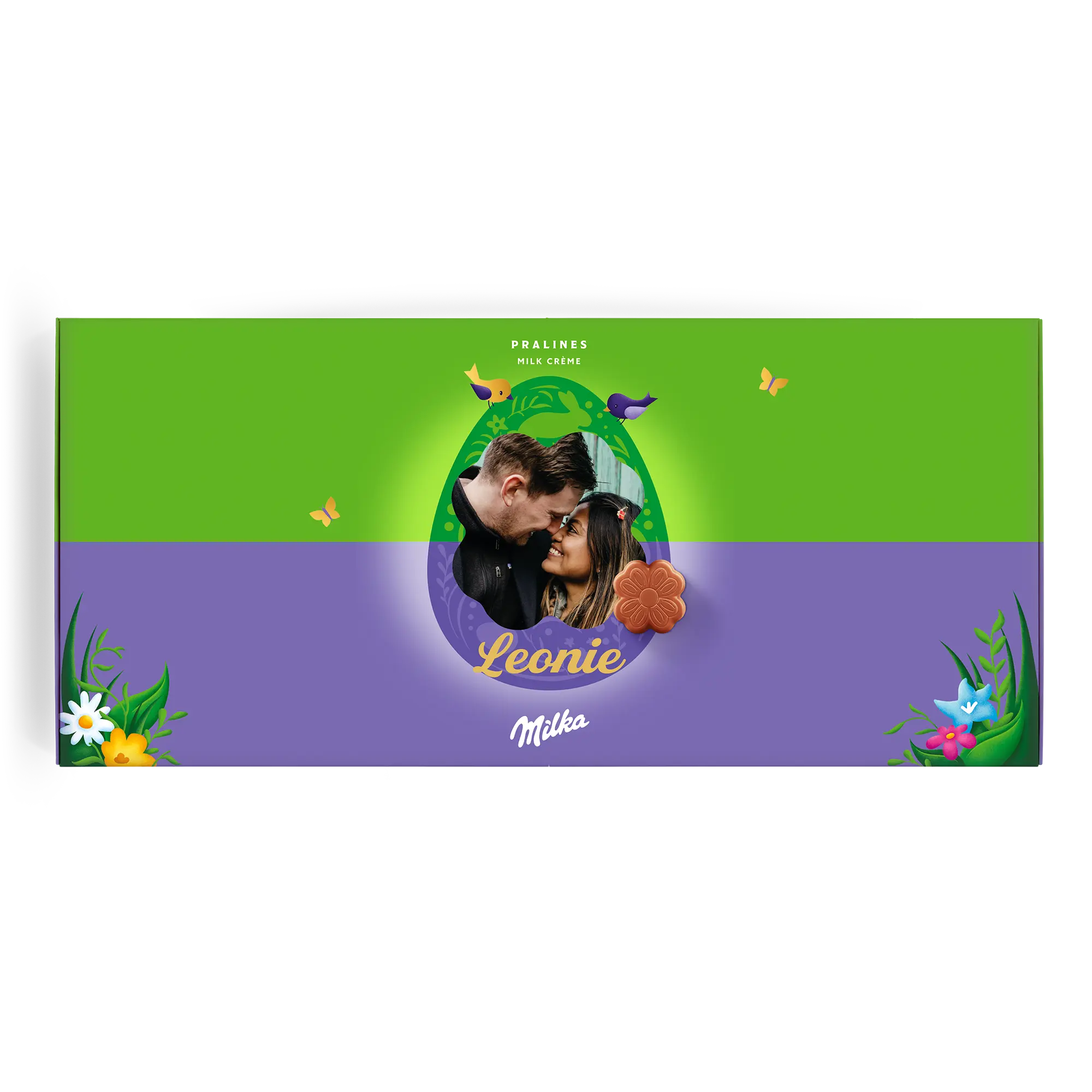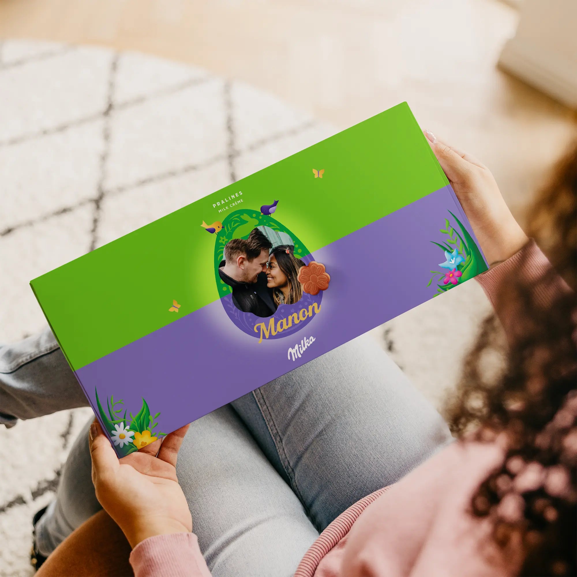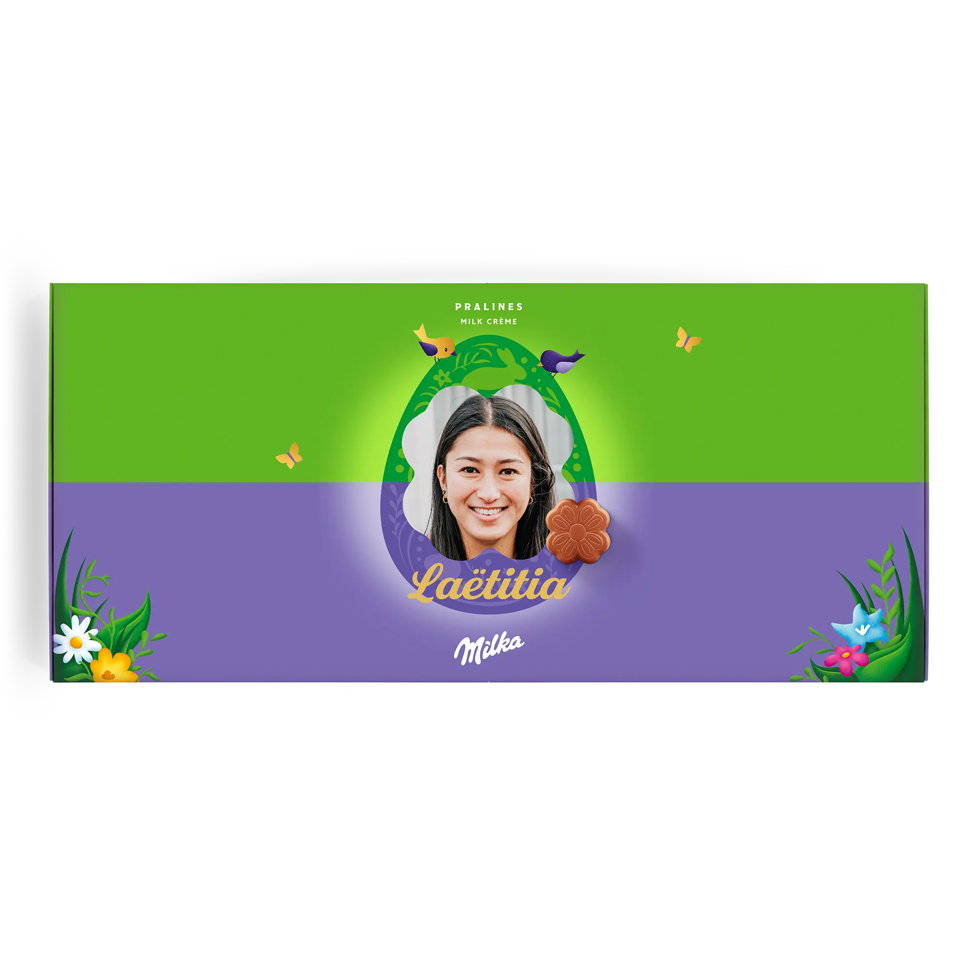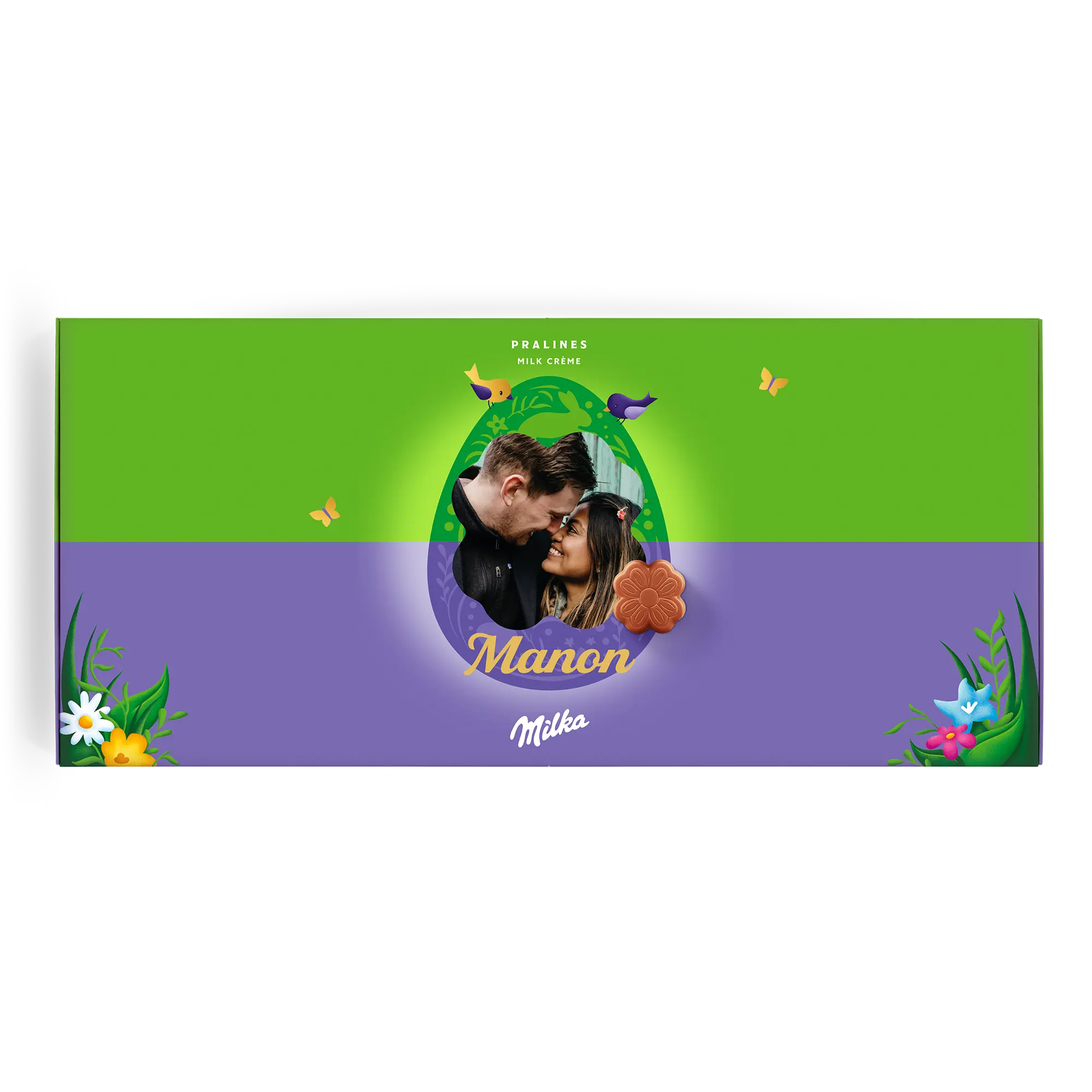 Coffret spécial Dites-le avec Milka pour Pâques. De délicieuses pralines avec nom, photo et message personnel. Surprenez vos proches !