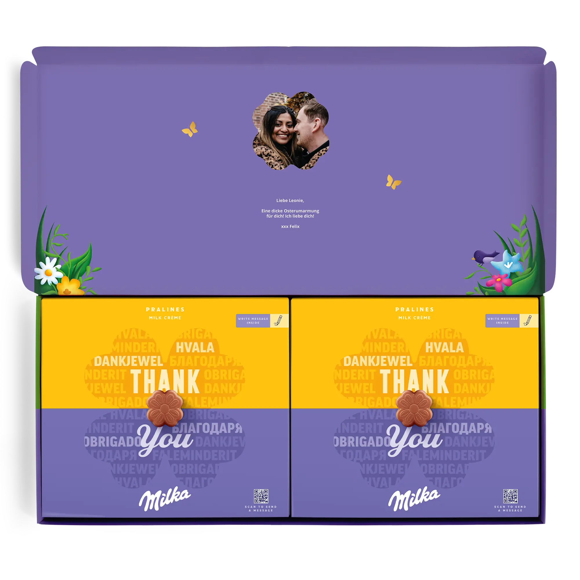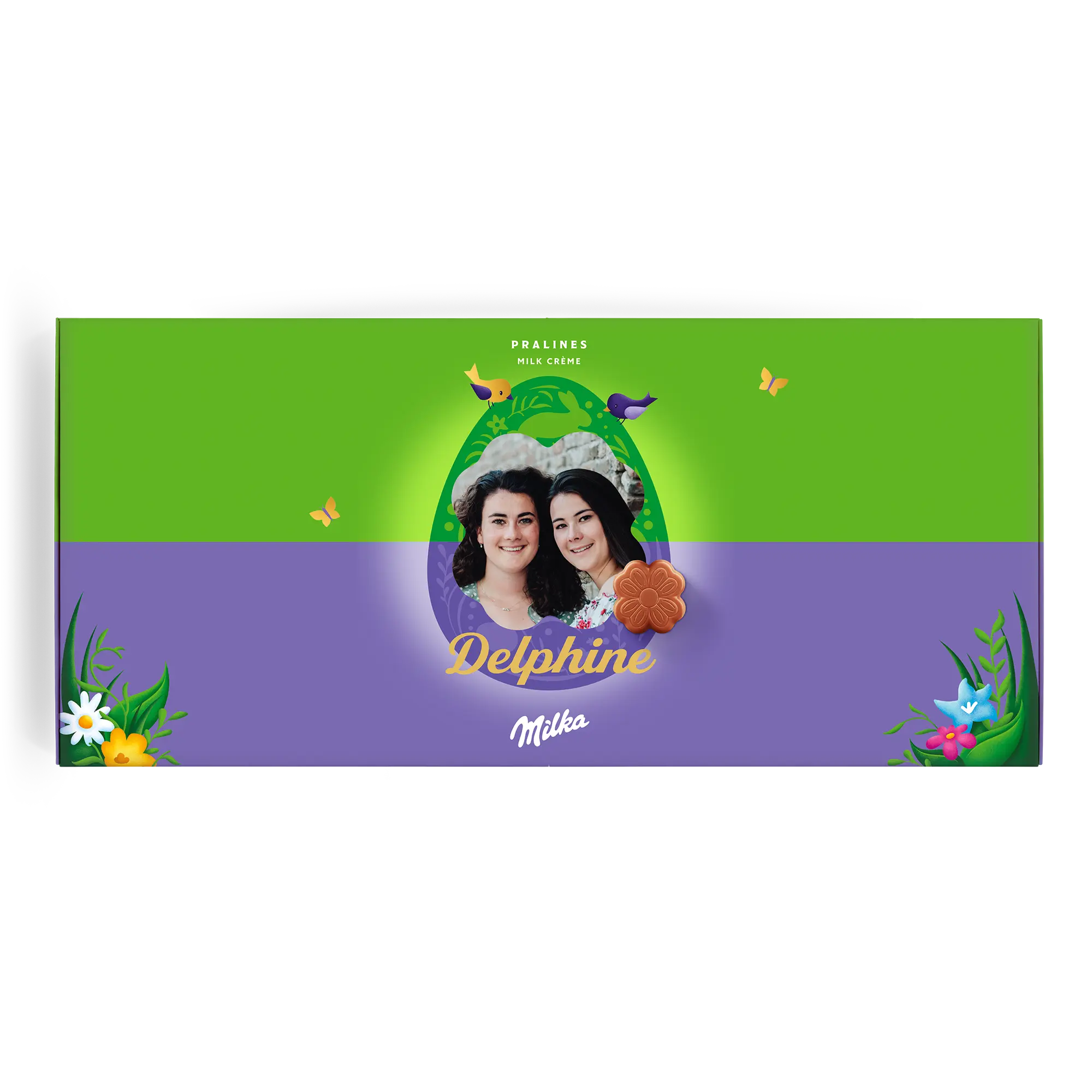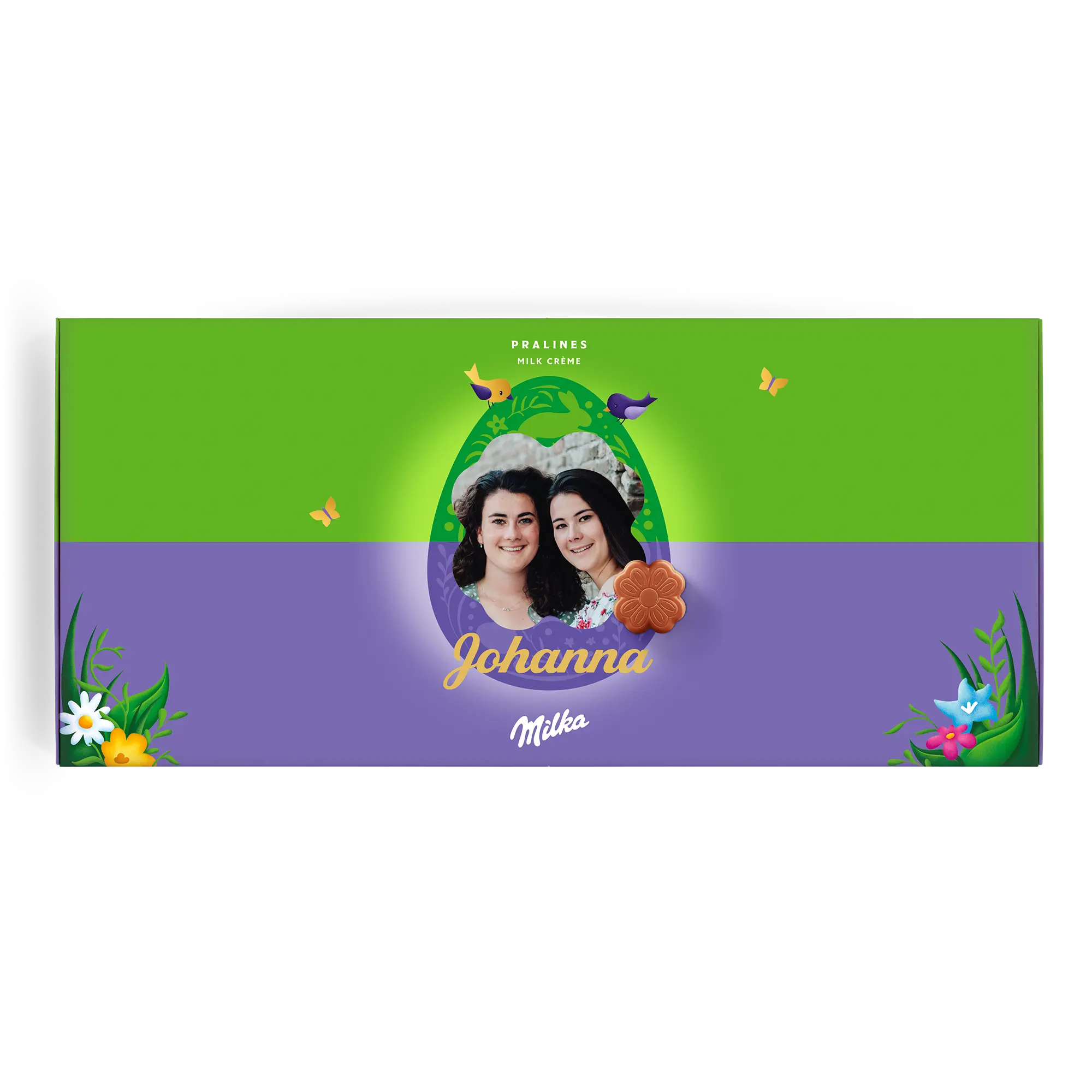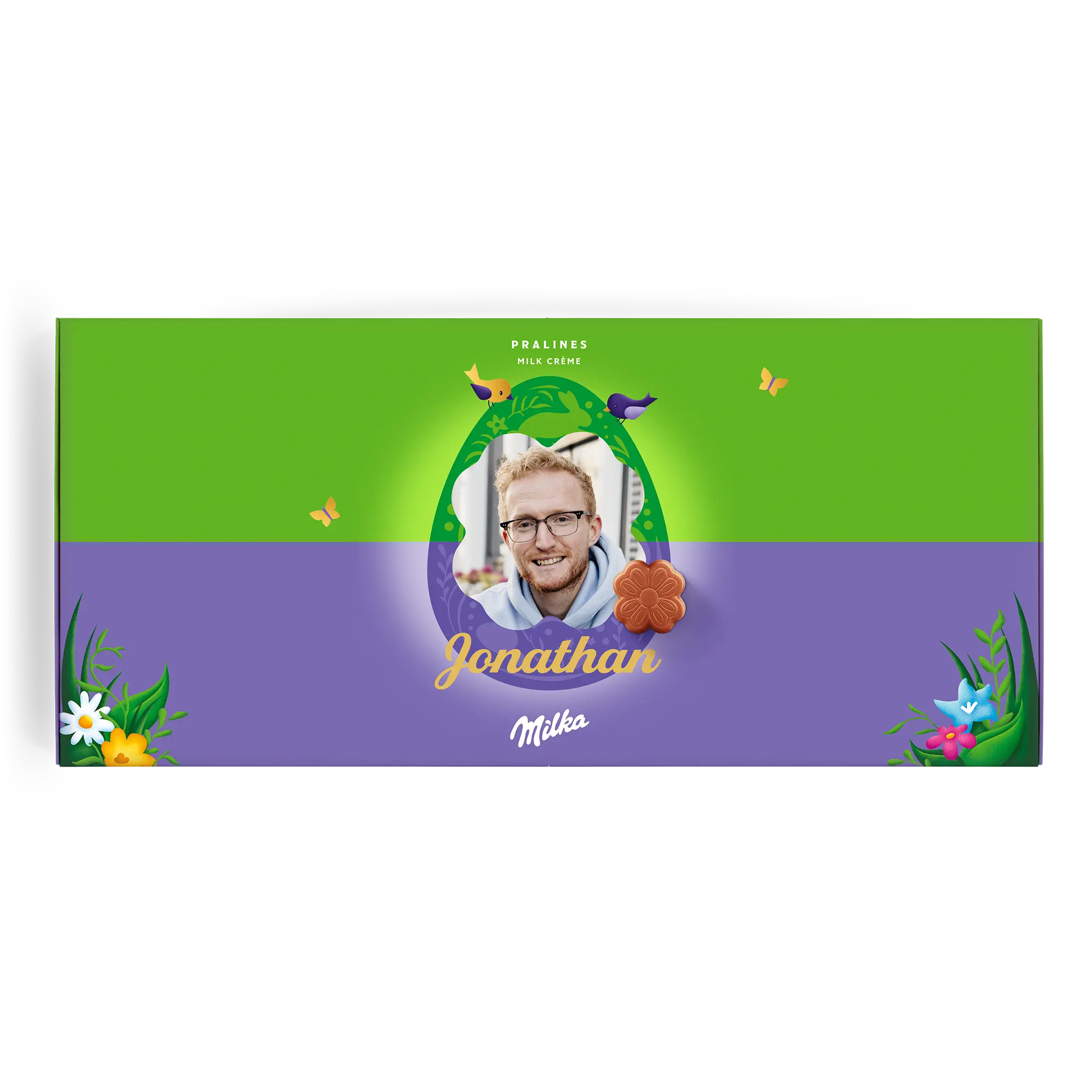 Coffret spécial Dites-le avec Milka pour Pâques. De délicieuses pralines avec nom, photo et message personnel. Surprenez vos proches !