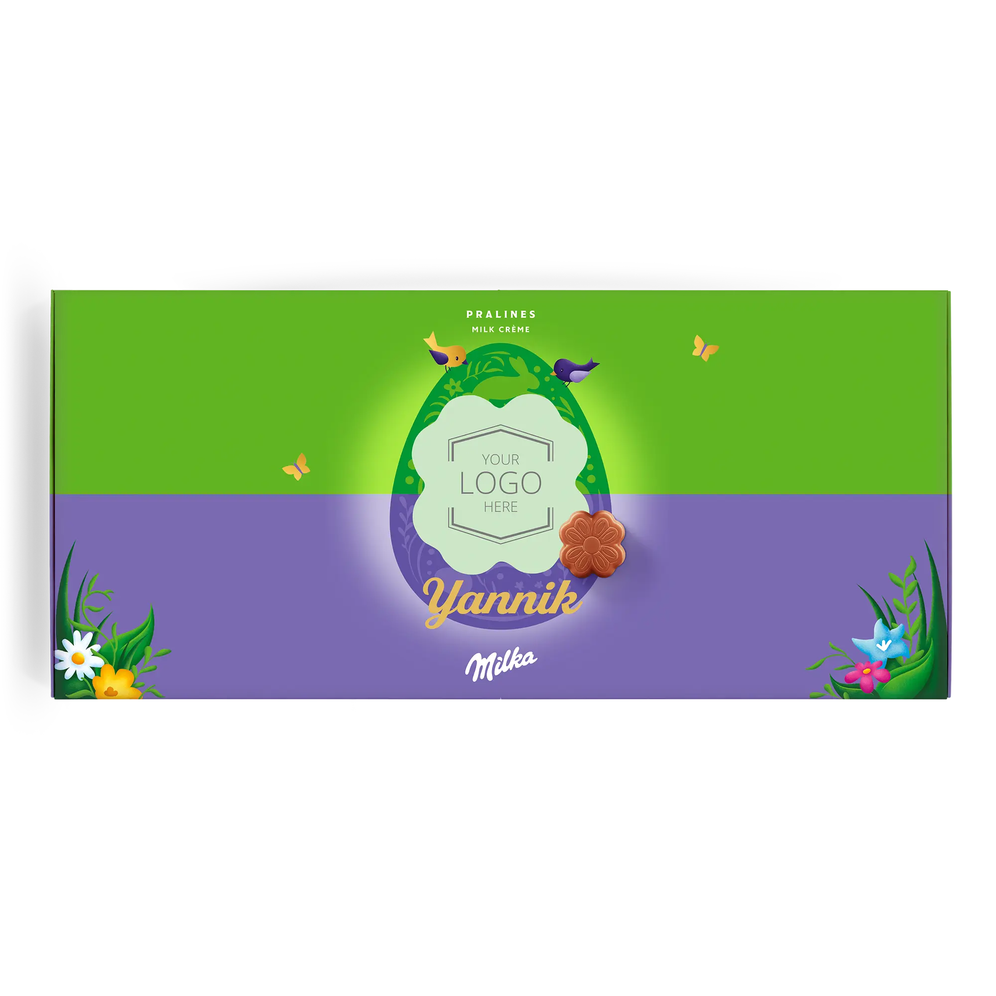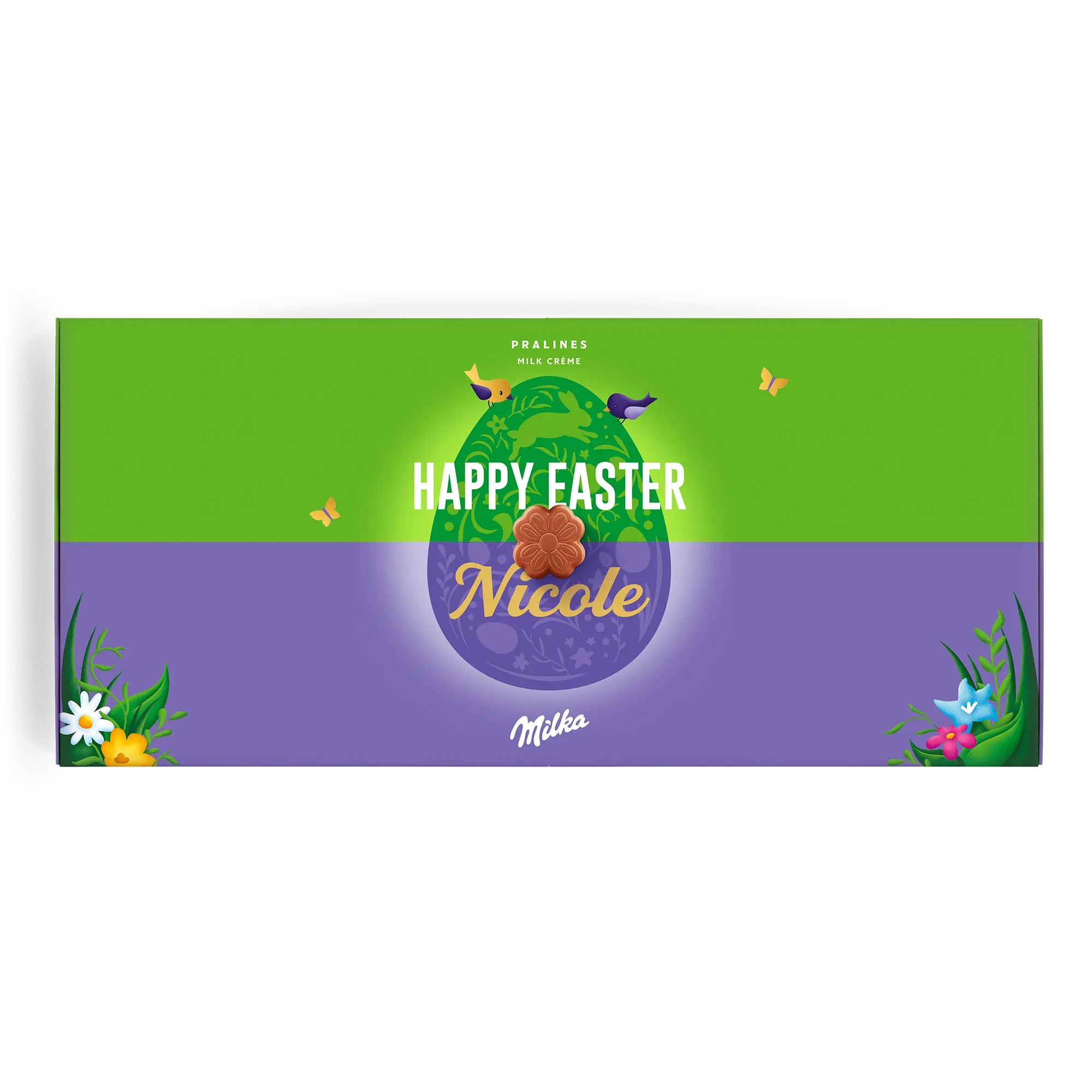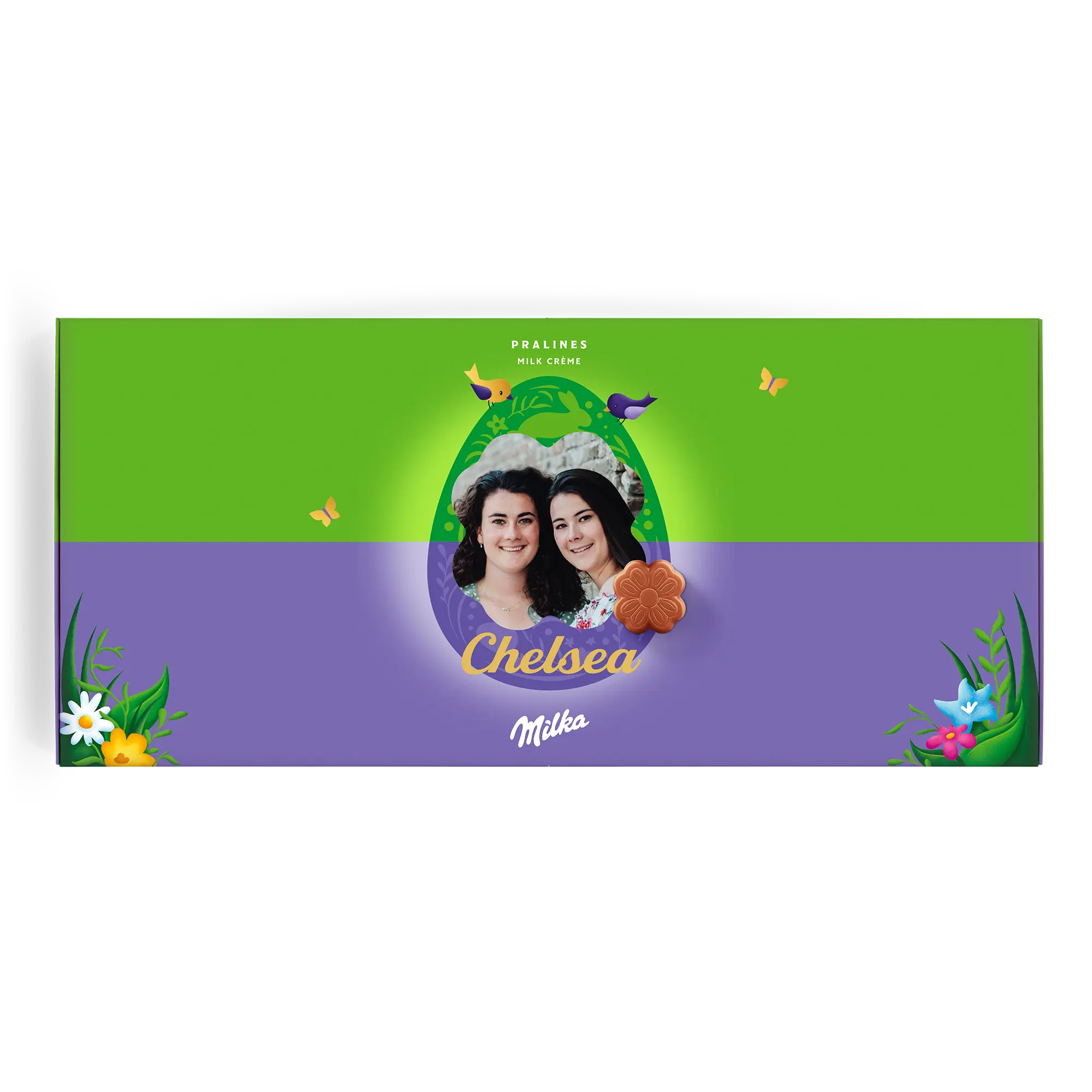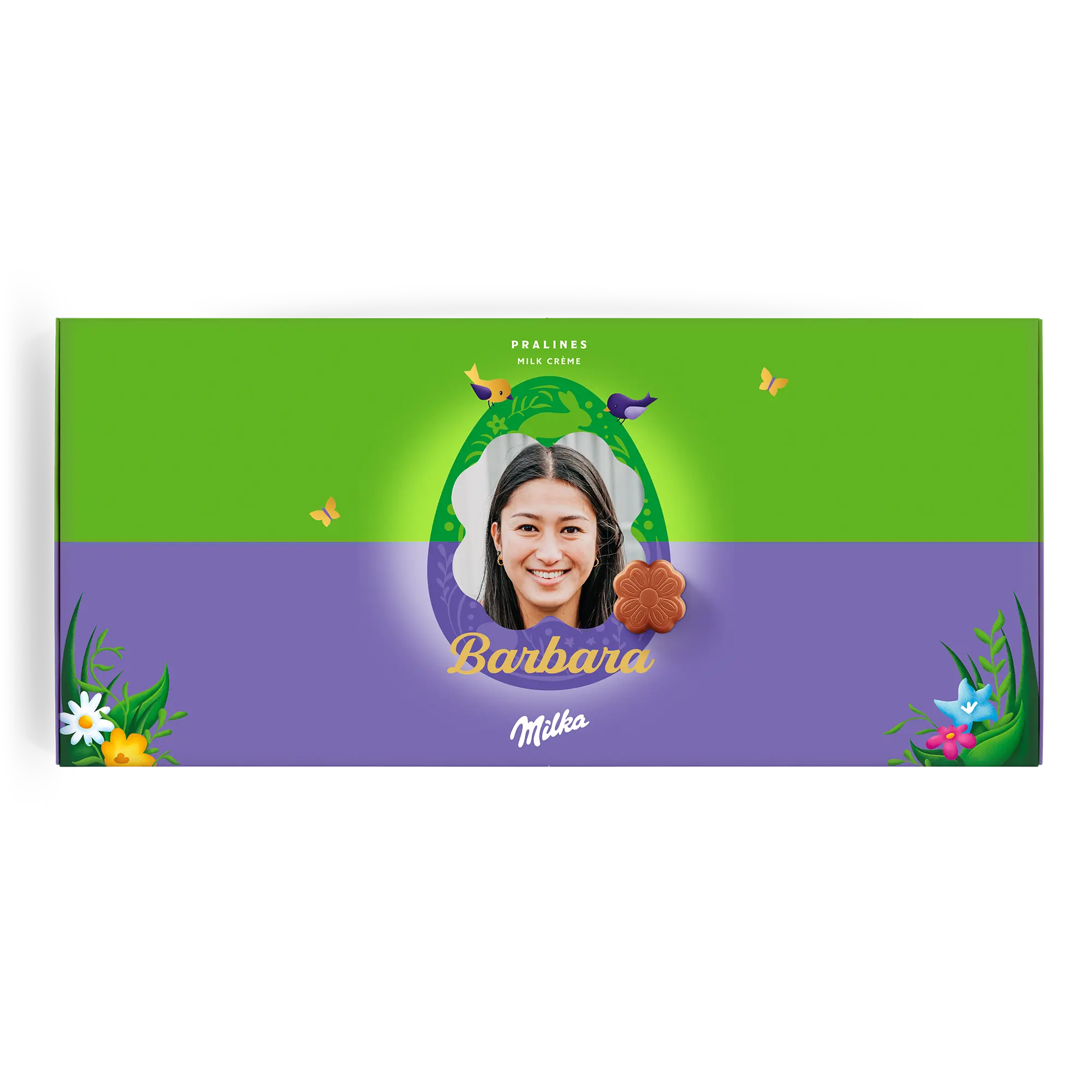 Coffret spécial Dites-le avec Milka pour Pâques. De délicieuses pralines avec nom, photo et message personnel. Surprenez vos proches !