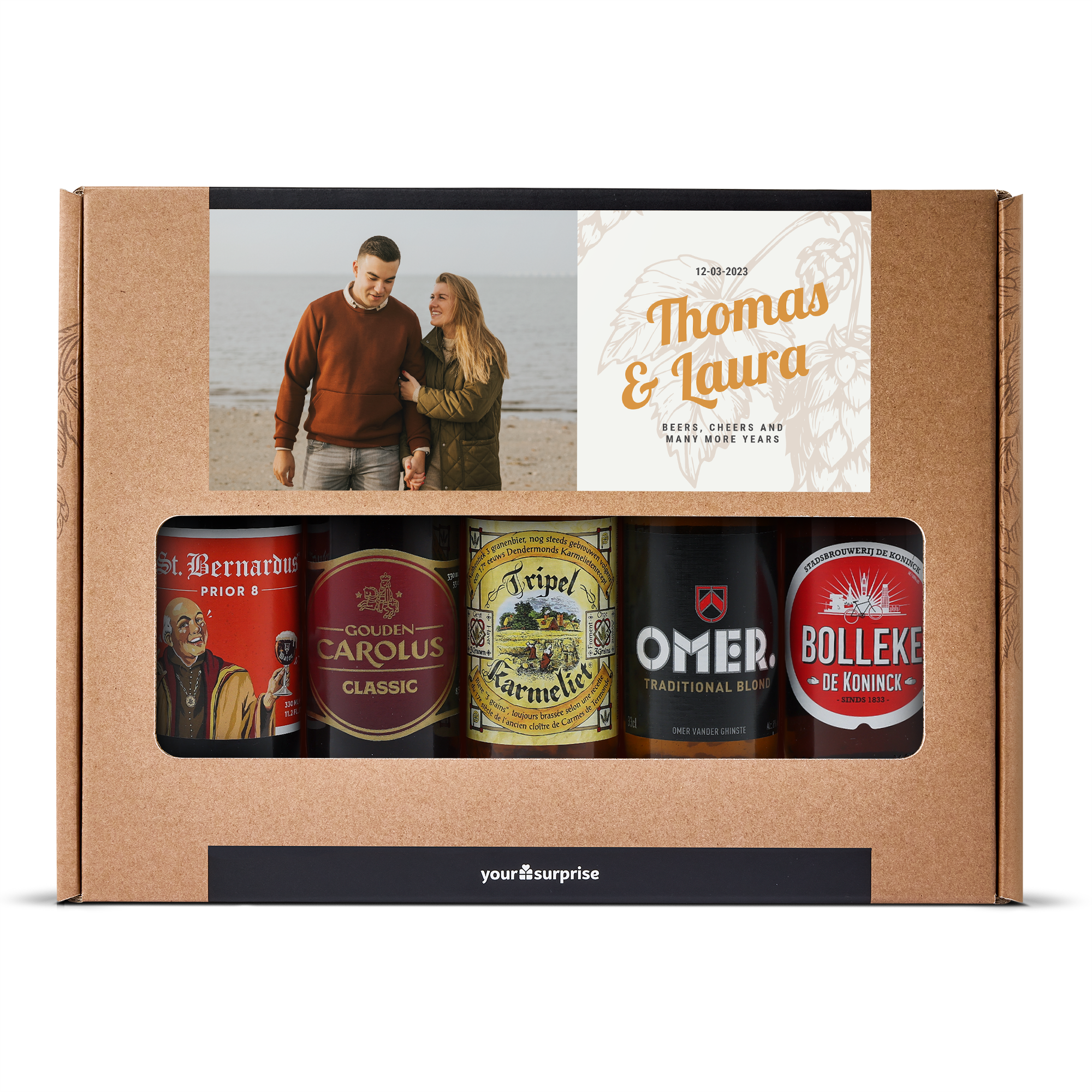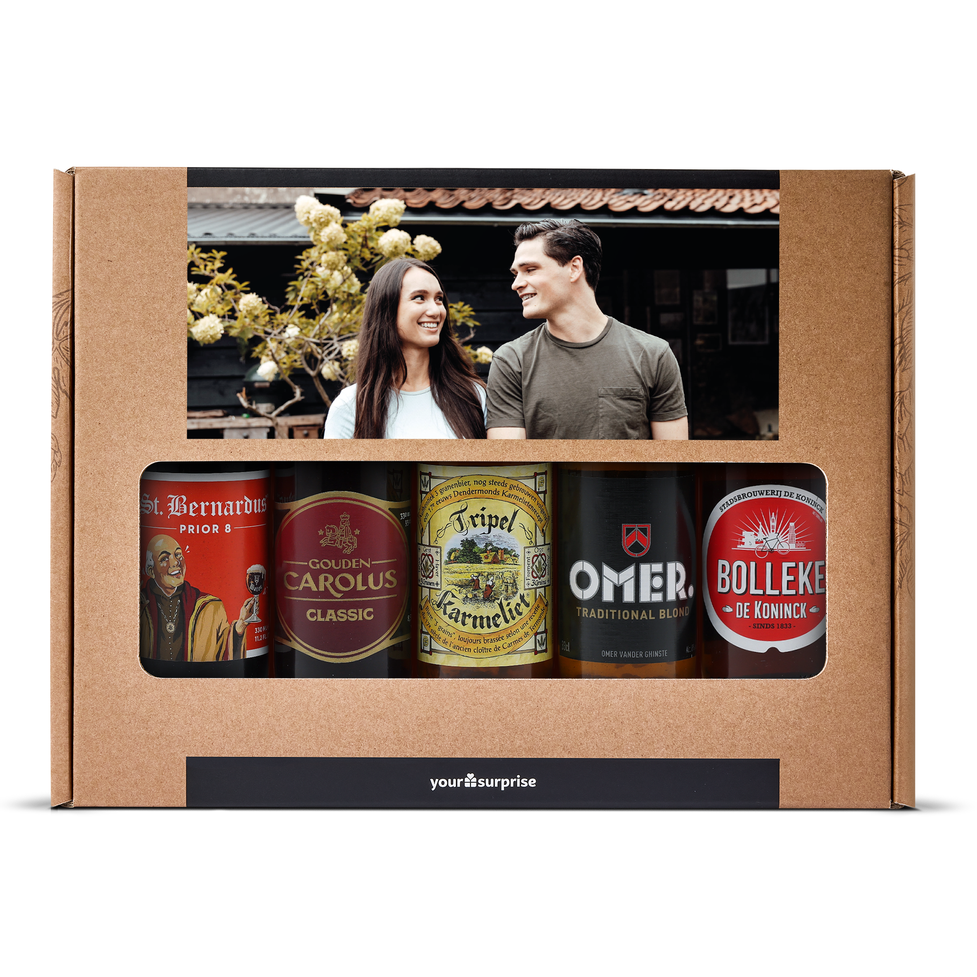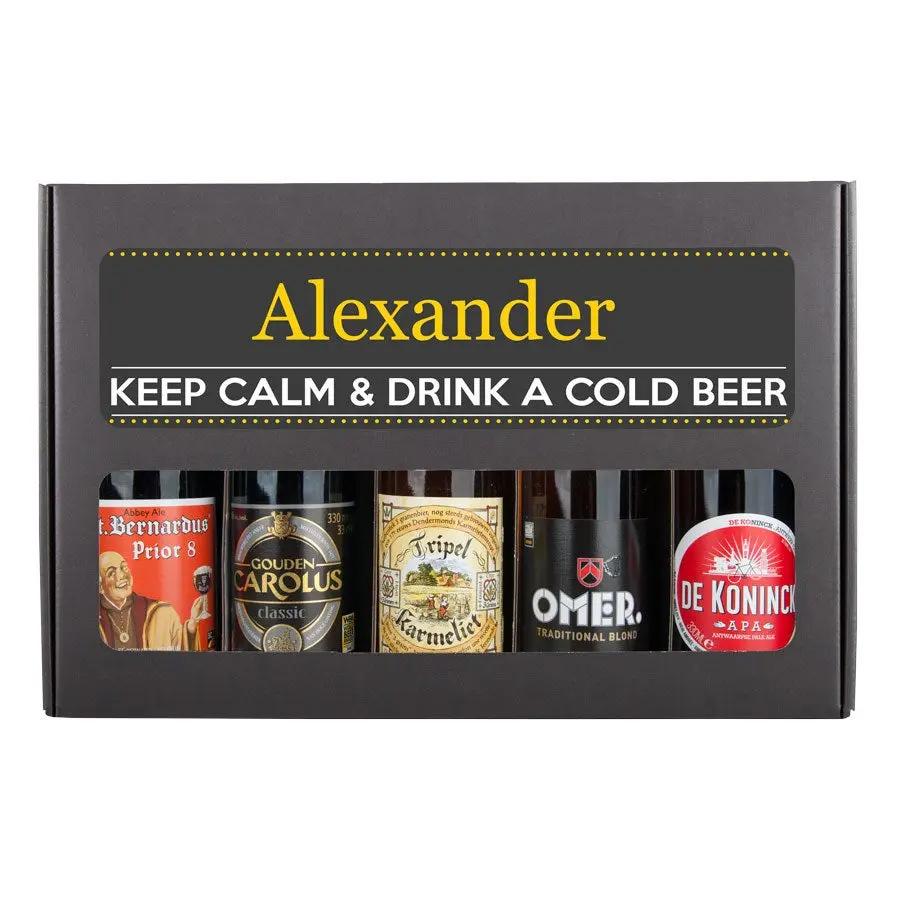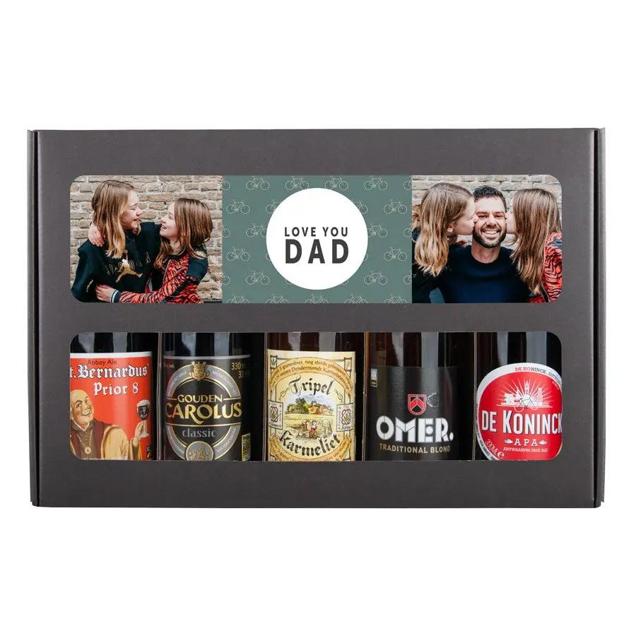 Un délicieux coffret cadeau de bières avec votre photo et votre texte, composé de 5 bières belges différentes. Avec un design personnalisé !