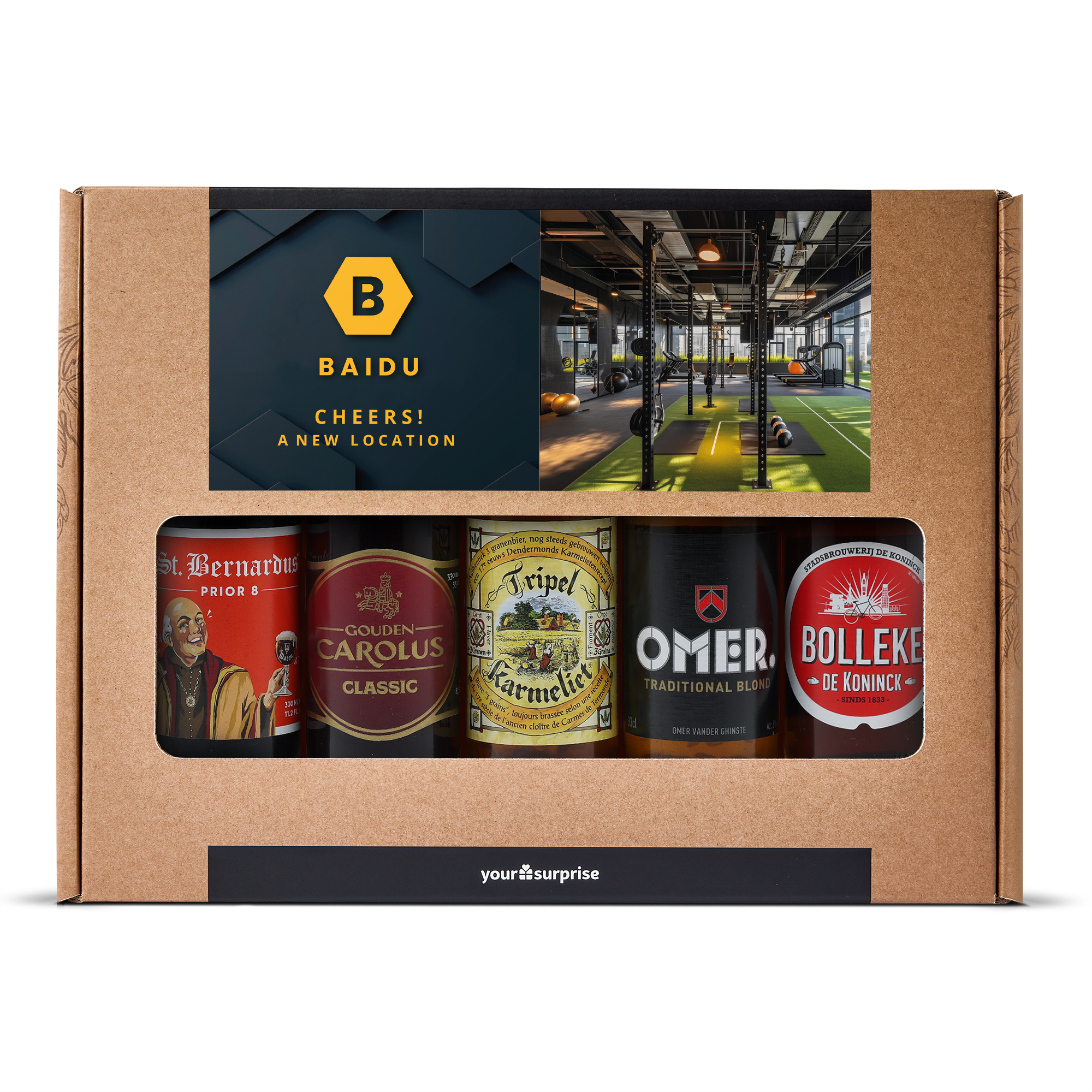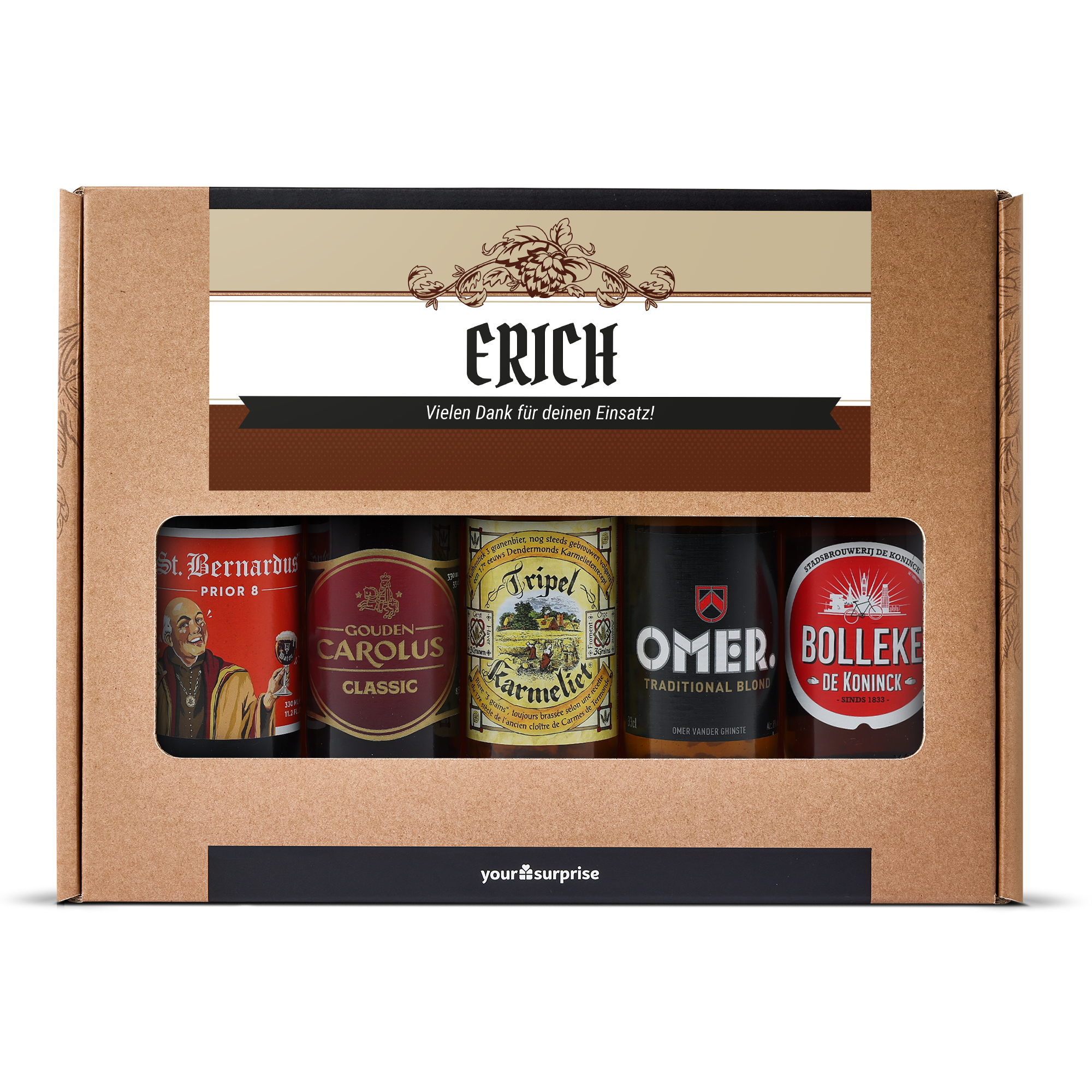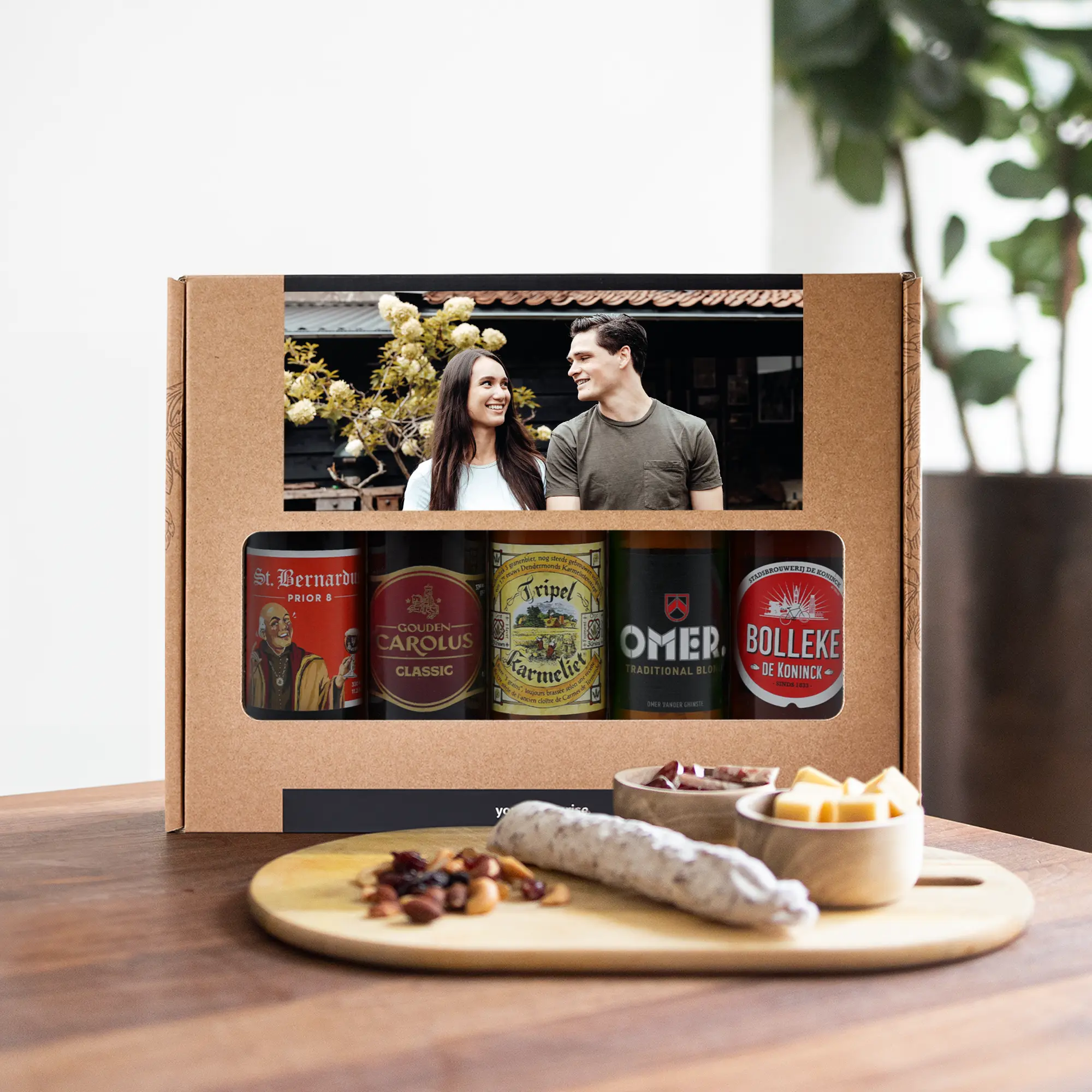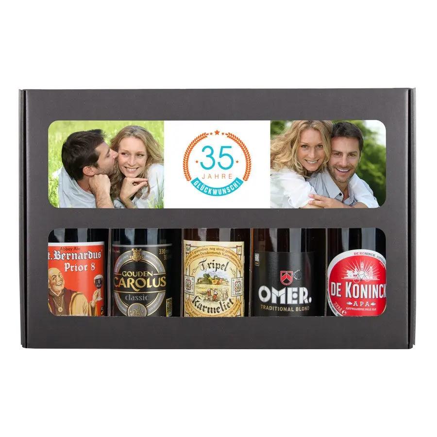 Un délicieux coffret cadeau de bières avec votre photo et votre texte, composé de 5 bières belges différentes. Avec un design personnalisé !