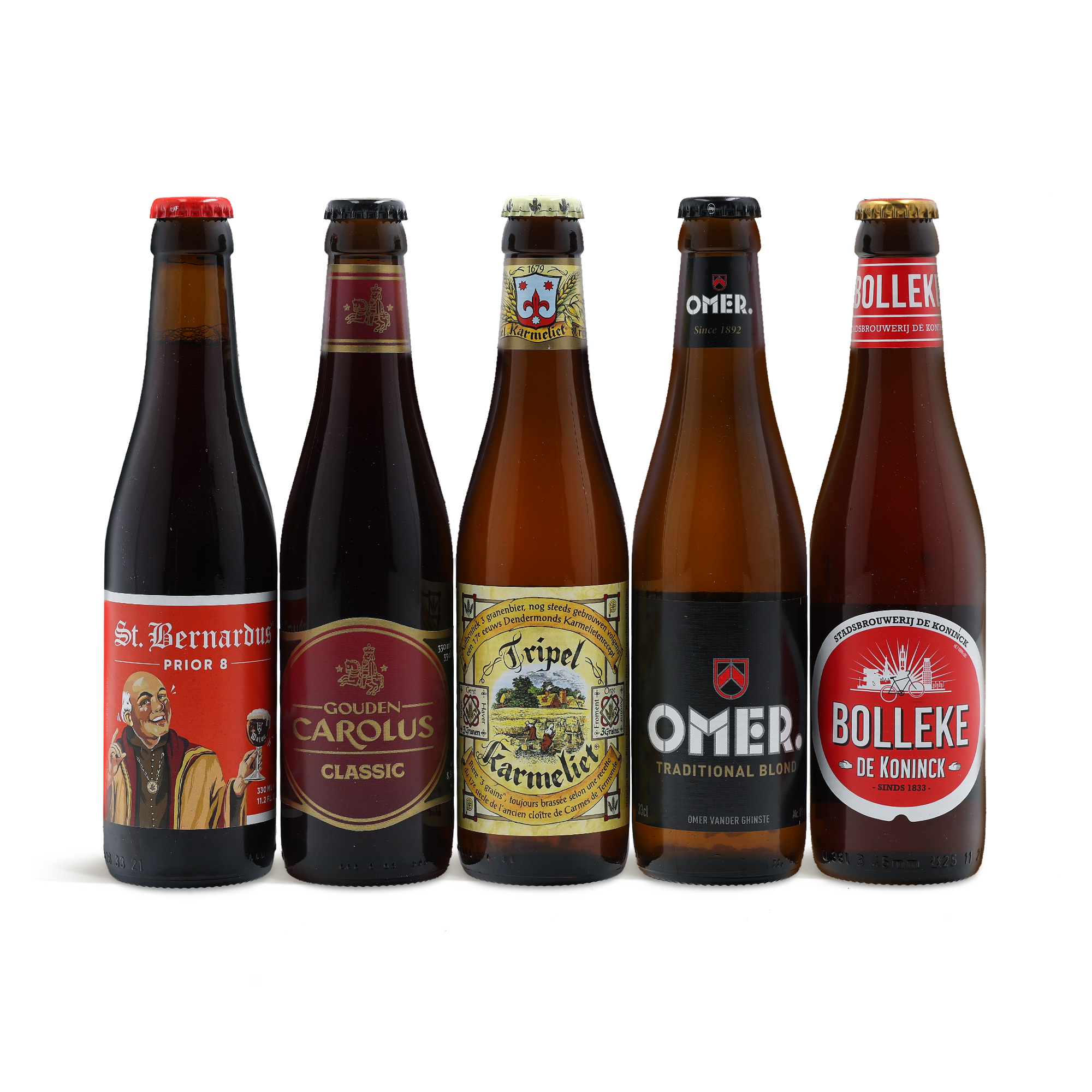 - Contenu du coffret : Gouden Carolus Classic (8,5 %), St. Bernardus (8,0 %), Omer (8,0 %), Tripel Karmeliet (8,0 %), De Koninck (5,0 %).