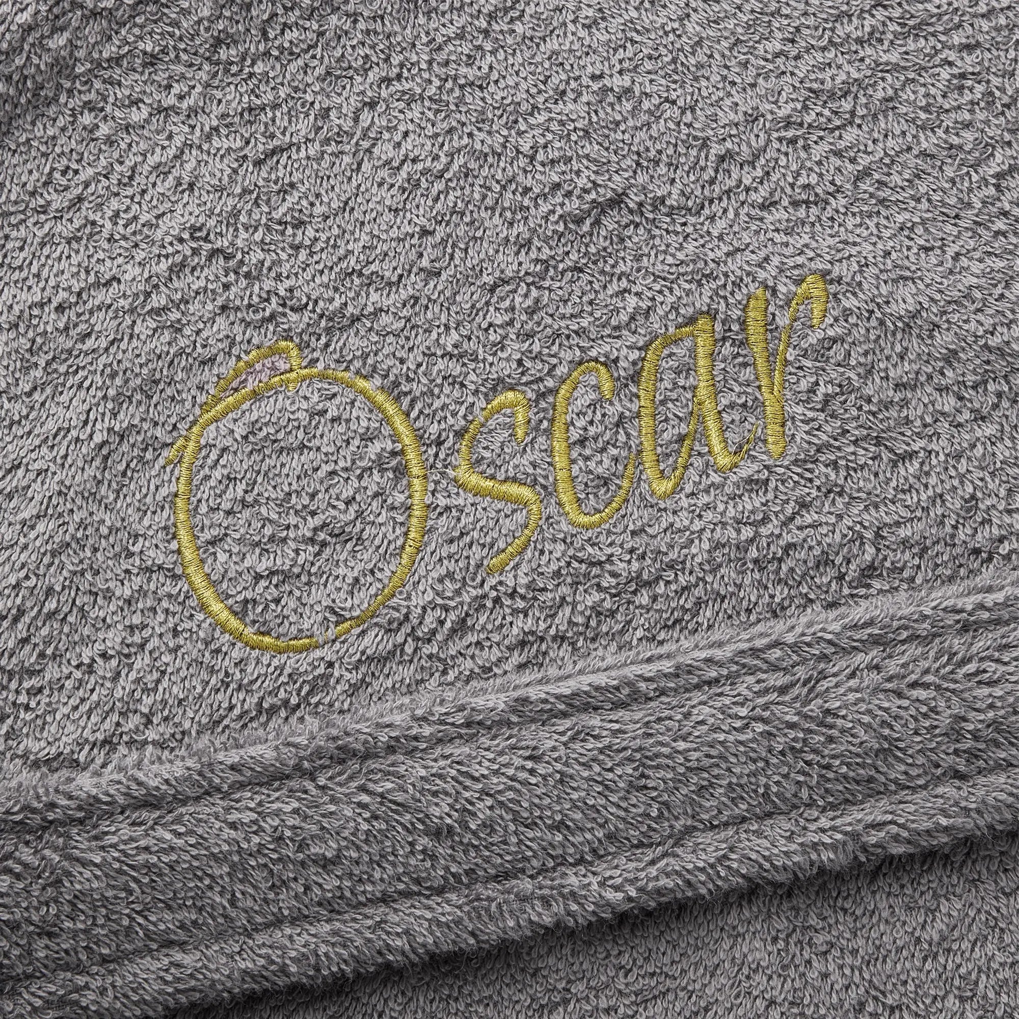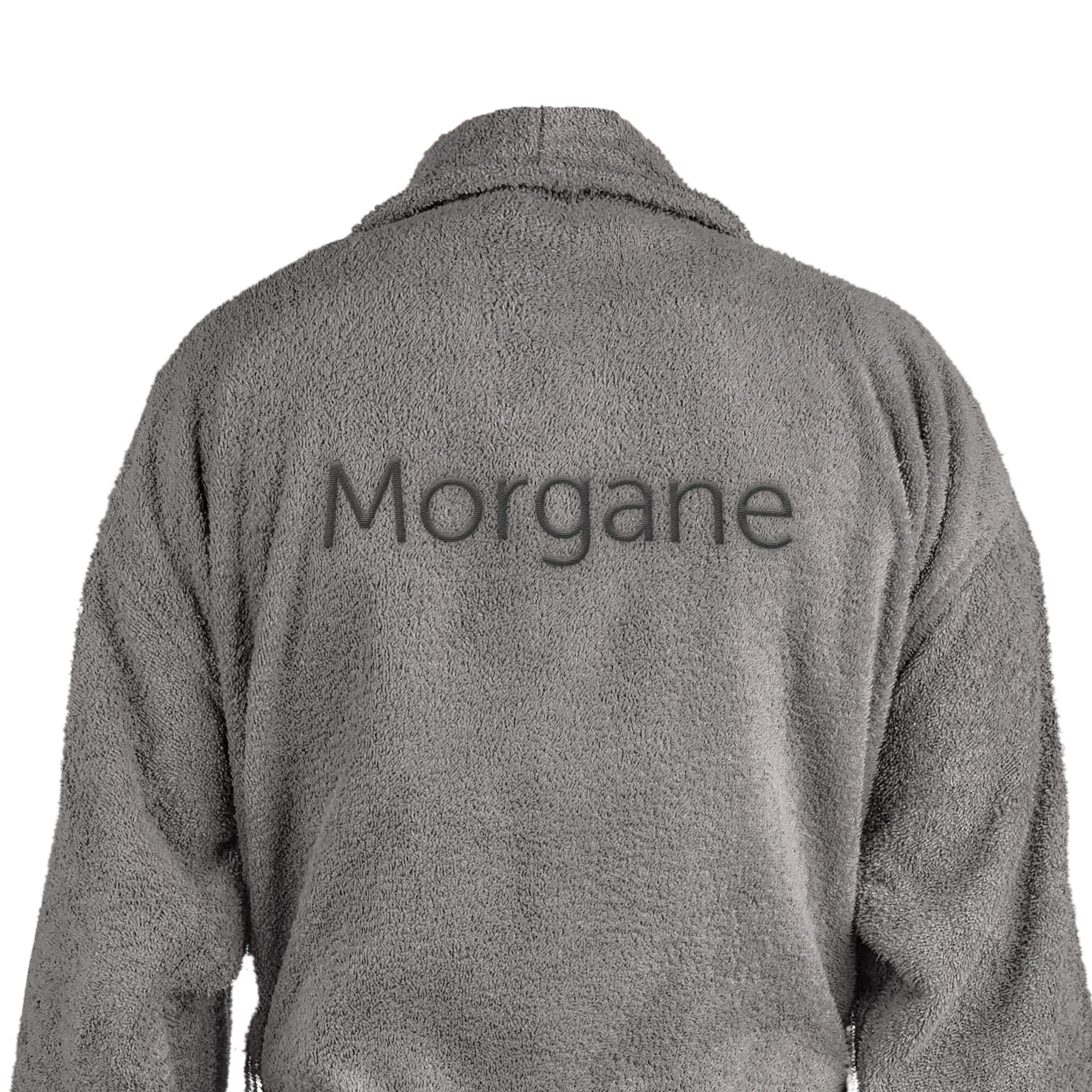 Plus d'informations sur le peignoir :Couleur : gris Modèle : Classique Matière : éponge 100% coton (380 g/m2) Taille : S/M Hauteur : 120 cm Largeur : 60 cm Longueur des manches : 54 cm Largeur des épaules : 20 cm Impression : une ligne de texte : 7x10cm (HxL) Antistatique et respirant Instructions de lavage : Laver à 60 degrés maximum.