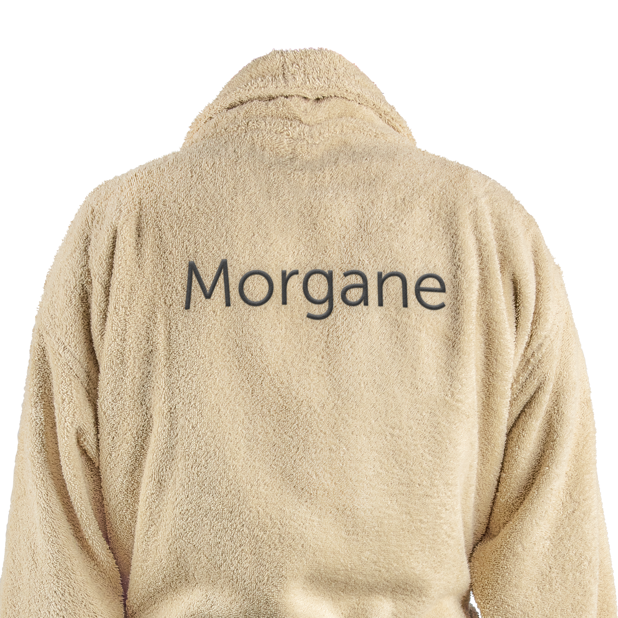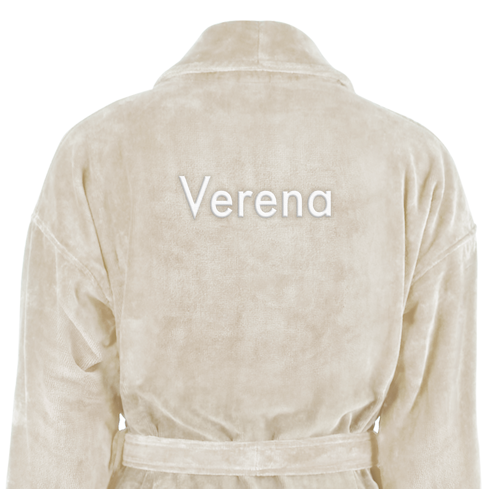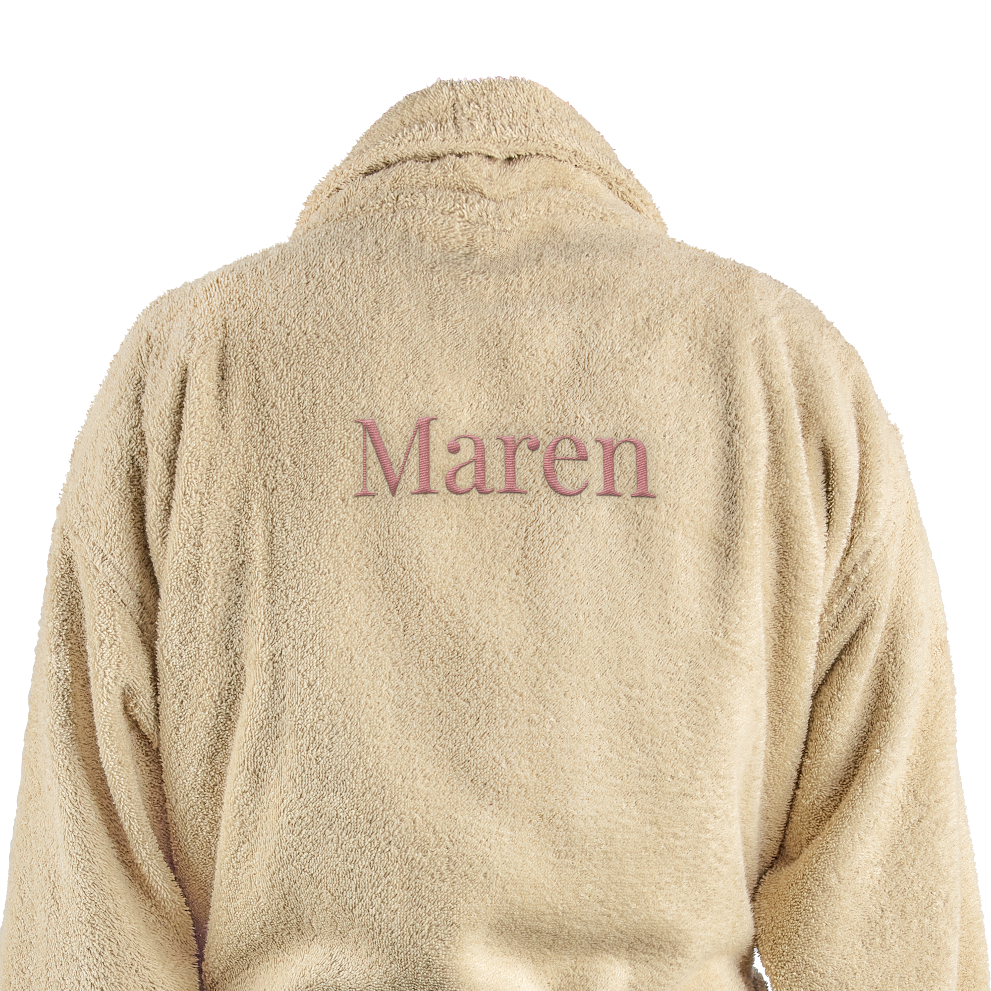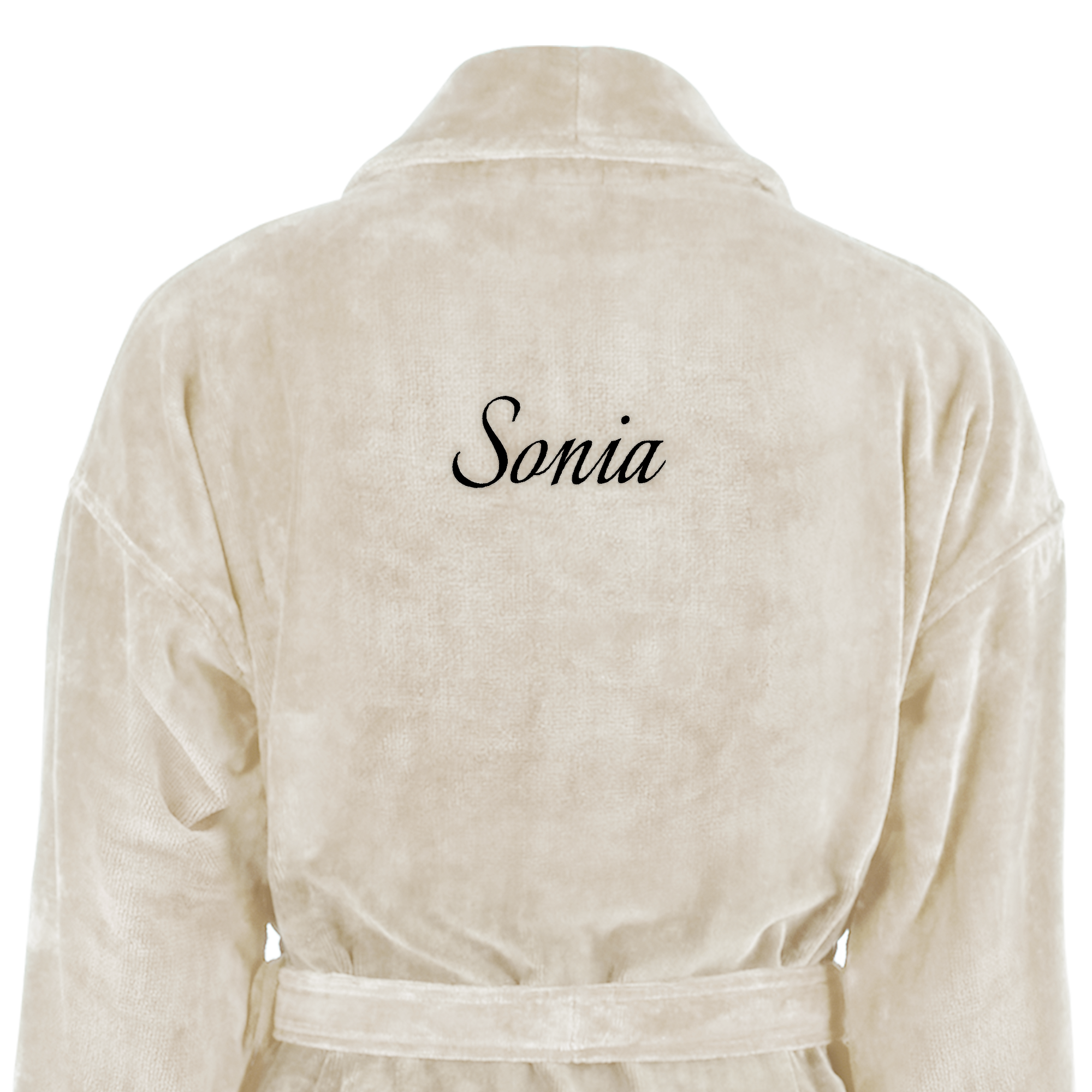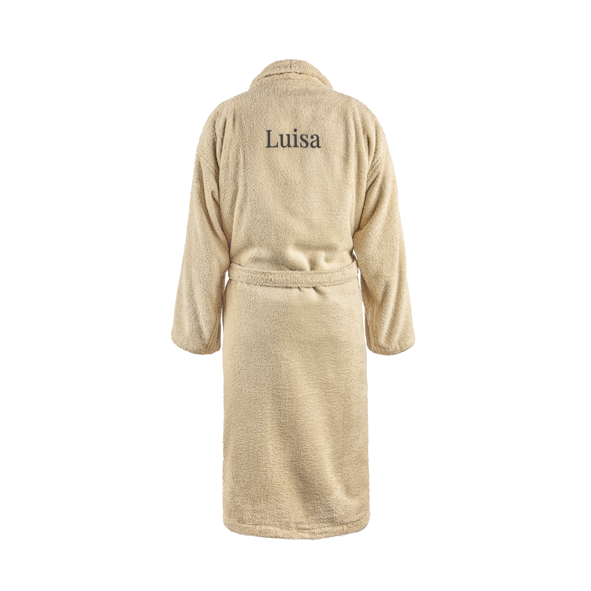 Peignoir personnalisé pour femme, brodé du nom ou du texte de votre choix. Créez le vôtre dès maintenant ! Plus d'informations sur le peignoir : - Couleur : beige Taille : S/M - Matière : 100 % coton éponge doux - Qualité : 380 gr/m² - Modèle : basique - Longueur : 120 cm - Largeur des épaules : 20 cm - Largeur du dos : 60 cm - Longueur des manches : 54 cm - Personnalisation : nom ou texte au dos - Méthode de personnalisation : broderie élégante - Informations complémentaires : tissu antistatique et respirant Conseils de lavage : lavage à 40 °C