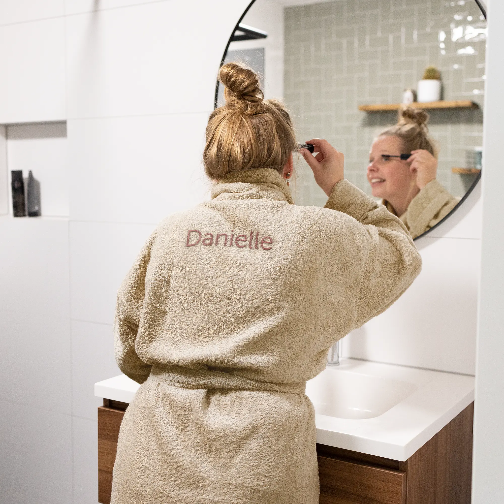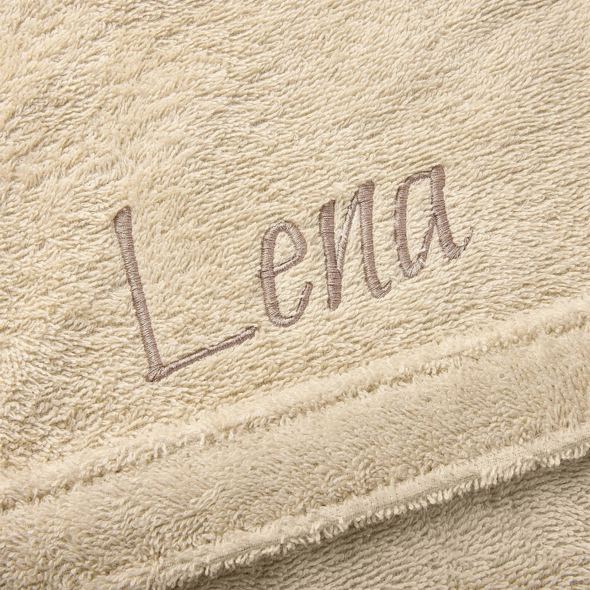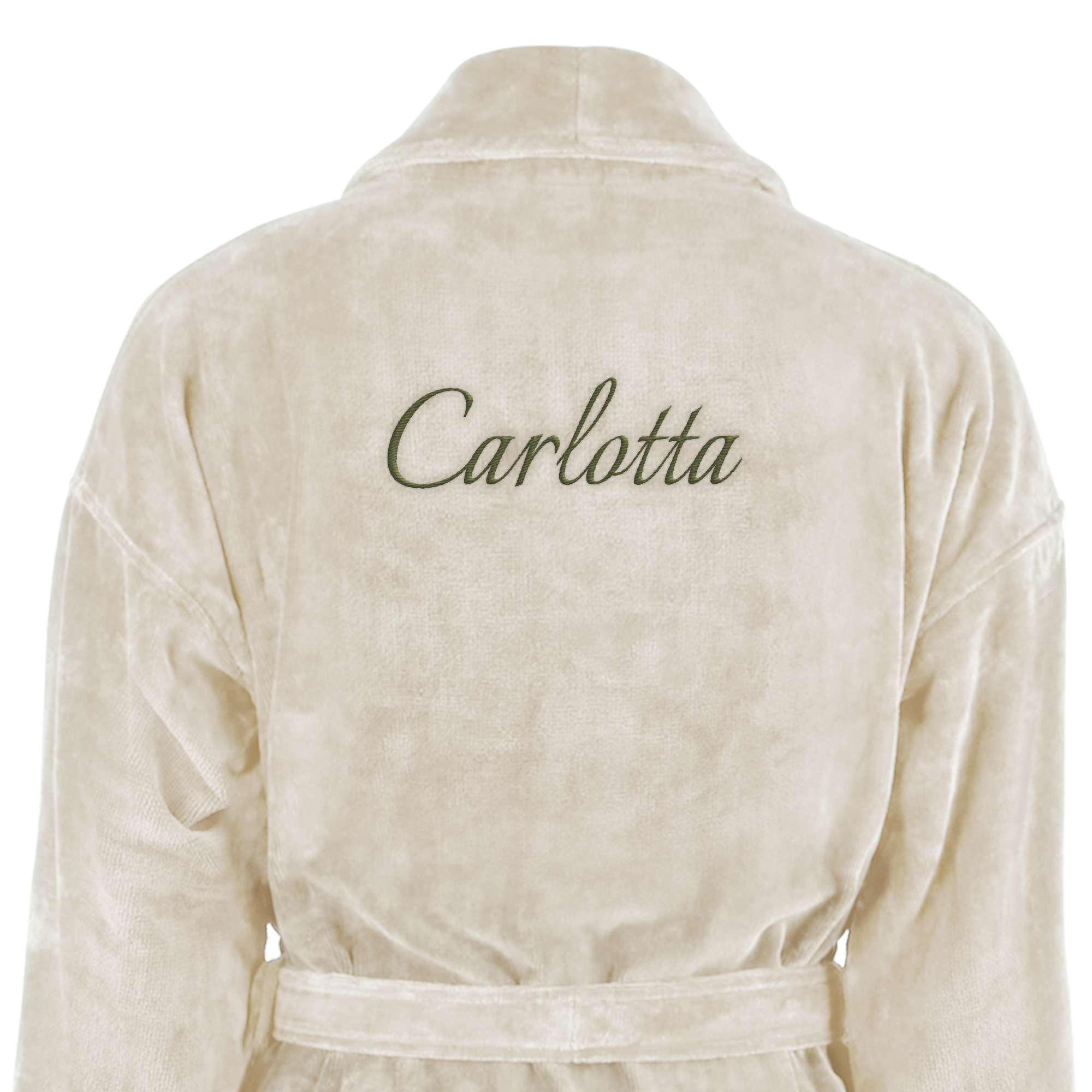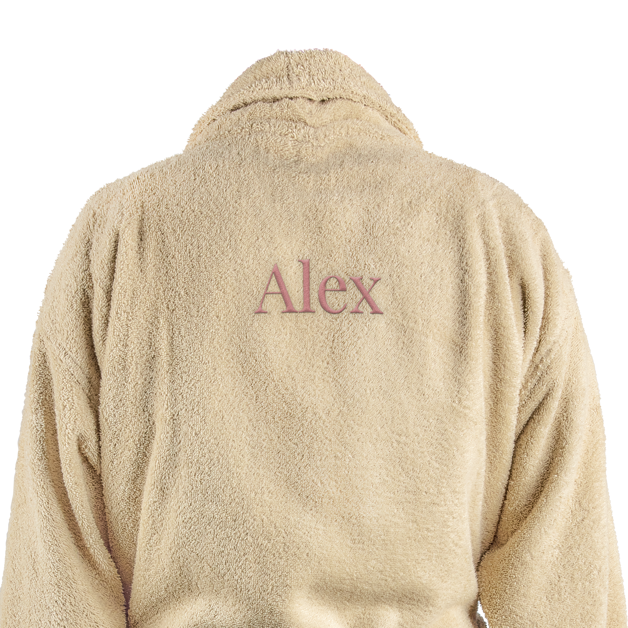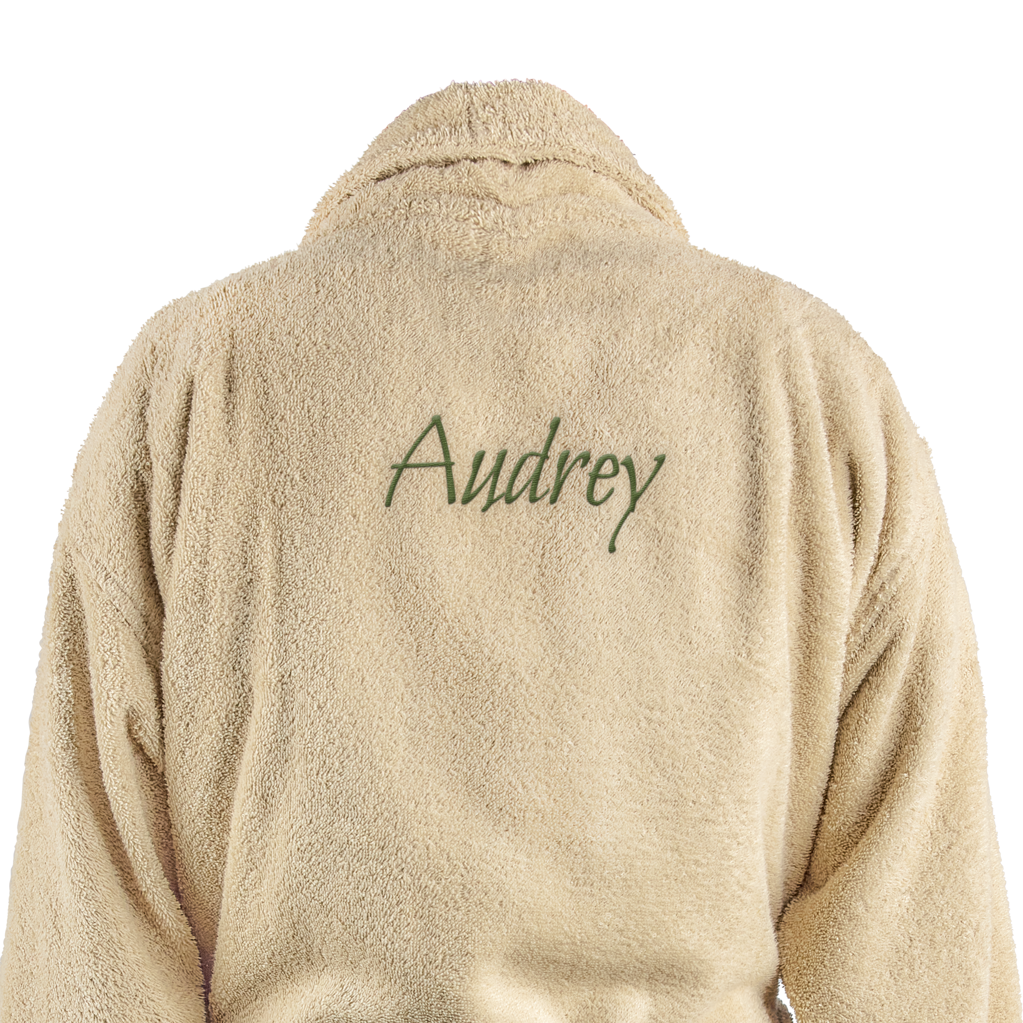 Peignoir personnalisé pour femme, brodé du nom ou du texte de votre choix. Créez le vôtre dès maintenant ! Plus d'informations sur le peignoir : - Couleur : beige Taille : S/M - Matière : 100 % coton éponge doux - Qualité : 380 gr/m² - Modèle : basique - Longueur : 120 cm - Largeur des épaules : 20 cm - Largeur du dos : 60 cm - Longueur des manches : 54 cm - Personnalisation : nom ou texte au dos - Méthode de personnalisation : broderie élégante - Informations complémentaires : tissu antistatique et respirant Conseils de lavage : lavage à 40 °C
