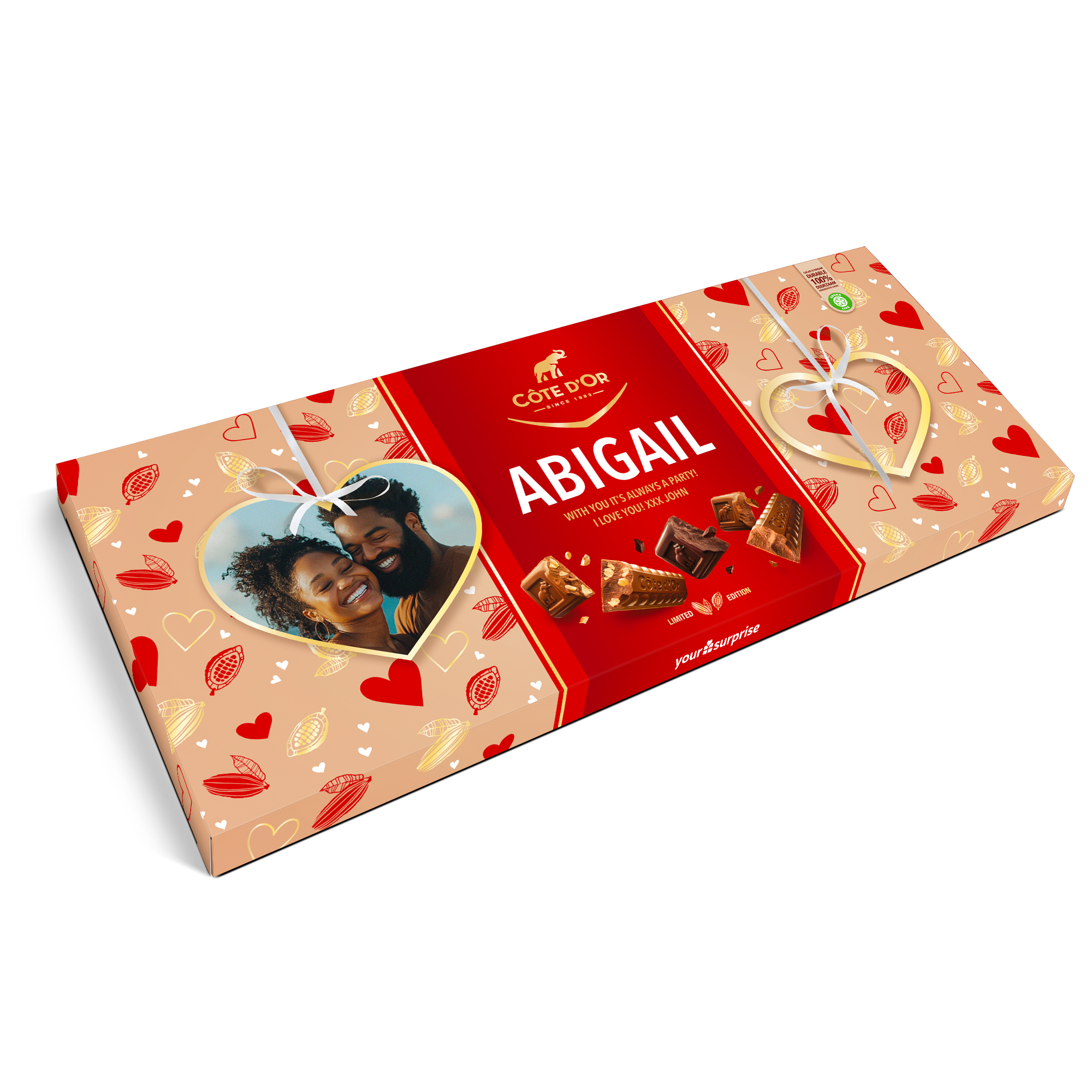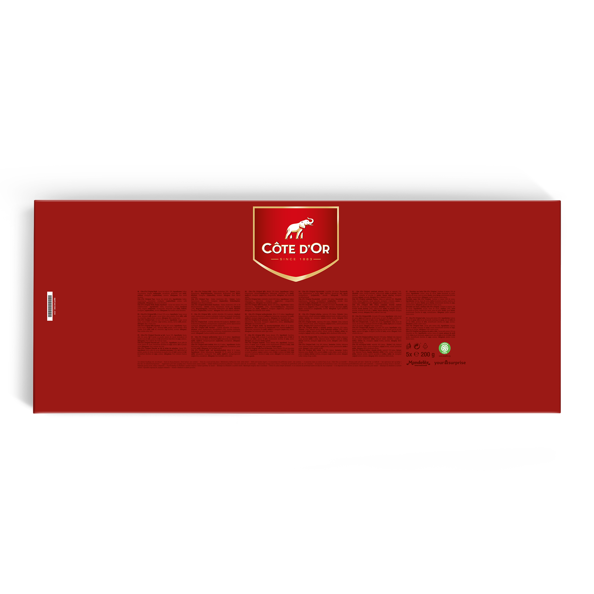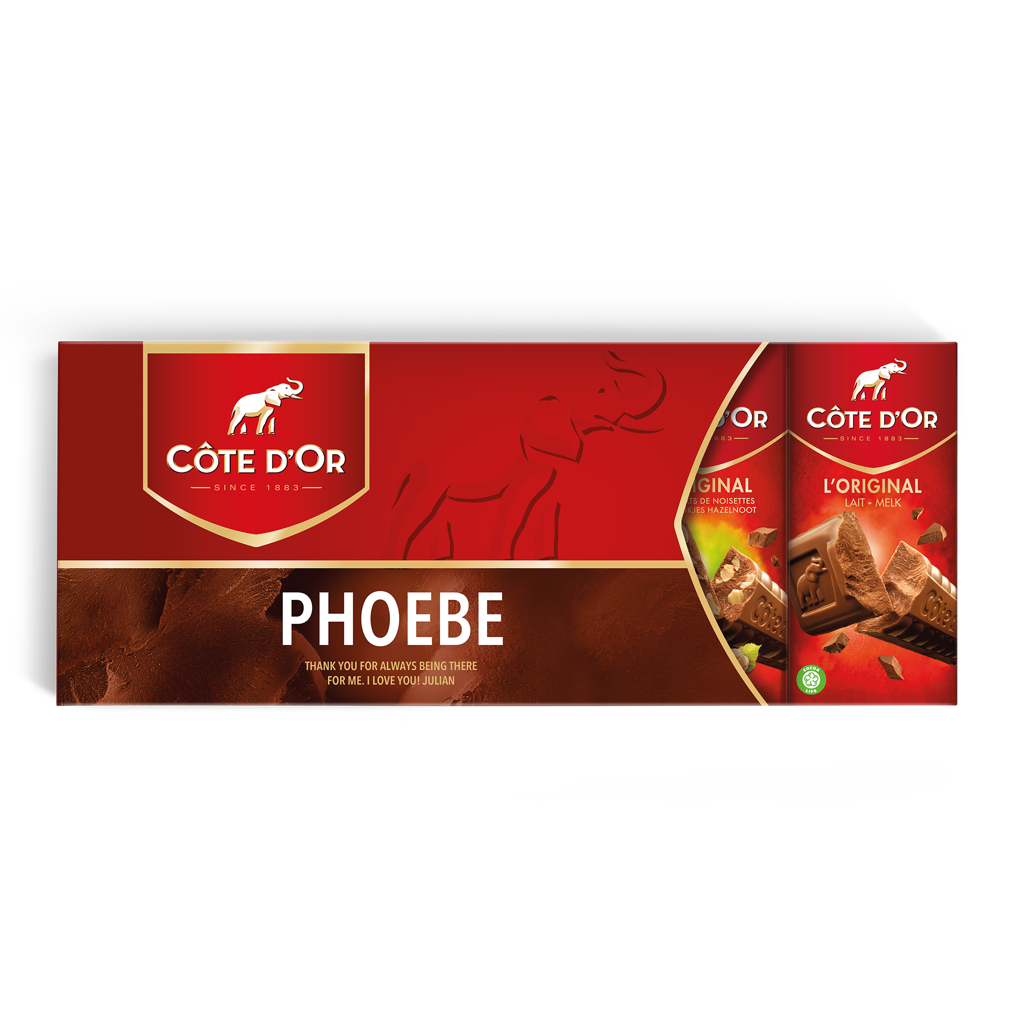 Plus d'informations sur la tablette de chocolat Côte d'Or XXL :Dimensions : 60 x 26 x 2 cmComprend : 2 tablettes Côte d'Or L' Original Milk, 2 tablettes Côte d'Or Milk & Tablettes aux noisettes et 1 tablette Côte d'Or L' Original Noir (le contenu peut varier !)Poids : 5 x 200 grammesPersonnalisation : avec nom, photo et/ou texteImpression : image parfaite et en couleurInformations complémentaires : Pour des raisons techniques, il n'est pas possible d'ajouter des caractères cyrilliques, grecs, asiatiques, arabes, turcs ou spéciaux.Information importante : Si une saveur spécifique est temporairement en rupture de stock, nous remplirons la tablette XXL Côte d'Or avec d'autres saveurs.Côte d'Or L' Original LaitAu moins 33 % de cacao.Ingrédients : Sucre, pâte de cacao, lait écrémé en poudre, beurre de cacao, lactosérum en poudre (de lait), matière grasse laitière, émulsifiant (lécithine de soja), arômes.Allergènes : Peut contenir des fruits à coque.Côte d'Or L' Original NoirAu moins 46 % de cacao.Ingrédients : Sucre, pâte de cacao, beurre de cacao, émulsifiant (lécithine de soja), arômes, Lait entier en poudre.Allergènes : Peut contenir des fruits à coque.Côte d'Or L'Original Lait NoisetteAu moins 33% de cacao.Ingrédients : Sucre, pâte de cacao, noisette (14%), lait écrémé en poudre, cacao en poudre, lactosérum en poudre (de lait), matière grasse du lait, émulsifiant (lécithine de soja), arômes.Allergènes : Peut contenir d'autres fruits à coque.Attention : Lorsque la température extérieure est de 25 degrés Celsius ou plus, nous ne serons pas en mesure de garantir la qualité du chocolat.