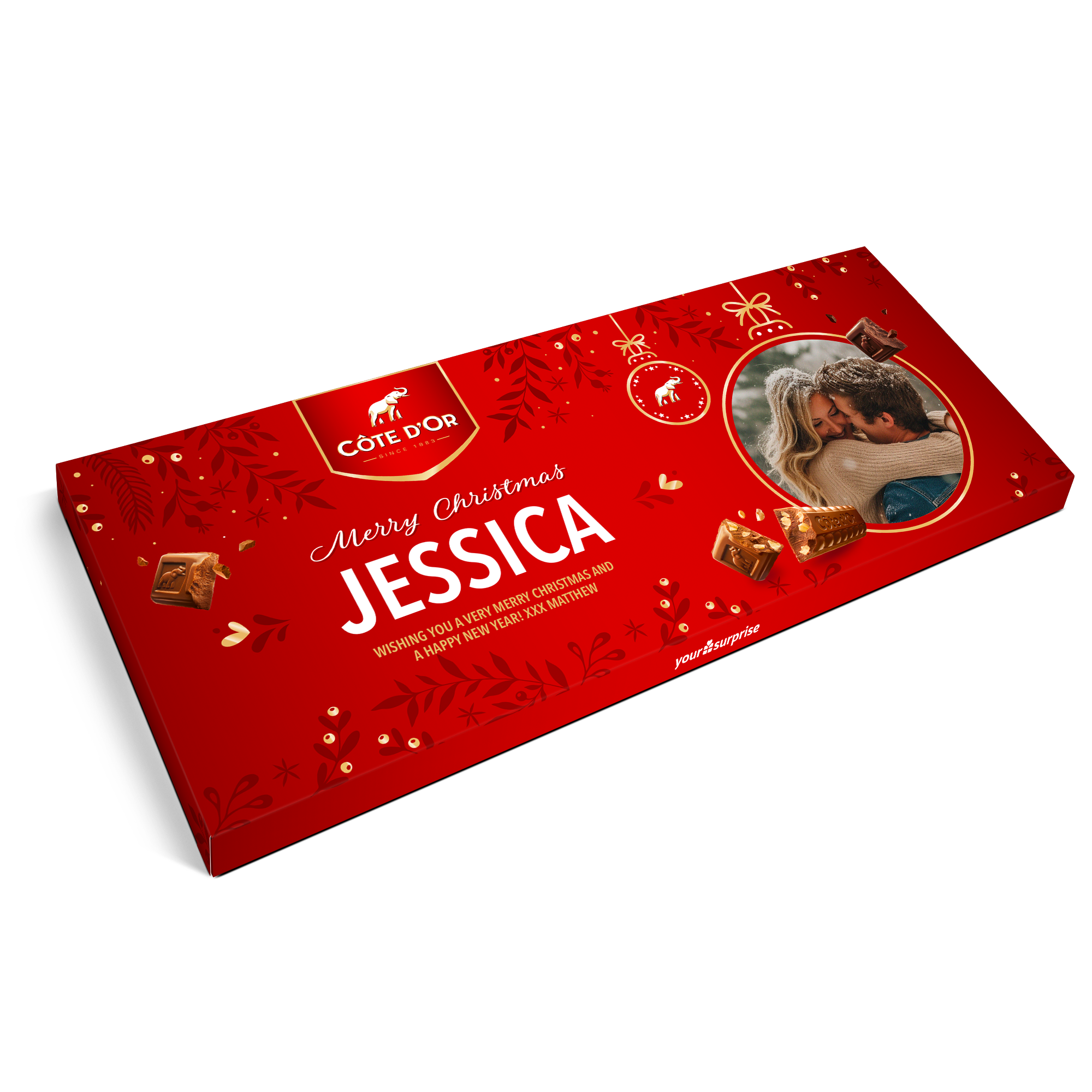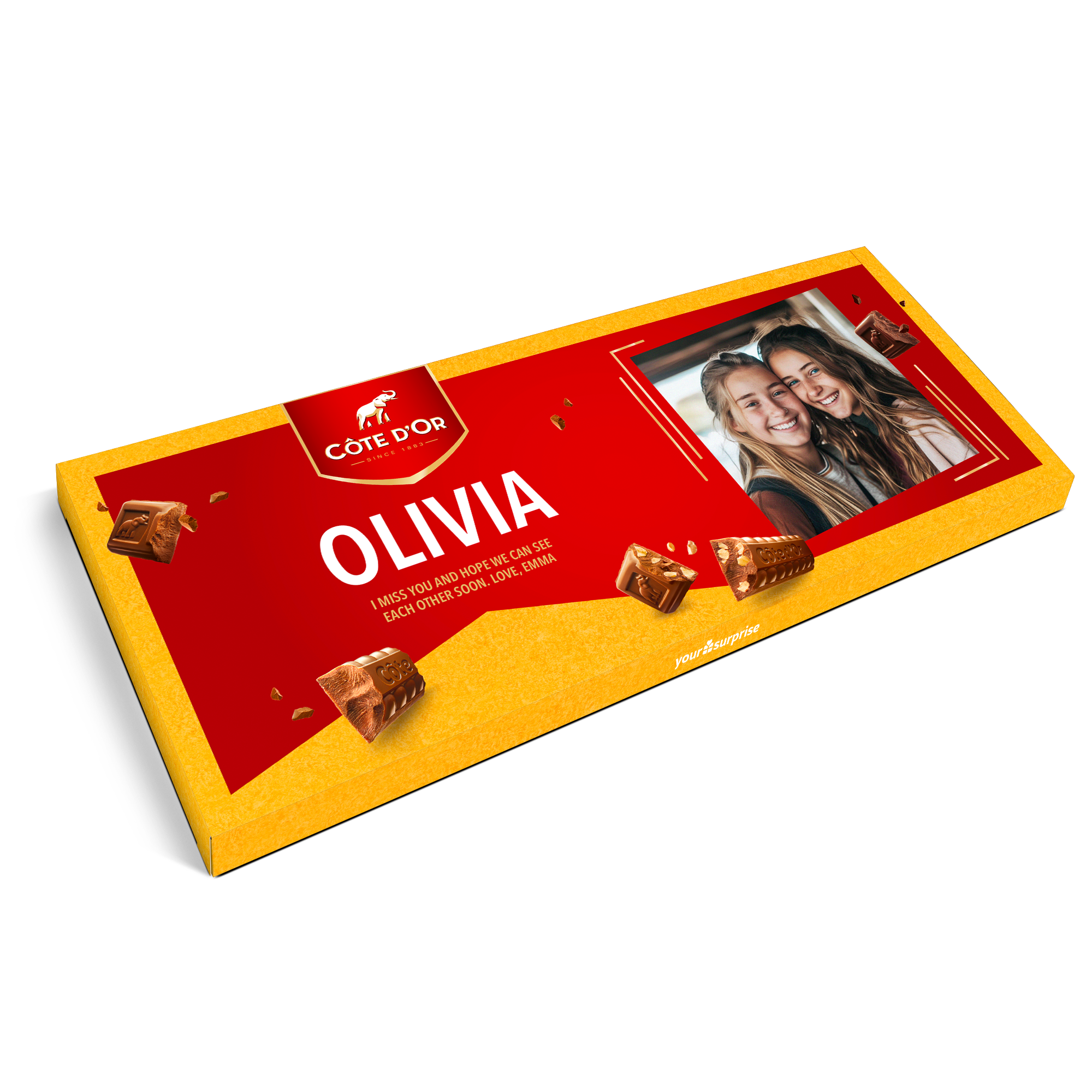 Cette tablette de chocolat belge Côte d'Or XXL contient pas moins de 5 tablettes de chocolat Côte d'Or. Vraiment unique avec la photo et/ou le nom de votre choix !