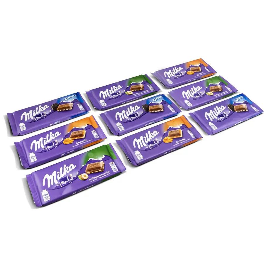 Plus d'informations sur la barre de chocolat de Noël XXL :Dimensions : 60 x 26 x 2 cmComprend : 3 barres Milka Oreo, 3 barres Milka Noisette et 3 barres Milka Caramel (le contenu peut varier !)Poids : 100 grammes par barre de chocolat MilkaPersonnalisation : avec nom, photo et/ou texteImpression : image parfaite et en couleurInformation importante : si une saveur spécifique est temporairement en rupture de stock, nous remplirons la barre de Noël XXL avec d'autres saveurs.Milka Caramel - Chocolat au lait alpin fourré à la crème de lait (35 %) avec arôme caramel et fourrage caramel (15 %)Ingrédients : sucre, graisse de palme, beurre de cacao, lactosérum en poudre (de lait), lait écrémé en poudre, sirop de glucose, pâte de cacao, matière grasse du lait, sirop de glucose-fructose, émulsifiants (lécithine de soja, E471), pâte à tartiner aux noisettes, arômes, sel Allergènes : Contient du lait, du soja, des noisettes. Peut contenir : fruits à coque, blé, céréales contenant du gluten Milka Oreo - Chocolat au lait alpin avec des morceaux de biscuits au cacao (12 %) et un fourrage à la crème de lait alpin (40 %) au goût de vanille Ingrédients : sucre, matières grasses végétales (palme, palmiste), beurre de cacao, lait écrémé en poudre, lactosérum en poudre (de lait), farine de blé, pâte de cacao, matière grasse du lait, cacao maigre en poudre (0,7 %), émulsifiants (lécithine de soja, lécithine de tournesol), pâte de noisettes, sirop de glucose-fructose, amidon de blé, poudres à lever (bicarbonate de potassium, bicarbonate d'ammonium, bicarbonate de sodium), sel, arômes. Allergènes : Contient du blé, du lait, des céréales contenant du gluten, des noisettes, du soja. Peut contenir : noix Milka Noix cassée - Chocolat au lait alpin avec morceaux de noisettes cassées Ingrédients : sucre, beurre de cacao, lait écrémé en poudre, pâte de cacao, morceaux de noisettes (9%), lactosérum en poudre (lait), matière grasse du lait, émulsifiant (lécithine de soja), pâte de noisettes, arôme naturel. Allergènes : Contient : soja, noisette, lait. Peut contenir : noix, blé, céréales contenant du gluten. Remarque : lorsque la température extérieure est de 25 degrés Celsius ou plus, nous ne pourrons pas garantir la qualité du chocolat.