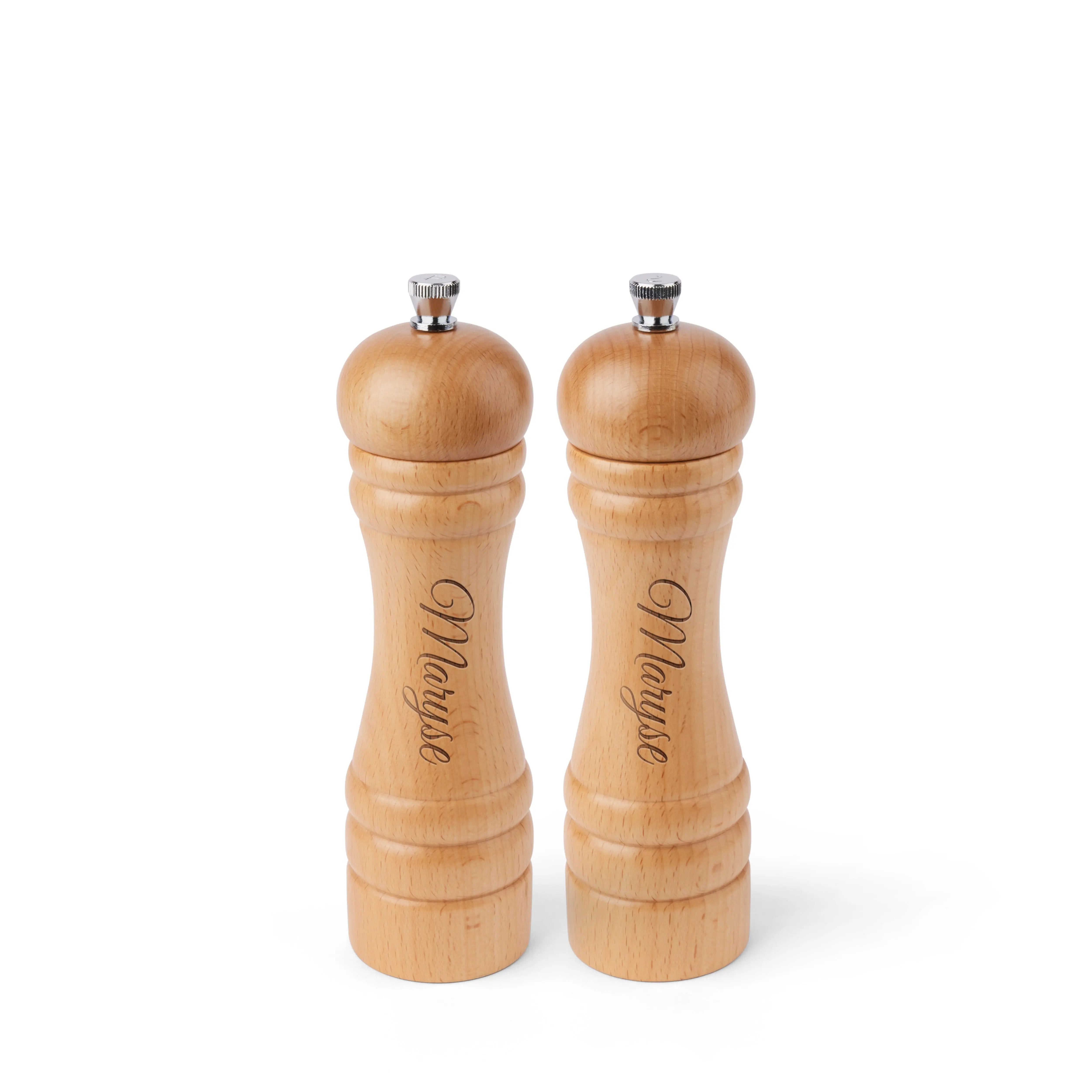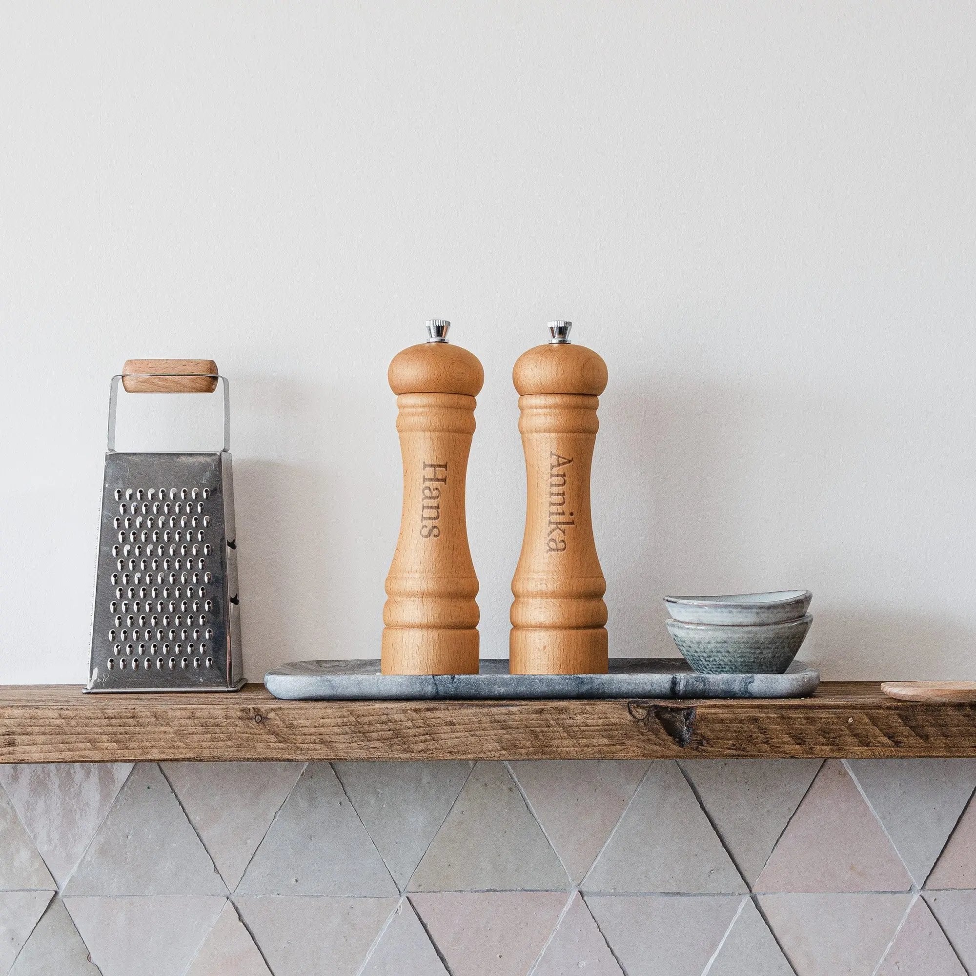 Le cadeau idéal pour tout amateur de cuisine. Un ensemble unique de moulins à sel et à poivre, personnalisé avec le nom ou le texte de votre choix.