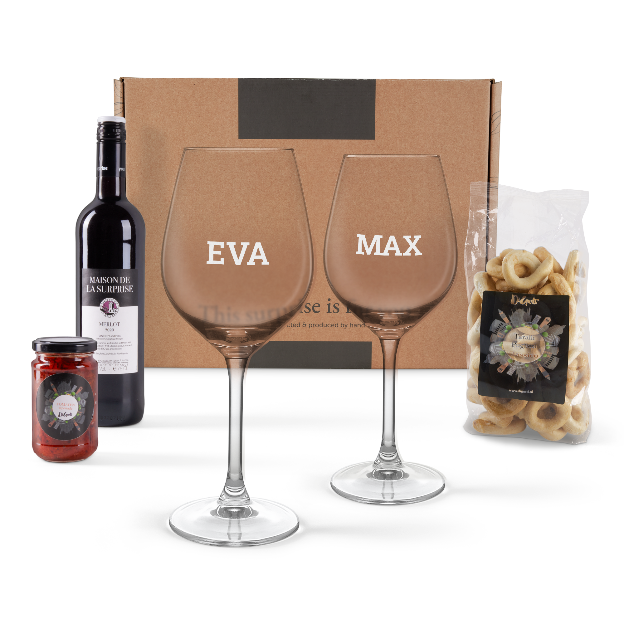 Plus d'informations sur le coffret vin et amuse-gueules Coffret cadeau snacks :Comprend : crackers (350 grammes), tapenade de tomates (212 ml), bouteille de Maison de la Surprise Merlot, deux verres à vin personnalisésDimensions du coffret cadeau : 39 x 30 x 11,5 cmPlus d'informations sur les verres à vin rouge :Quantité : 2Marque : Royal LeerdamType : L'EspritDiamètre : 8,5 cmHauteur : 20,5 cmPoids : 180 grammesCapacité : 37 clPersonnalisation : nom ou texteMéthode de personnalisation : gravure laser de haute qualitéCouleur de la gravure : blanc, votre cadeau peut donc différer légèrement de l'image d'aperçuInformations complémentaires : les verres sont personnalisables individuellement et passent au lave-vaissellePlus d'informations sur le vin :Marque : Maison de la Surprise MerlotType de vin : rouge, onctueux et fruitéContenu : 750 mlPays d'origine : FranceCépage : merlotCaractère : Le Merlot Maison de la Surprise présente des notes intenses de fruits noirs et une pointe de vanille. Excellent avec la volaille et les viandes rôties.Ingrédients tapenade de tomates (DiGusti) : tomates séchées au soleil, huile de tournesol, sel, vinaigre (sulfites), ail, arômes.Ingrédients crackers (DiGusti) : farine type ''0'', vin blanc, huile de tournesol, huile d'olive extra vierge, sel.Allergènes : Contient des céréales avec gluten et sulfites. Peut contenir des traces de graines de sésame.