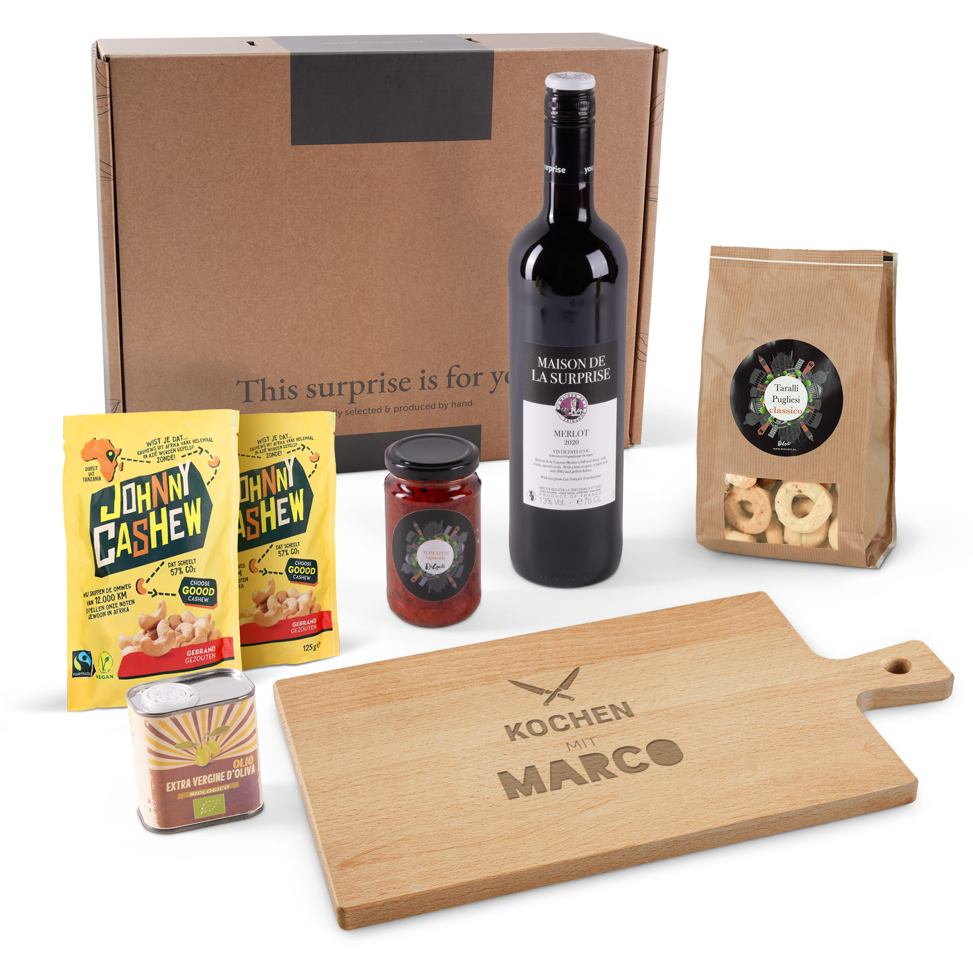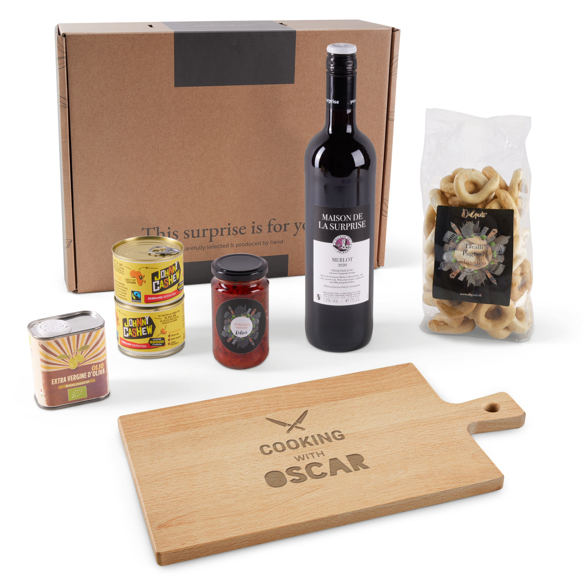 Plus d'informations sur le vin et Coffret cadeau snacks : Comprend : un plateau de service en bois, de l'huile d'olive (100 ml), des crackers (350 grammes), de la tapenade de tomates (212 ml), des noix de cajou (2 x 80 grammes), une bouteille de Maison de la Surprise Merlot Dimensions du coffret cadeau : 39 x 30 x 11,5 cm Plus d'informations sur le plateau de service en bois : Matériau : bois de hêtre massif de haute qualité certifié FSC Finition : huilé et incluant un cordon en cuir Dimensions : 36,5 x 20 x 1,5 cm Personnalisation : gravure de texte Couleur de la gravure : bois Informations complémentaires : - ne convient pas au lave-vaisselle ! - le bois est un produit naturel, votre cadeau peut donc différer légèrement de l'exemple et de la photo d'aperçu. Plus d'informations sur le vin : Marque : Maison de la Surprise Merlot Type de vin : rouge, doux et fruité Contenu : 750 ml Pays d'origine : France Cépage : merlot Caractère : Le Merlot Maison de la Surprise a des notes intenses de fruits noirs et une pointe de vanille. Excellent avec la volaille et les viandes rôties.Ingrédients noix de cajou grillées salées (Johnny Cashew) : 96% noix de cajou, 3% huile de tournesol, 1% sel.Allergènes : contient de la noix de cajou. Peut contenir des traces d'arachides.Ingrédients tapenade de tomates (DiGusti) : tomates séchées au soleil, huile de tournesol, sel, vinaigre (lonely brid), ail, arômes.Ingrédients crackers (DiGusti) : farine type ''0'', vin blanc, huile de tournesol, huile d'olive extra vierge, sel.Allergènes : Contient des céréales avec gluten et sulfites. Peut contenir des traces de graines de sésame.
