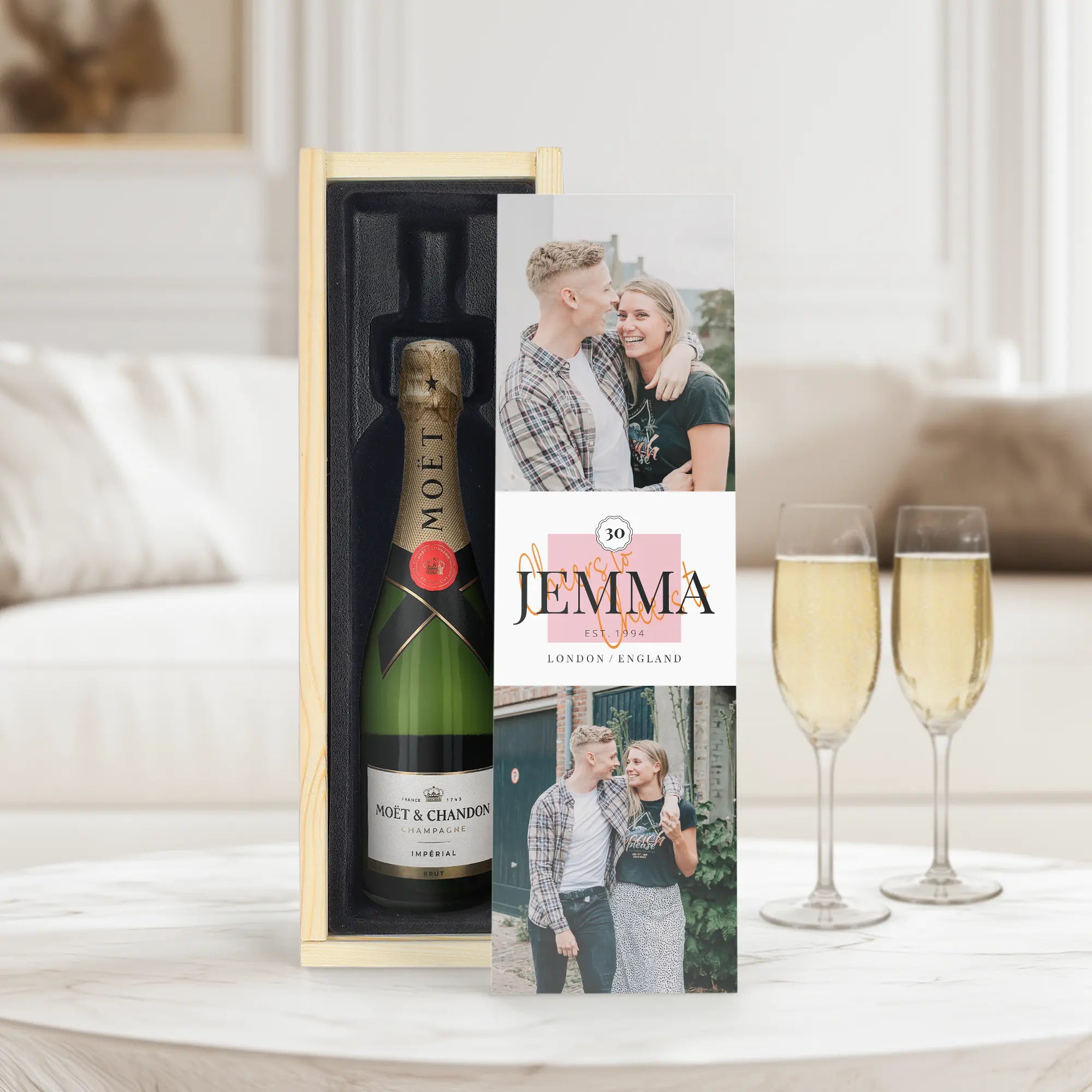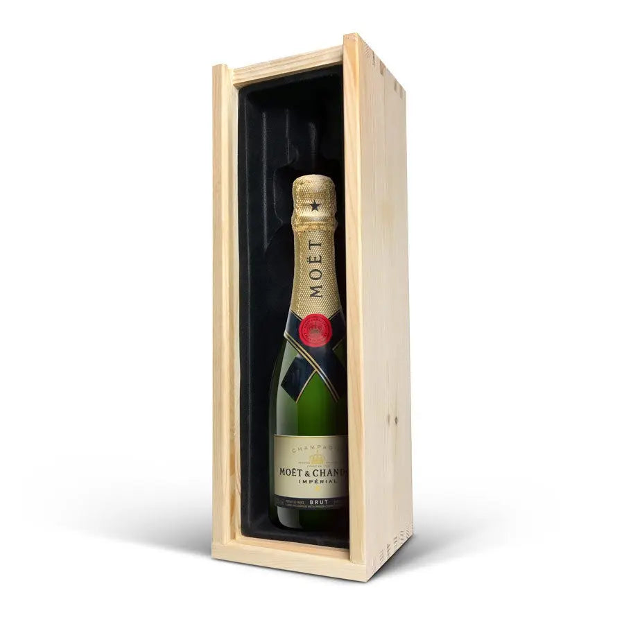 Une délicieuse bouteille de champagne Moët & Chandon dans un coffret en bois gravé à votre nom ou texte. Plusieurs formats disponibles !