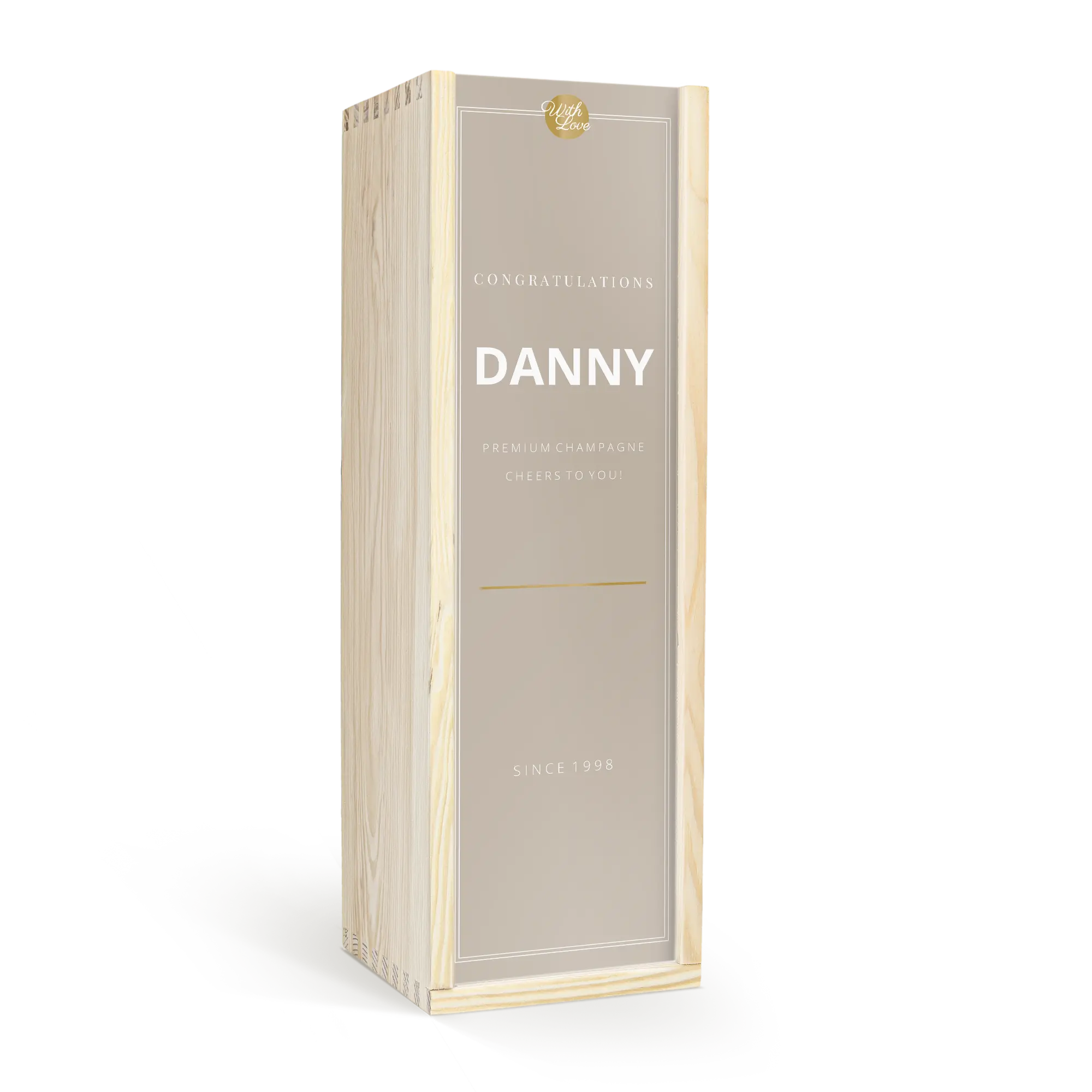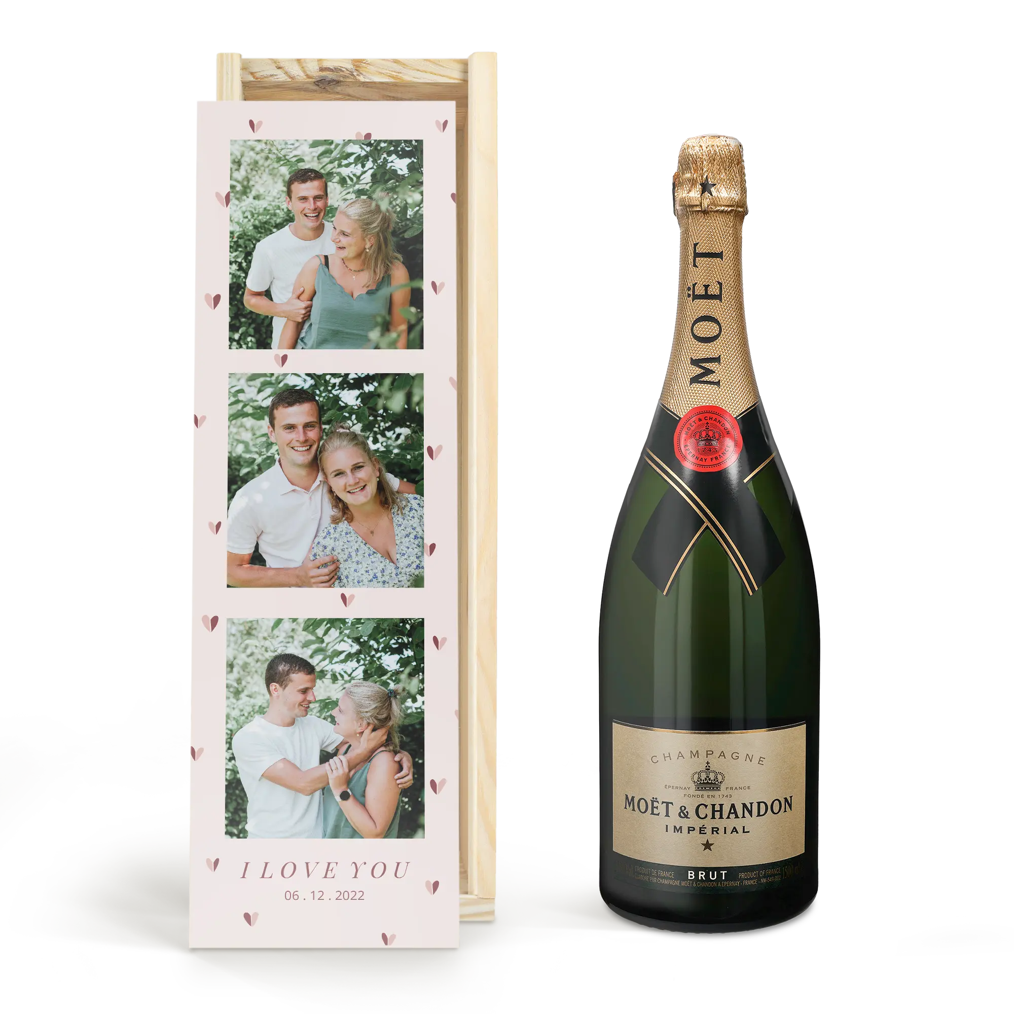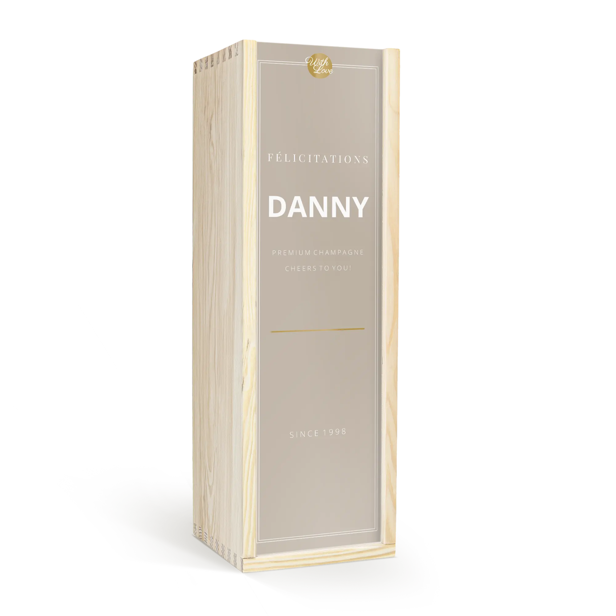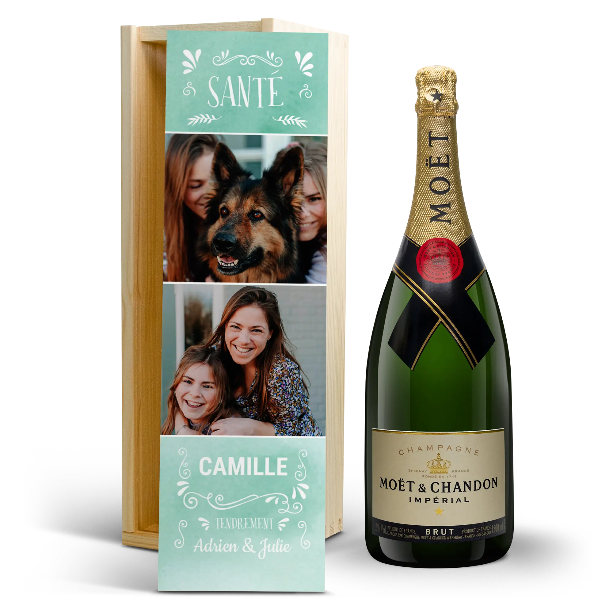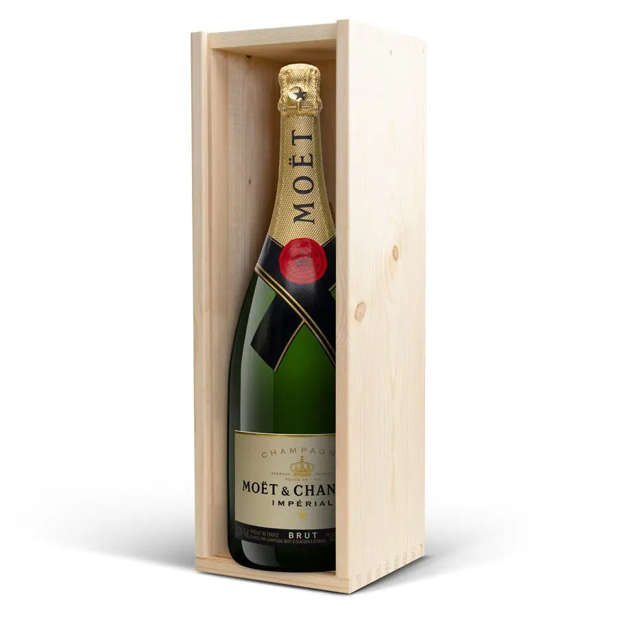 Une délicieuse bouteille de véritable champagne Moët & Chandon dans un coffret en bois personnalisé avec votre nom ou un texte. Plusieurs formats disponibles !