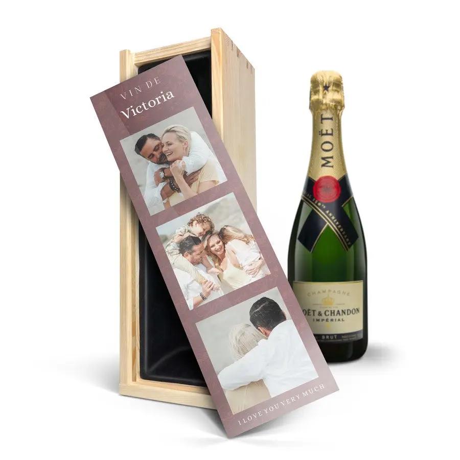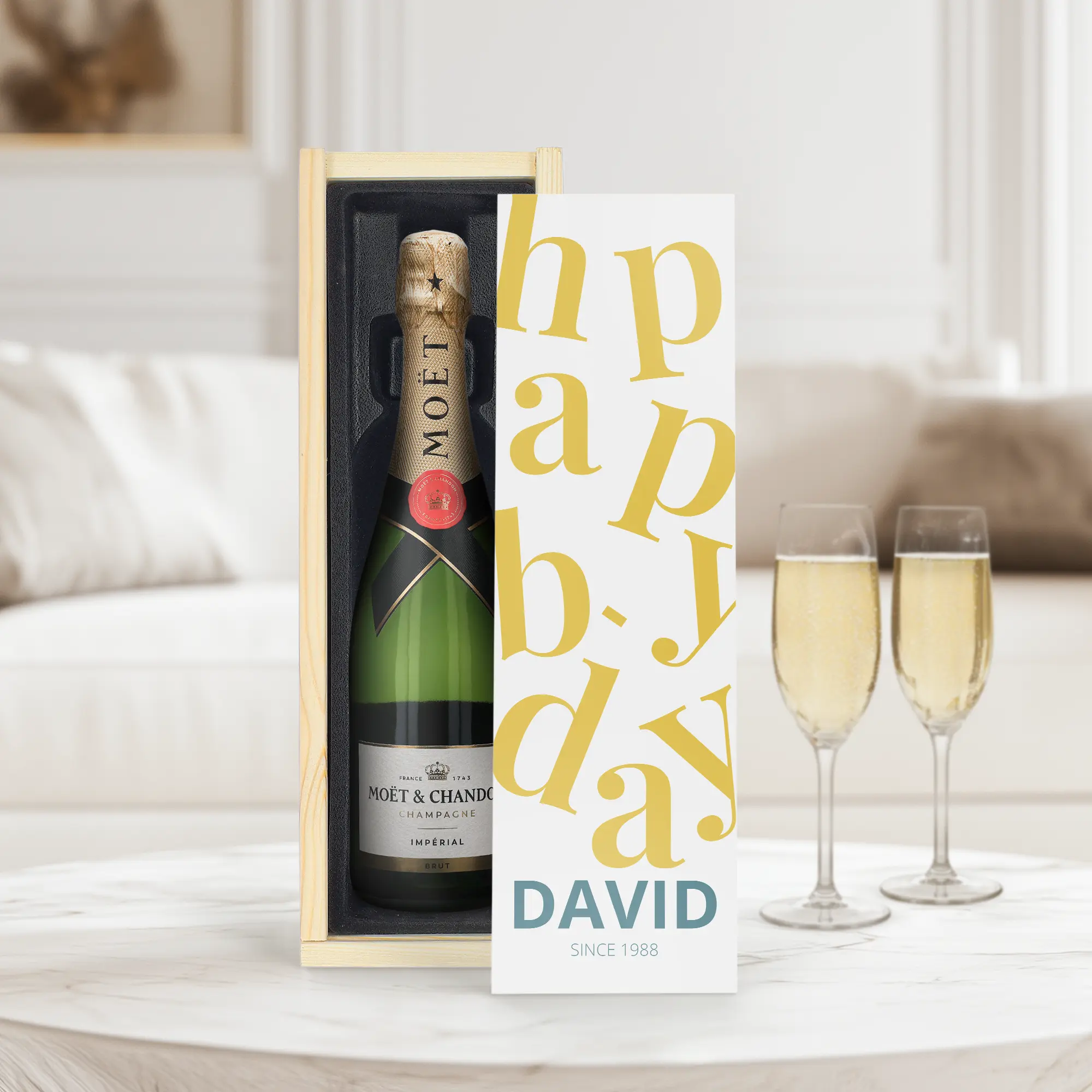 Une délicieuse bouteille de champagne Moët & Chandon dans un coffret en bois gravé de votre nom ou texte. Plusieurs formats de bouteilles disponibles !